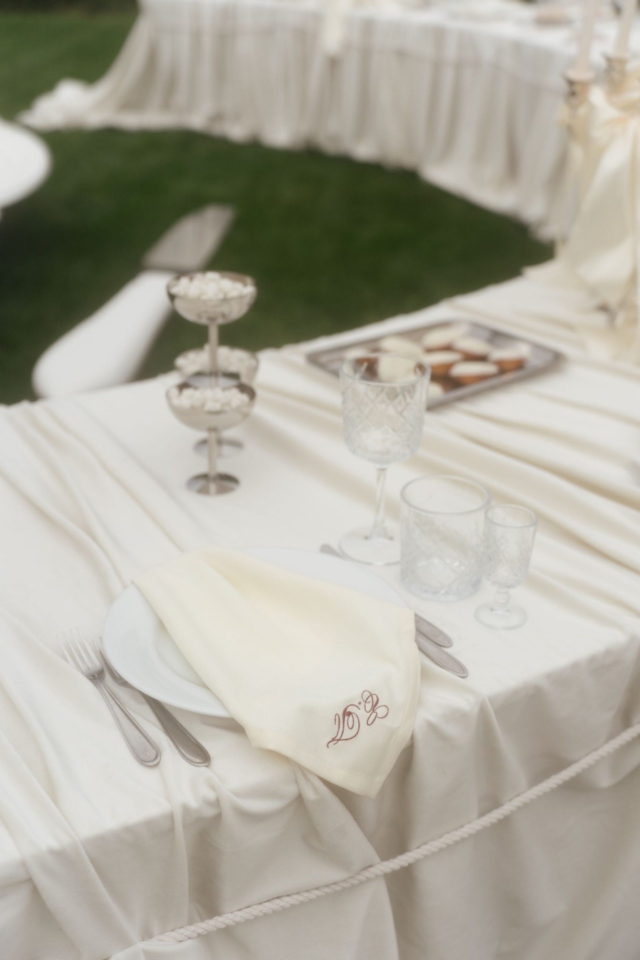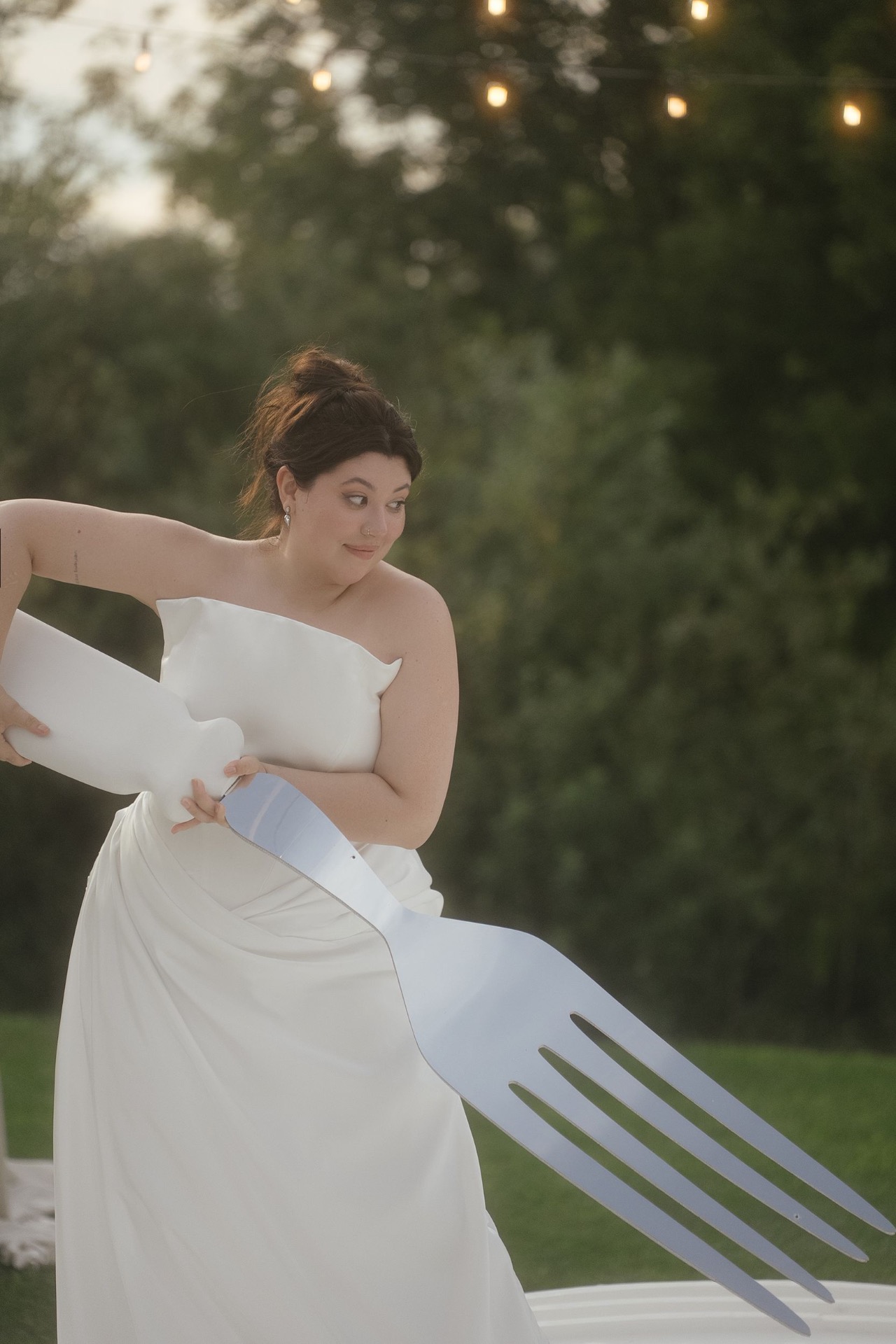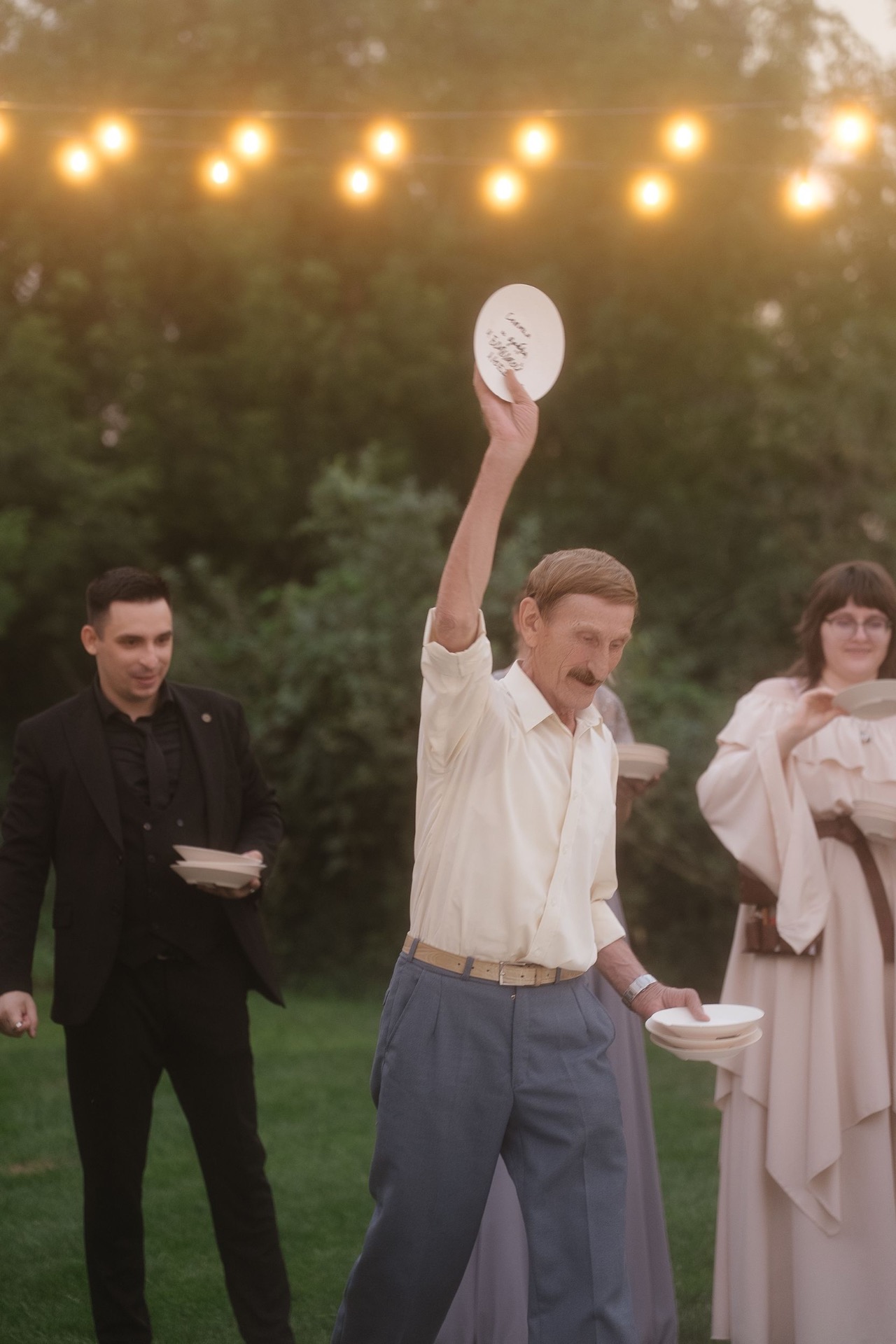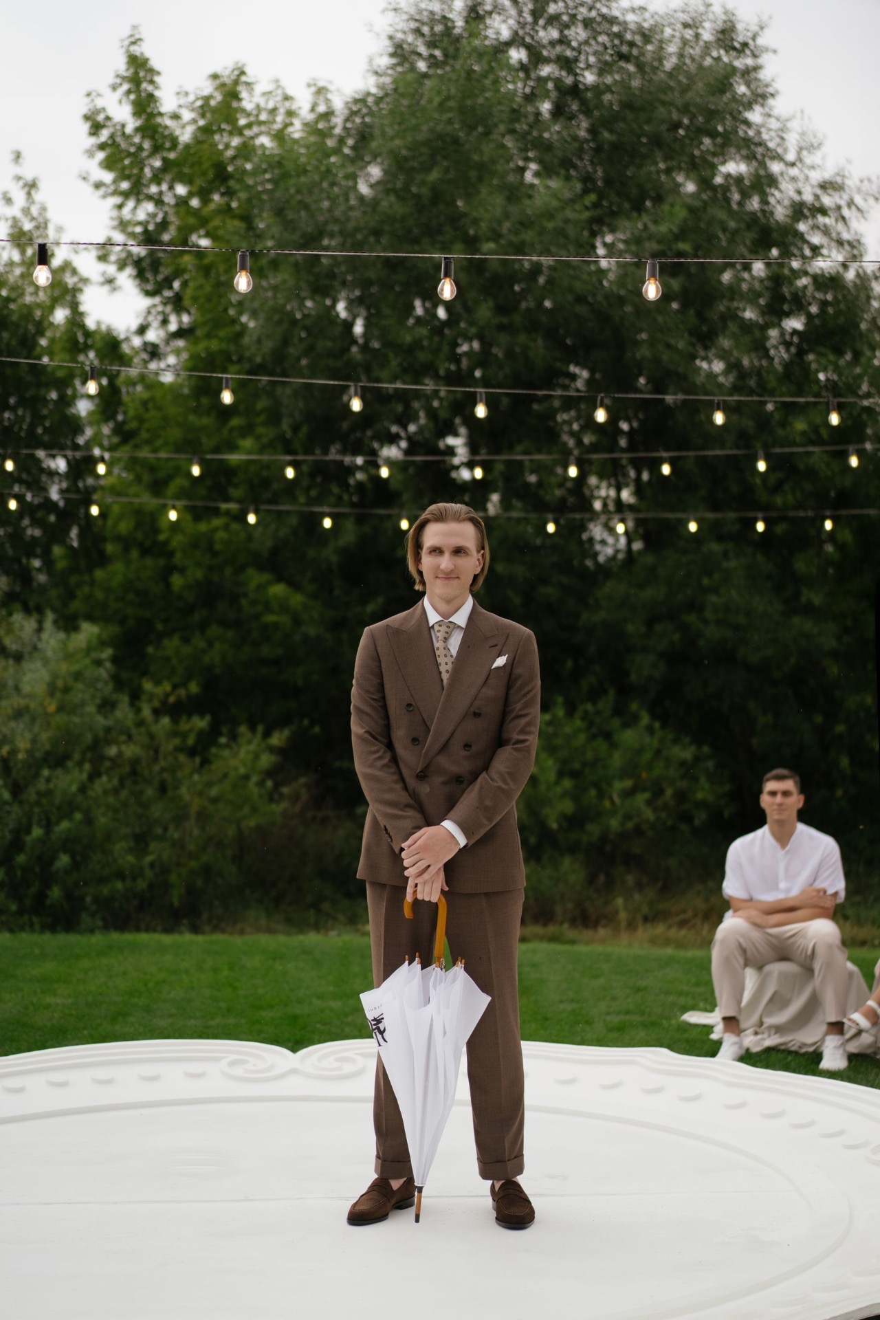 Всё располагалось прямо на газоне. В центре — зона церемонии в виде огромной тарелки с серебряными приборами. Сама церемония, первый танец, подача торта — всё происходило прямо на тарелке. Вокруг полукругом расположились столы гостей, а над газоном протянулись ретро-лампочки.