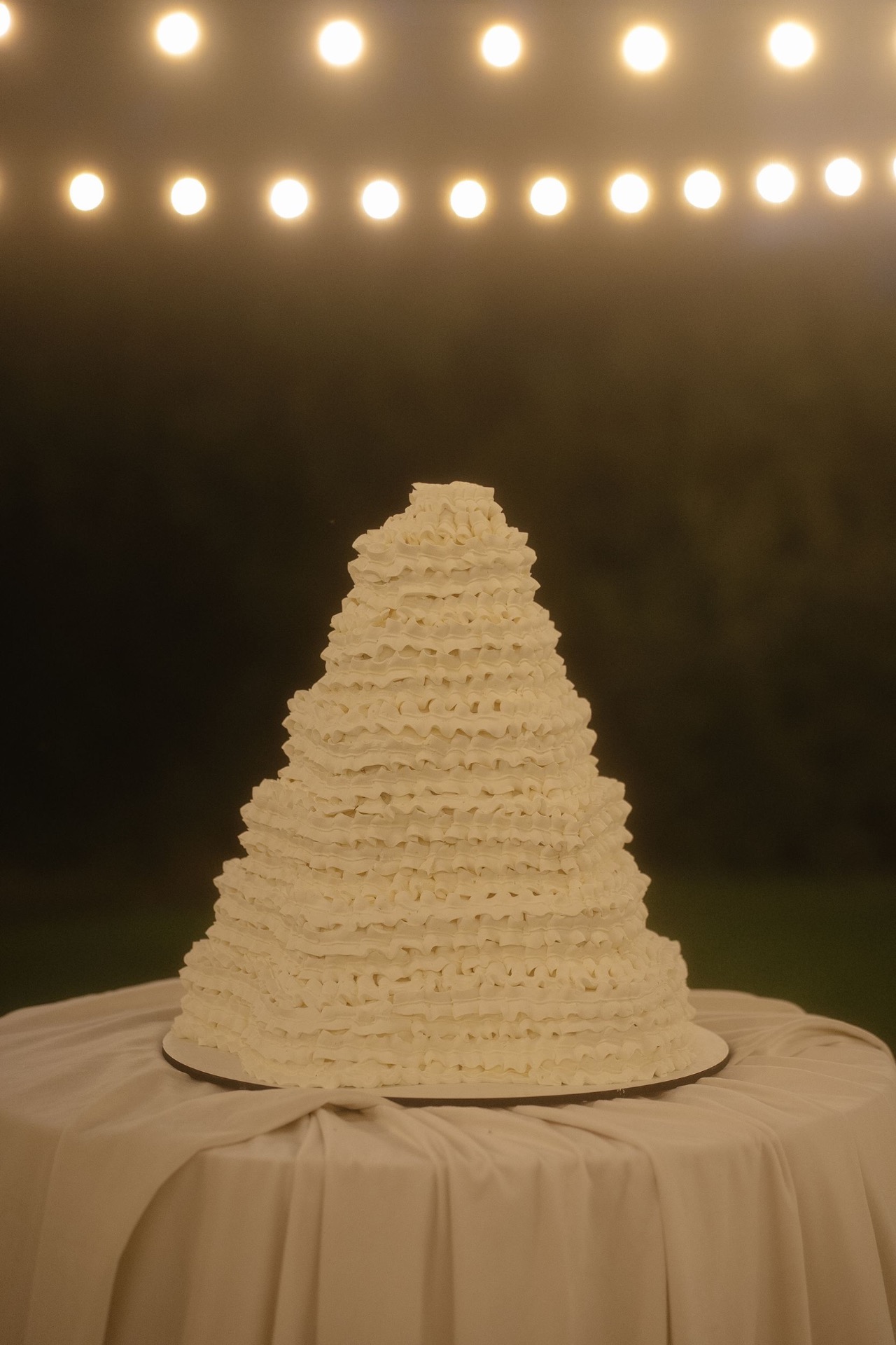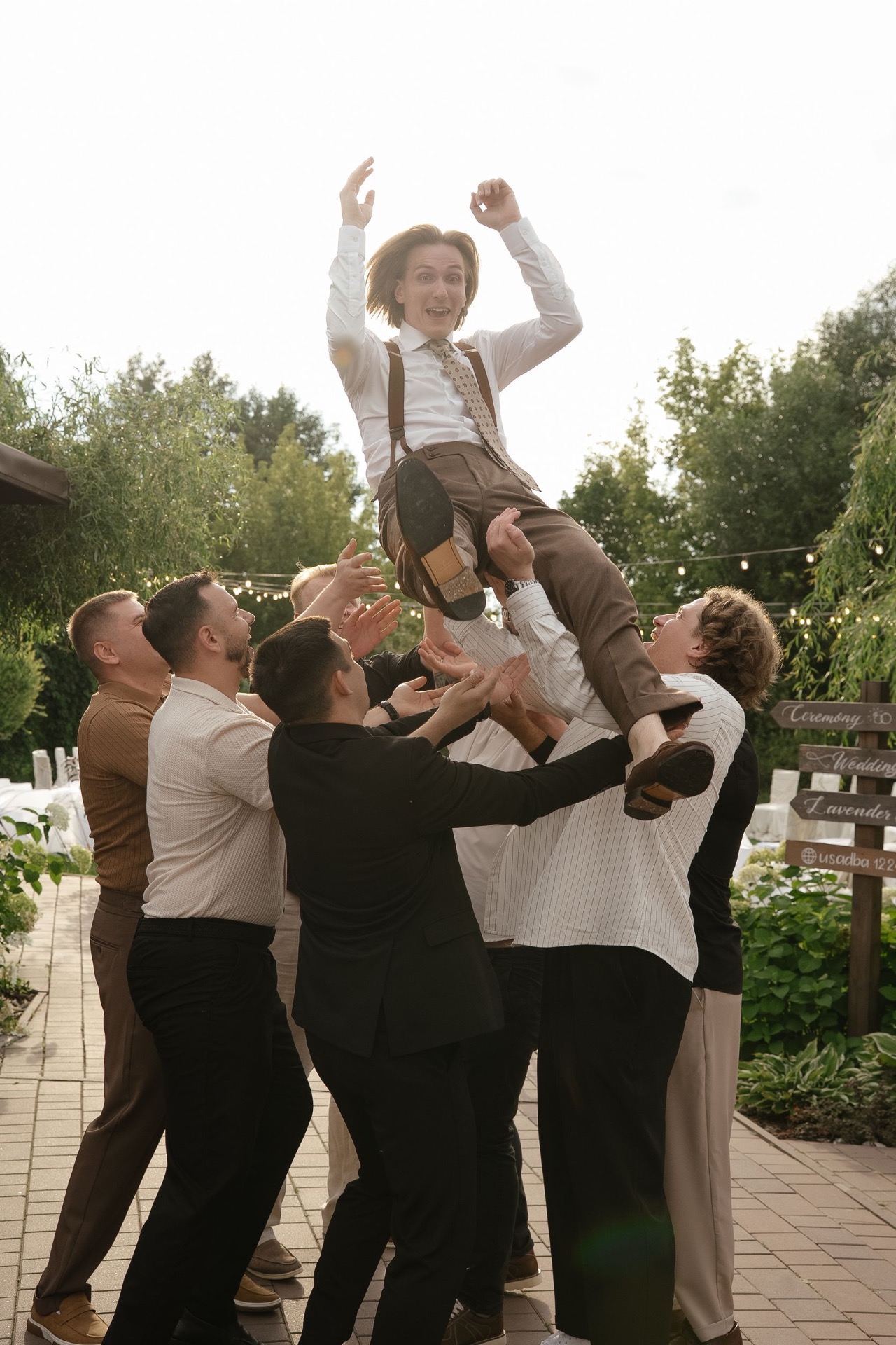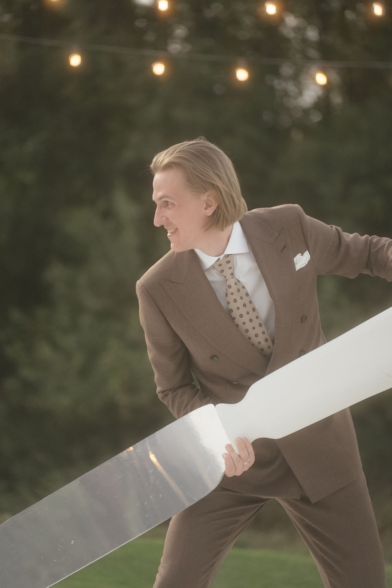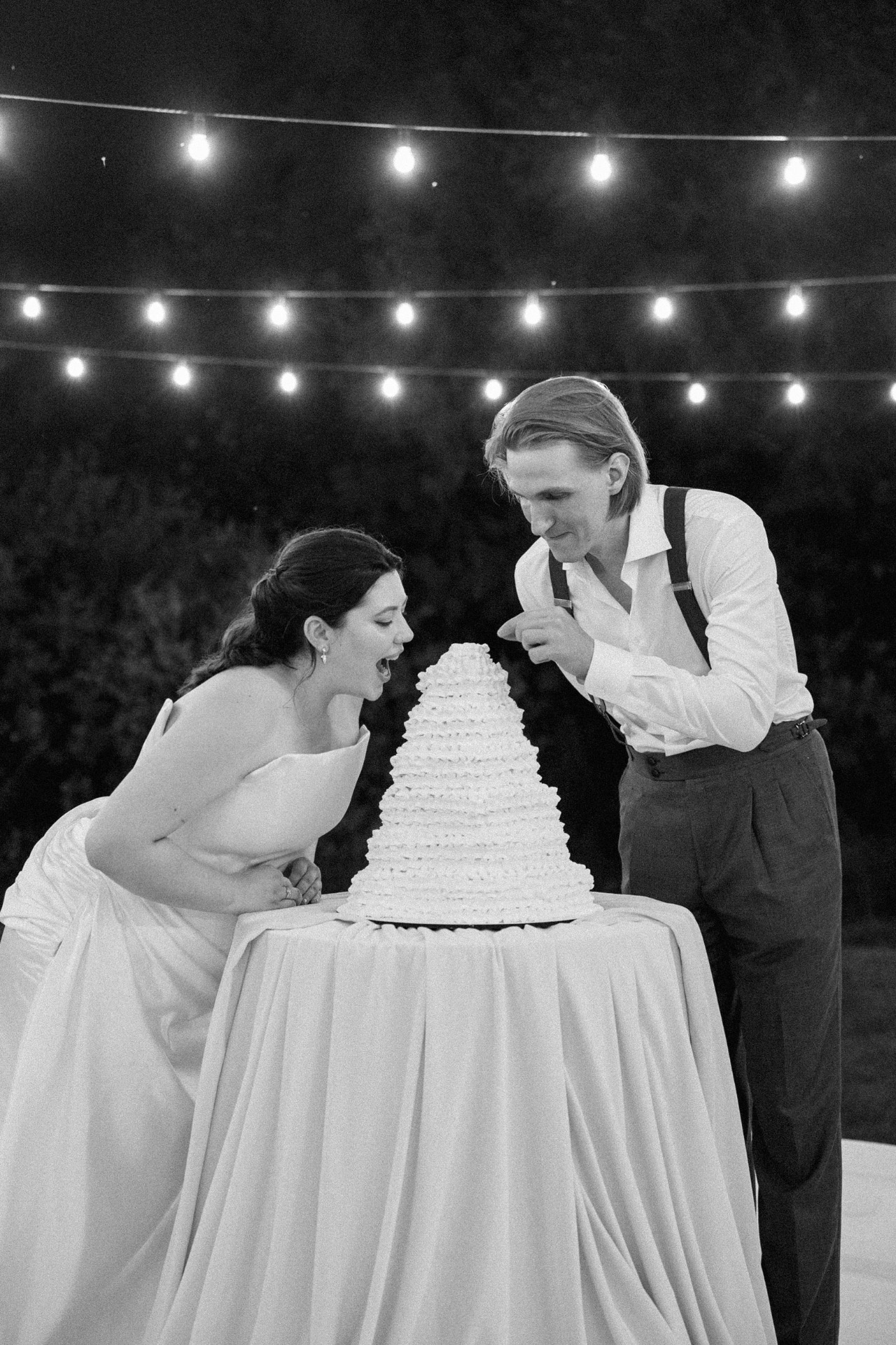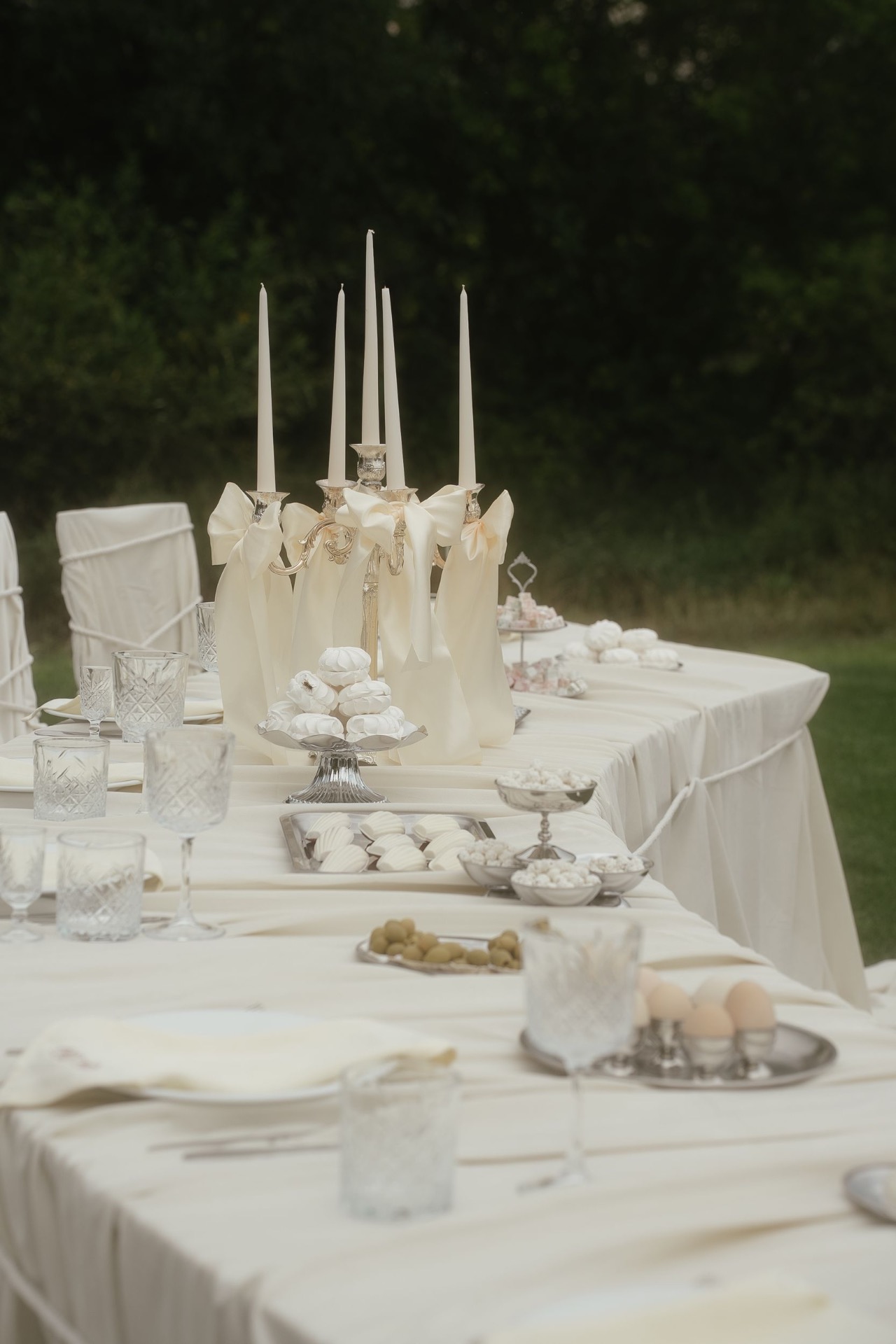 Всё располагалось прямо на газоне. В центре — зона церемонии в виде огромной тарелки с серебряными приборами. Сама церемония, первый танец, подача торта — всё происходило прямо на тарелке. Вокруг полукругом расположились столы гостей, а над газоном протянулись ретро-лампочки.