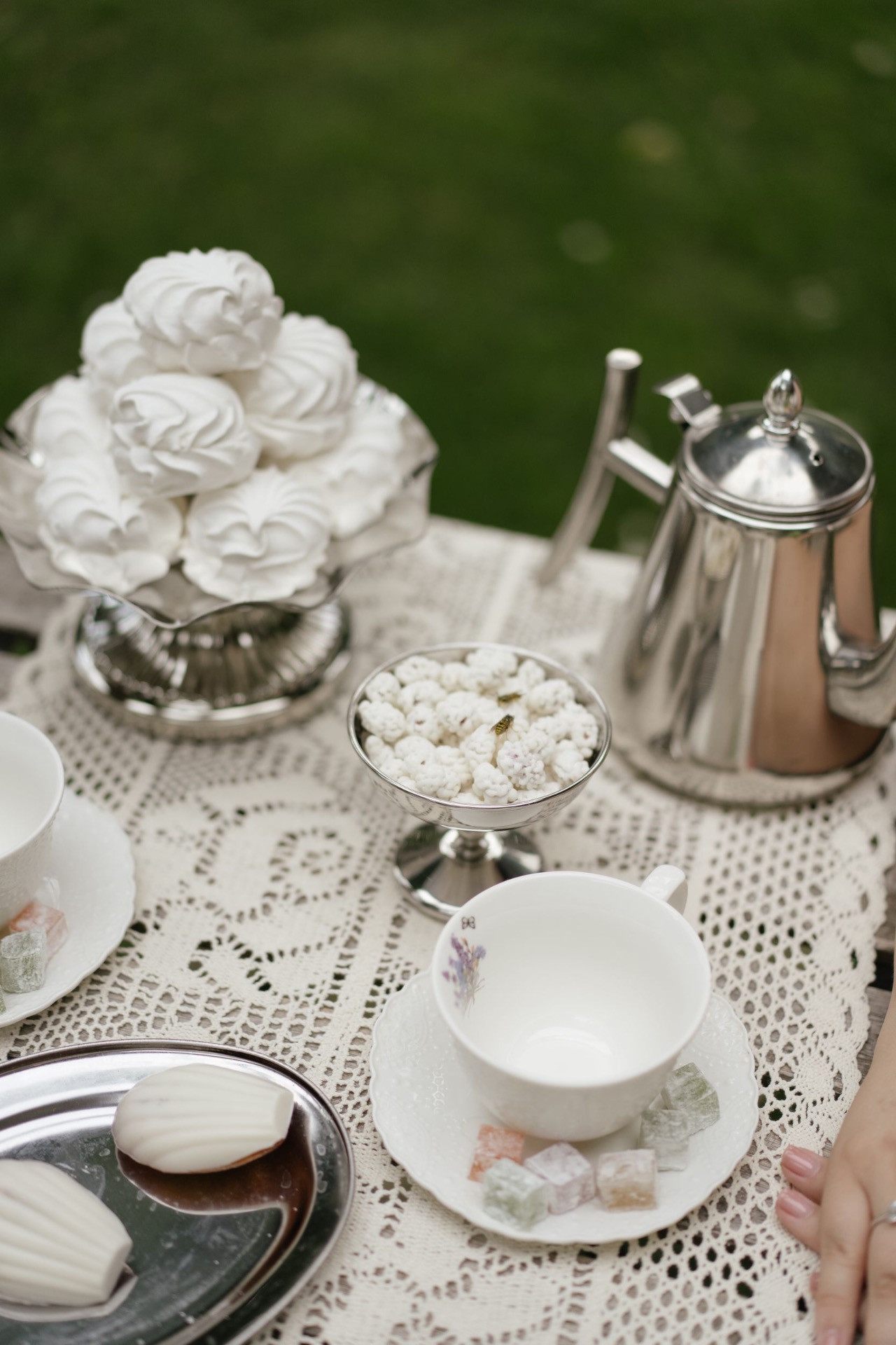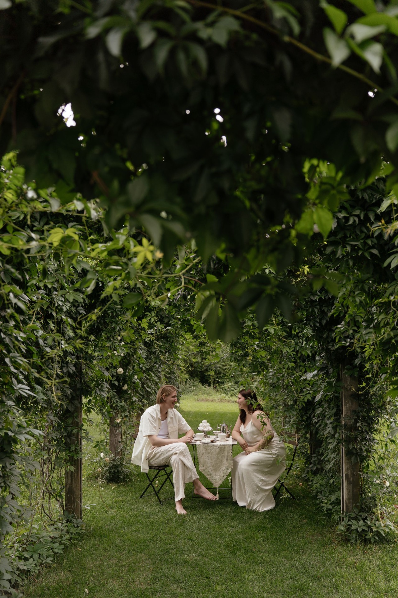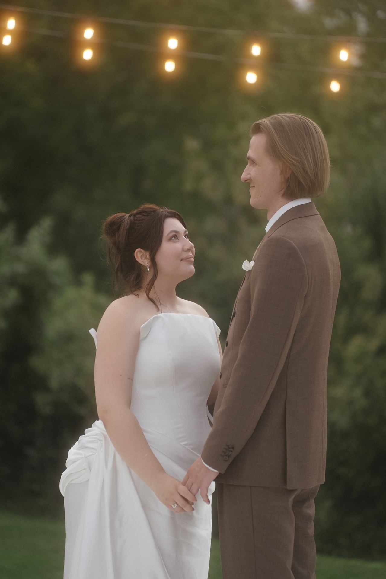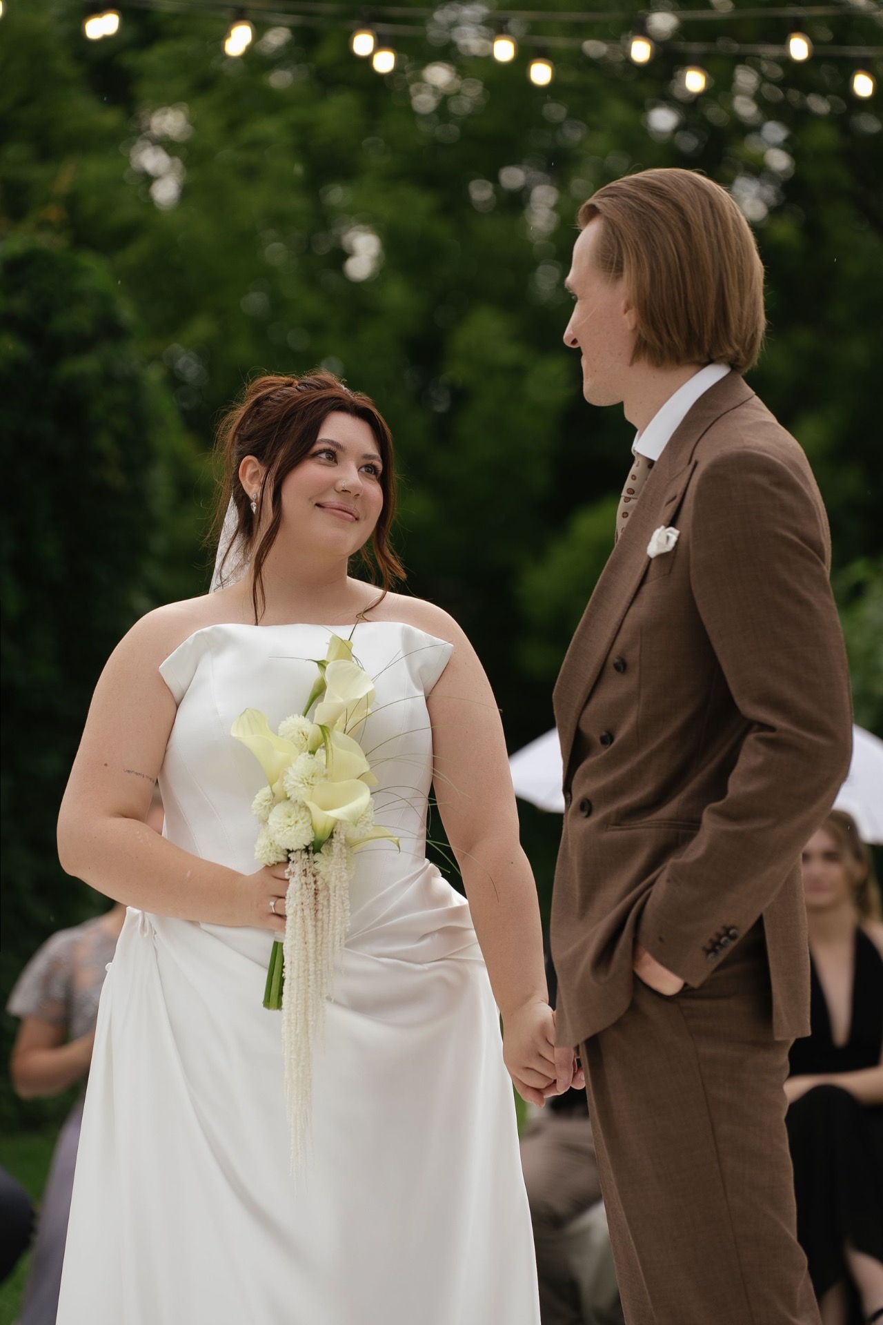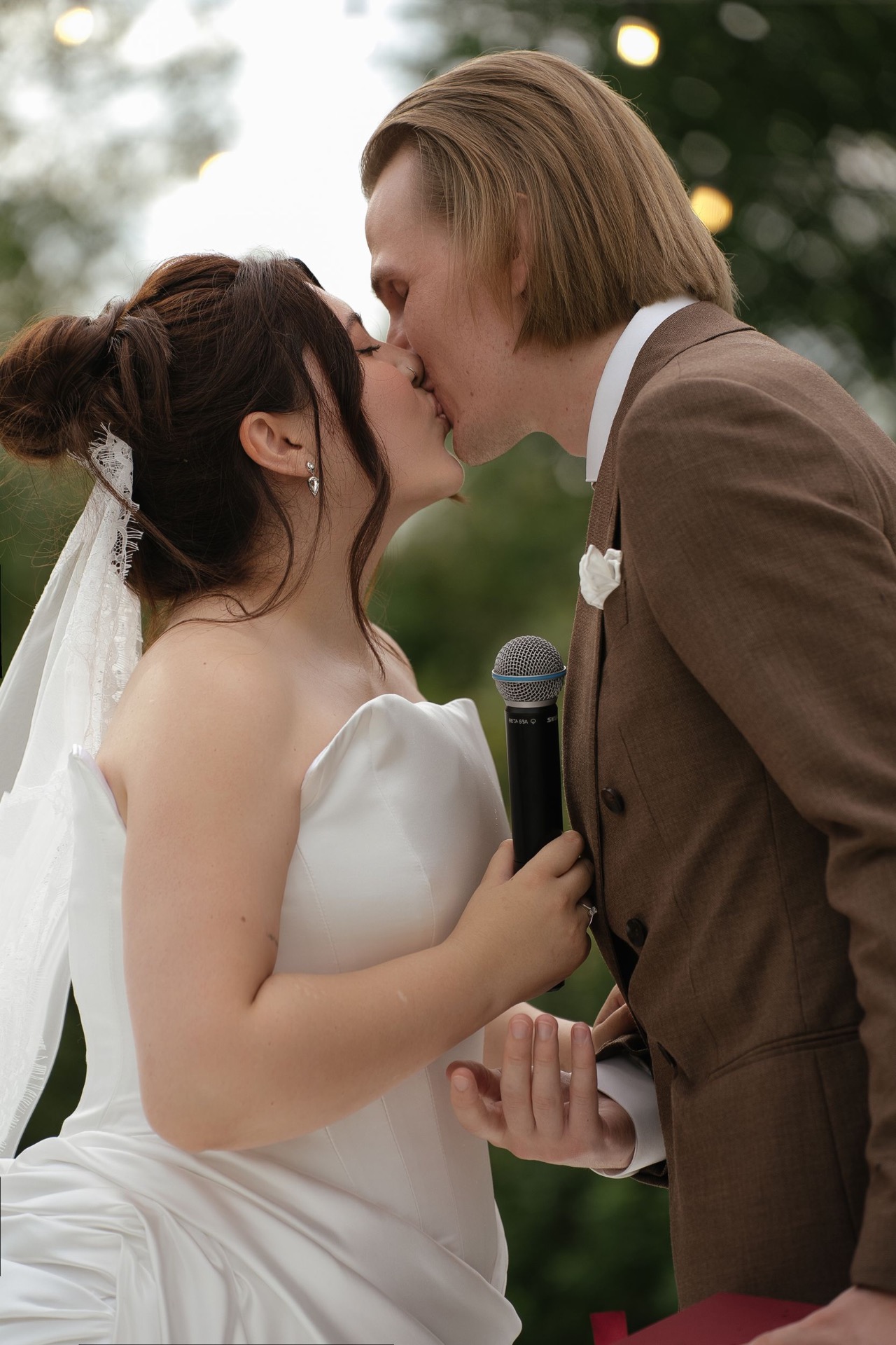 Всё располагалось прямо на газоне. В центре — зона церемонии в виде огромной тарелки с серебряными приборами. Сама церемония, первый танец, подача торта — всё происходило прямо на тарелке. Вокруг полукругом расположились столы гостей, а над газоном протянулись ретро-лампочки.