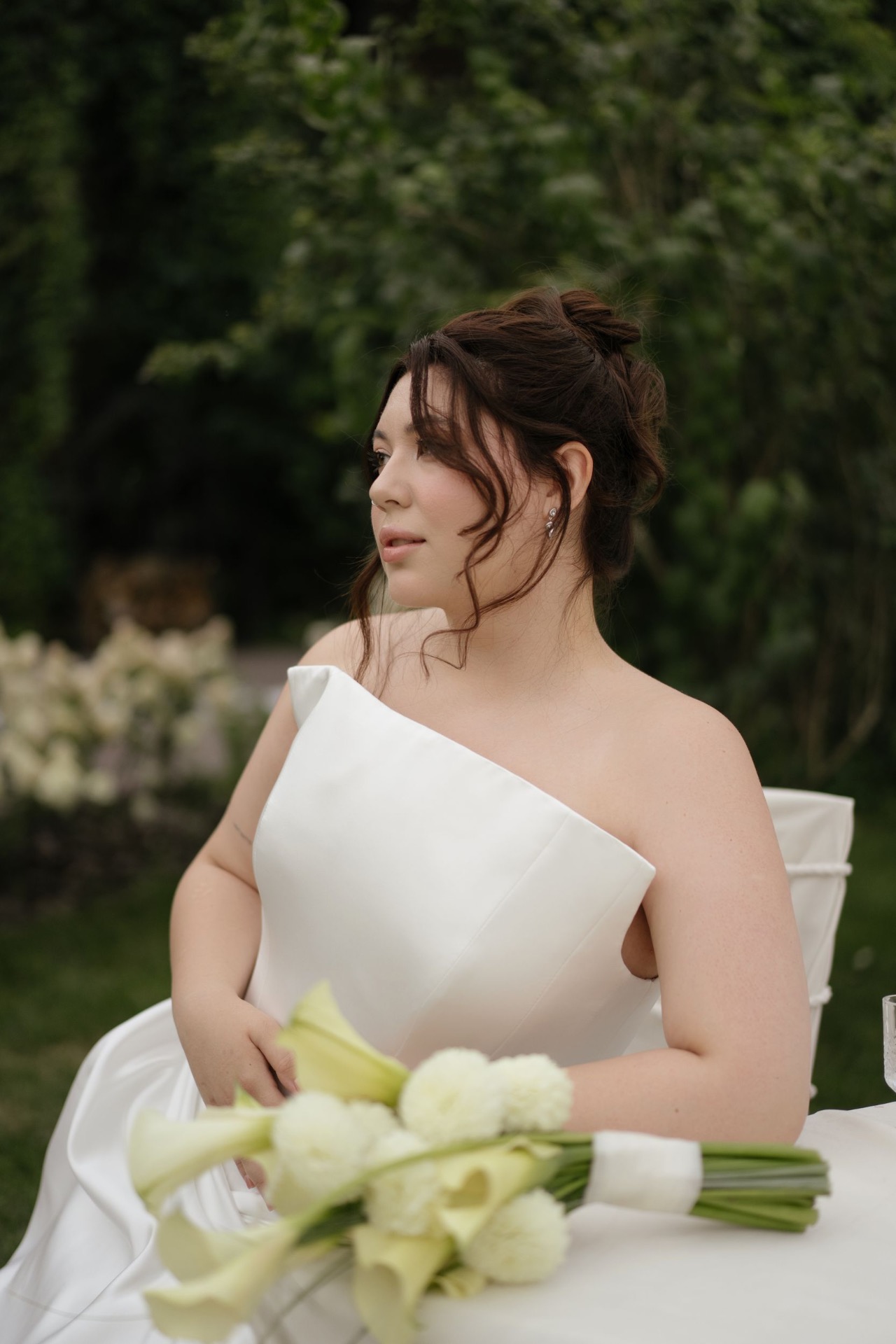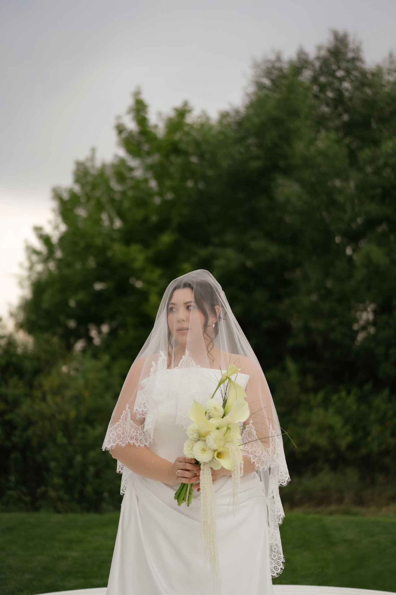 Для создания элегантного образа мы выбрали силуэт fit-and-flare. Данная модель чем-то напоминает силуэт «рыбка», но здесь расширение низа платья начинается от середины бедра. Эта модель визуально вытягивает рост и стройнит. Мы подчеркнули талию с помощью корсета и драпировки на бёдрах и сделали актуальную прямую линию декольте. Изящным дополнением к нему стала кружевная фата-испанка.