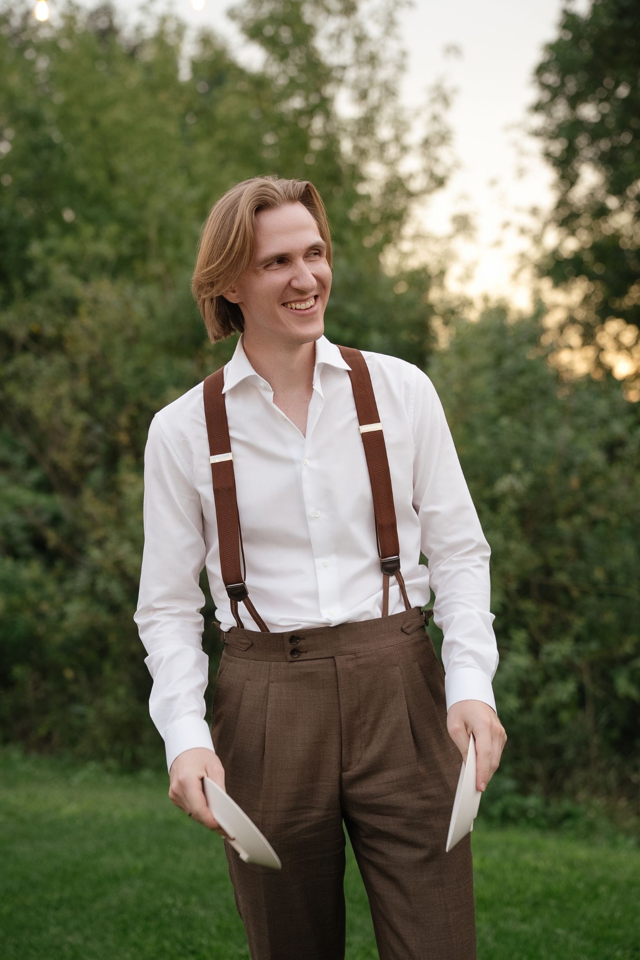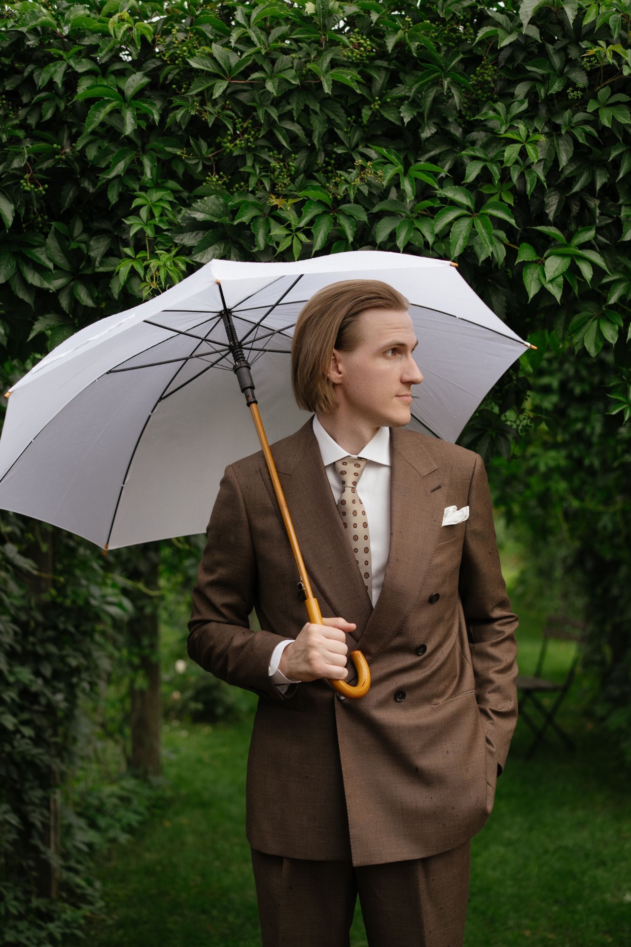 Серёжа свой костюм тоже шил на заказ, потому что найти готовый на такого высокого красавца было сложно. Серёжа вкусил все прелести этого процесса. Подбор всех деталей, начиная от цвета подошвы и заканчивая выбором пуговиц и вышивкой на рукаве, был исключительно под контролем стилиста и самого Серёжи. Мы хотели, чтобы в его наряде присутствовали бежевые, коричневые и зелёные оттенки. По фасону сначала смотрели разные варианты, даже оверсайз. Но финальный выбор пал на итальянскую ткань благородного коричневого цвета и двубортную модель костюма.