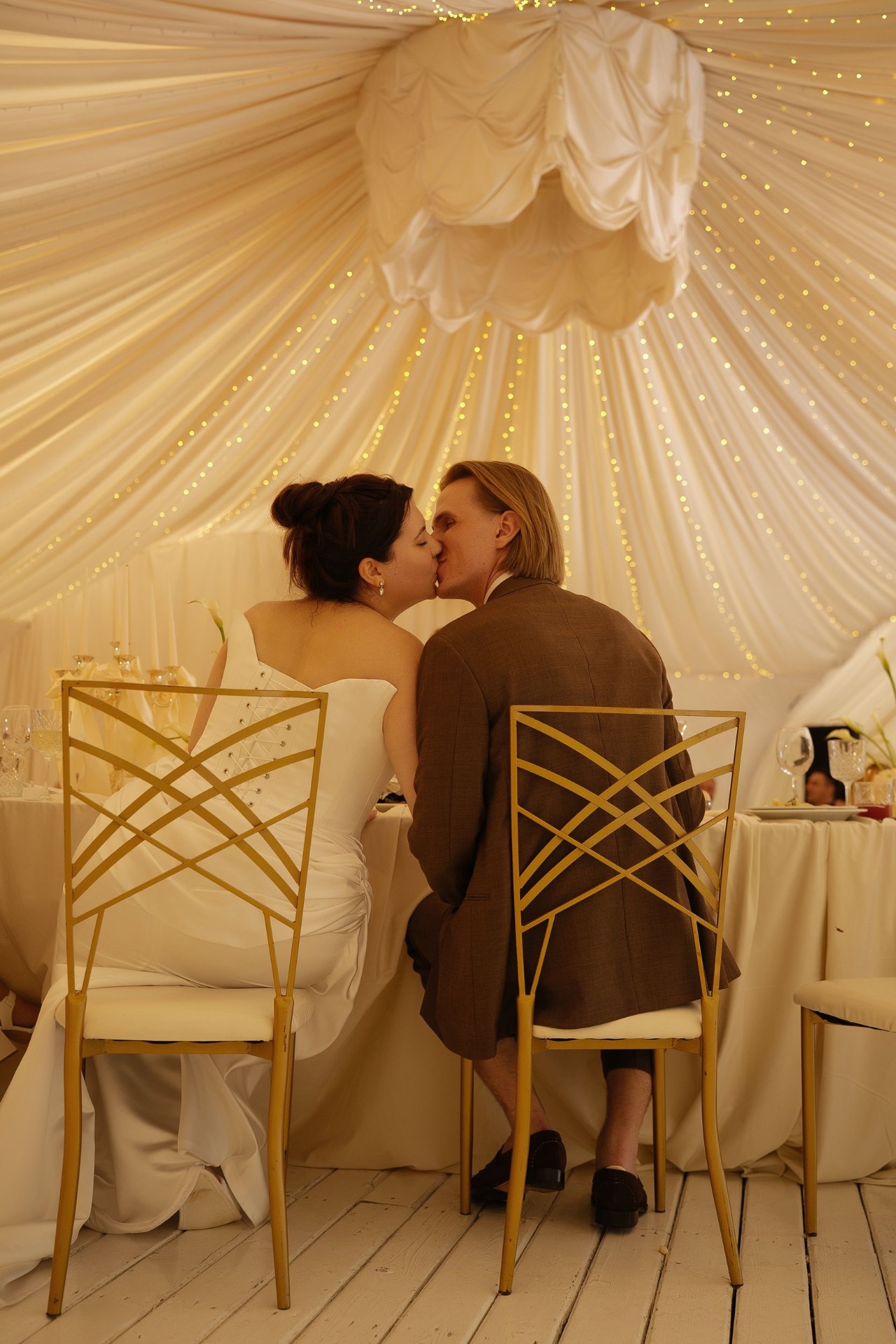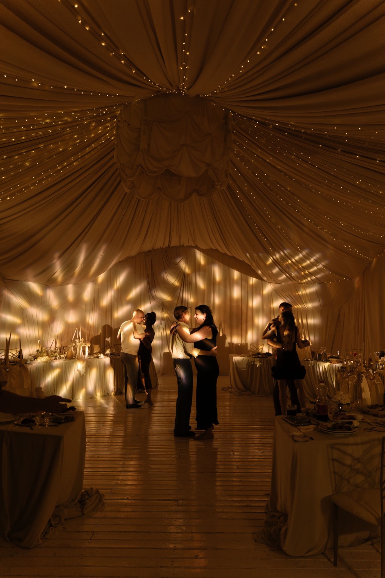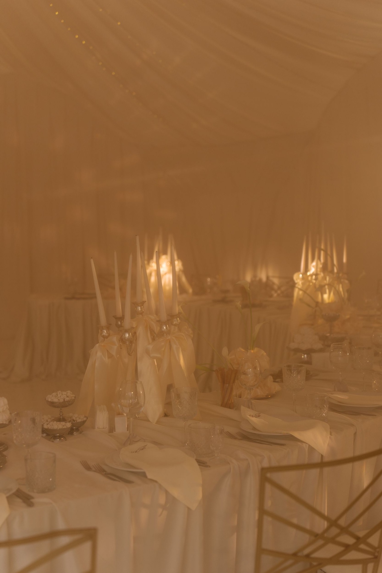 К сожалению, нас всё-таки подвела погода. И после утренней съёмки столы гостей были перенесены в шатёр. Но это не испортило атмосферы вечера. На церемонию и остальные знаковые моменты, а также танцы мы выходили на тарелку. А сам шатёр прекрасно сочетался с эстетикой наших столов.