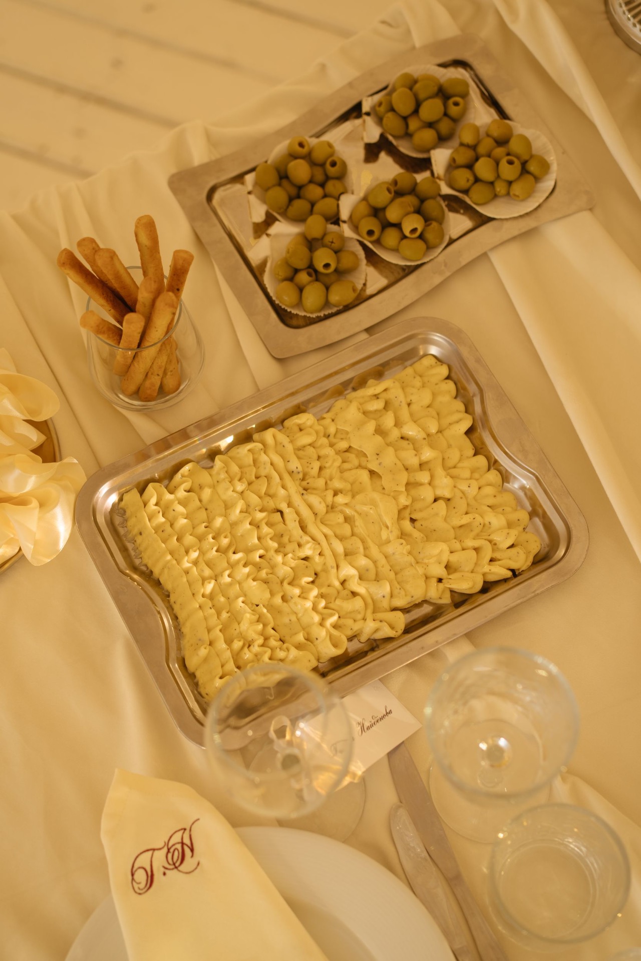 Для каждого гостя мы подготовили небольшой сюрприз — на салфетках, лежащих на столах, были вышиты их инициалы. И можно было забрать себе на память этот маленький сувенир.