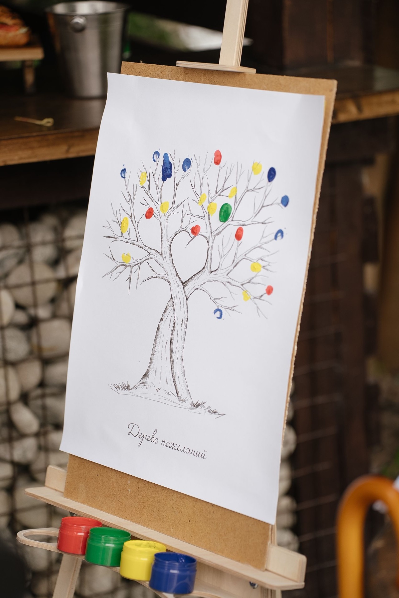 В качестве развлечений на велкоме, в зоне встречи гостей, мы предусмотрели фотобудку. А ещё предложили гостям раскрасить нам на память панно, оставив на нём свои отпечатки пальцев. Жених тоже присутствовал с гостями, потому что мы решили, что первый раз в свадебных образах увидим друг друга прямо на церемонии. Так что Серёжа отдыхал за нас двоих.