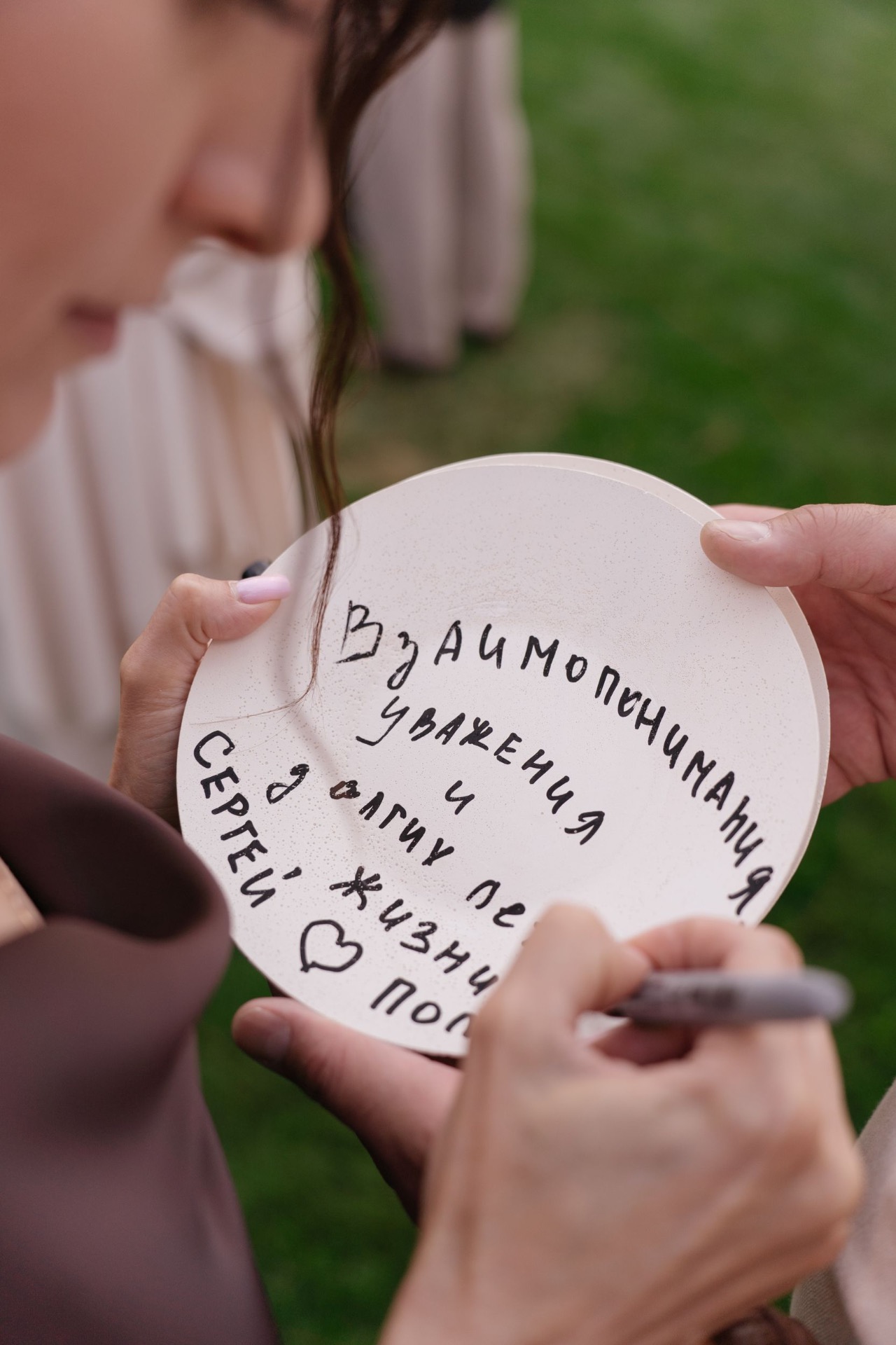Все важные моменты мы проводили на тарелке. И один из самых эффектных — традиция «на счастье». Мы заказали специальные гипсовые тарелки, писали с гостями на них пожелания и разбивали их прямо об большую тарелку церемонии.