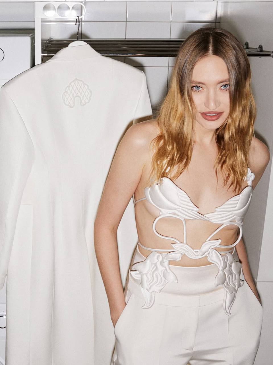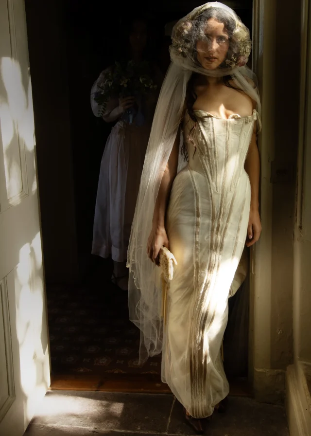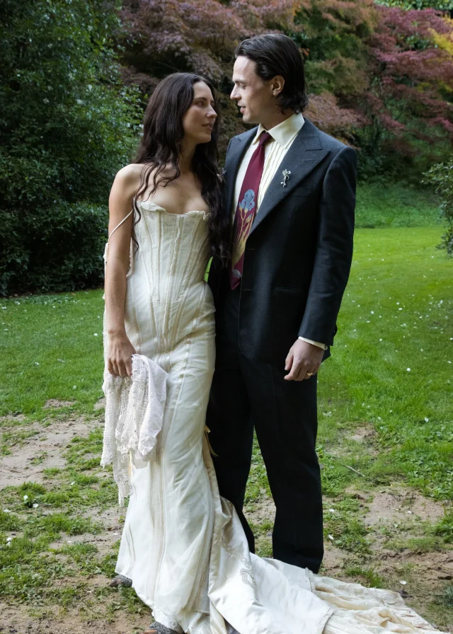 Образ невесты стал истинным вдохновением. Дизайнер Дилара Финдикоглу создала образ для Харли всего за ночь до церемонии — винтажное корсетное платье, расшитое бантами и дополненное туфлями Manolo Blahnik, которые Харли перекрасила вручную.