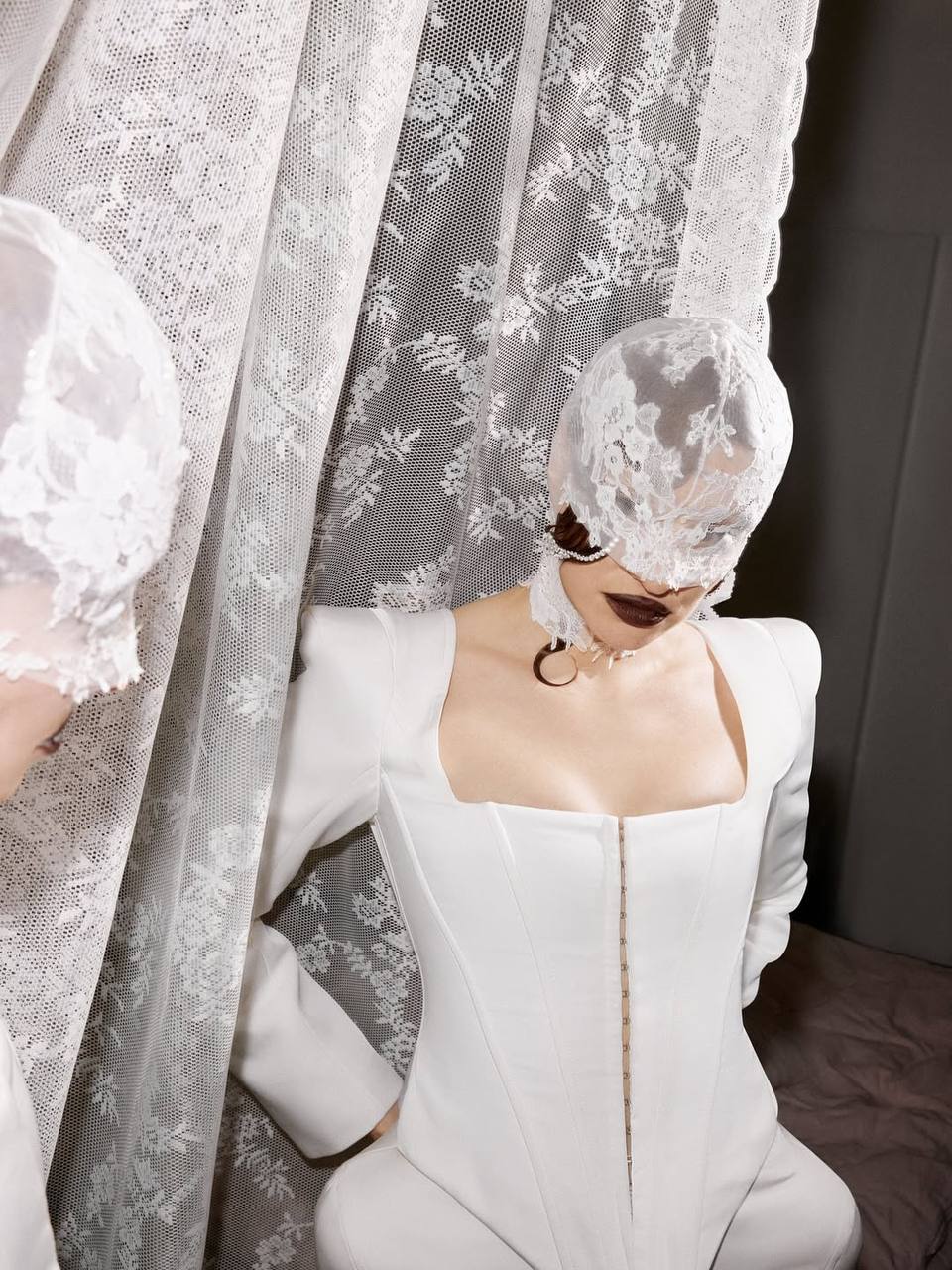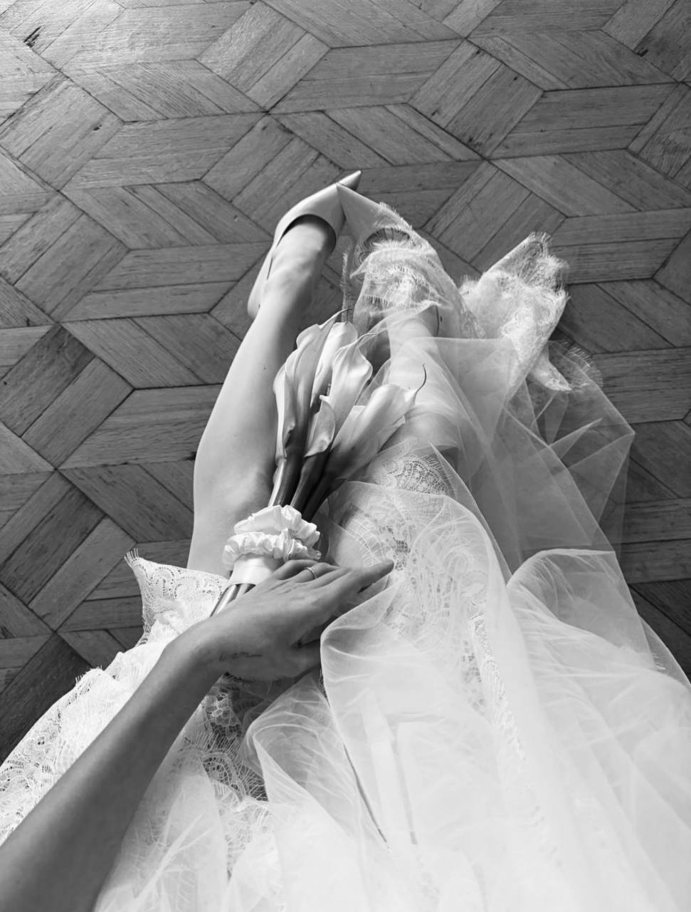 В качестве образа невесты Стелла выбрала винтажное платье из кружева с фатой-испанкой от бренда Rodarte, дополнением к которому стал букет из чёрных калл.