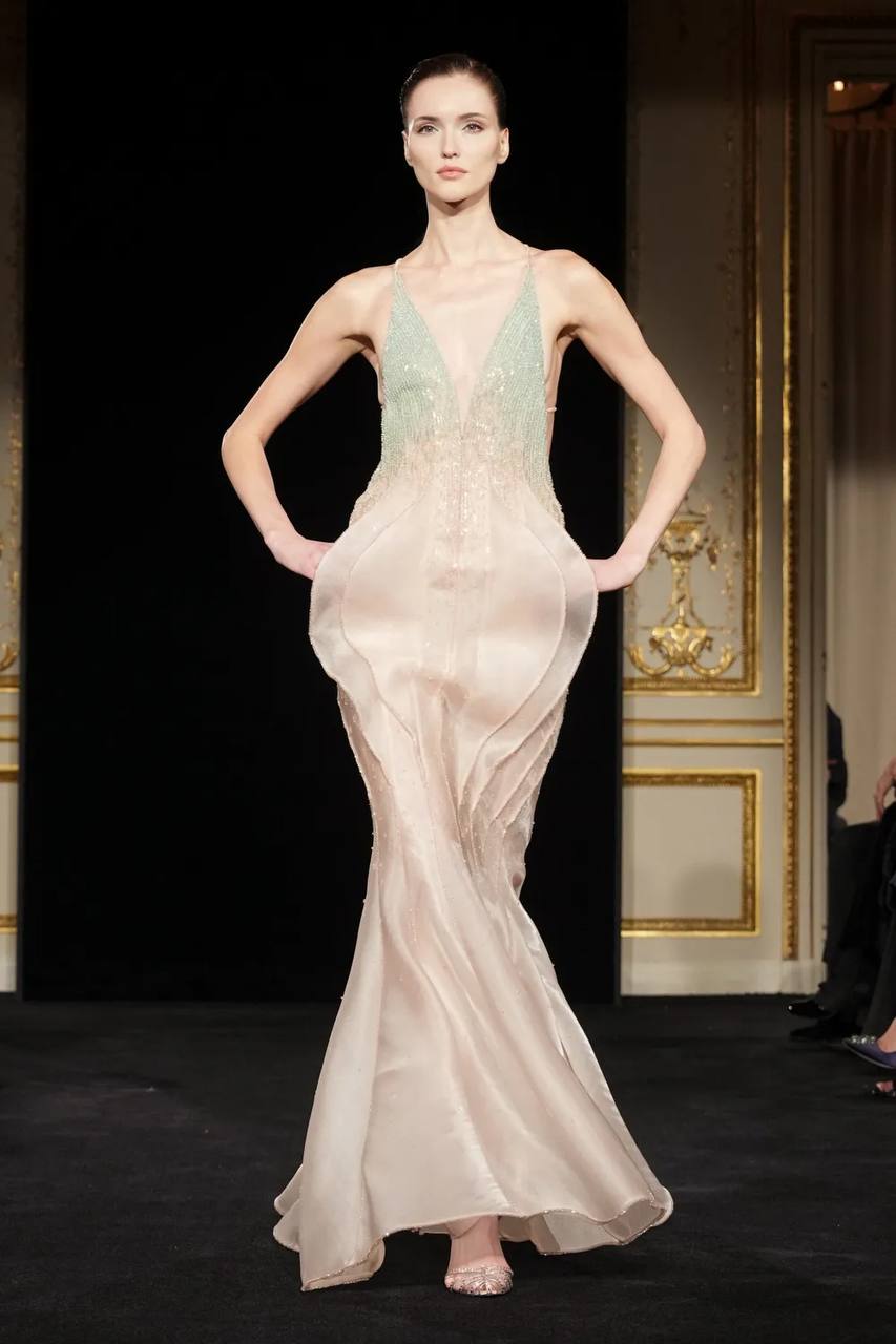 Опираясь на мотивы эпохи Возрождения, дизайнер переосмыслил флорентийские фрески, представив их на корсетах и голливудских силуэтах «песочные часы», украшенных бисером, пайетками, металлическими нитями и кристаллами.