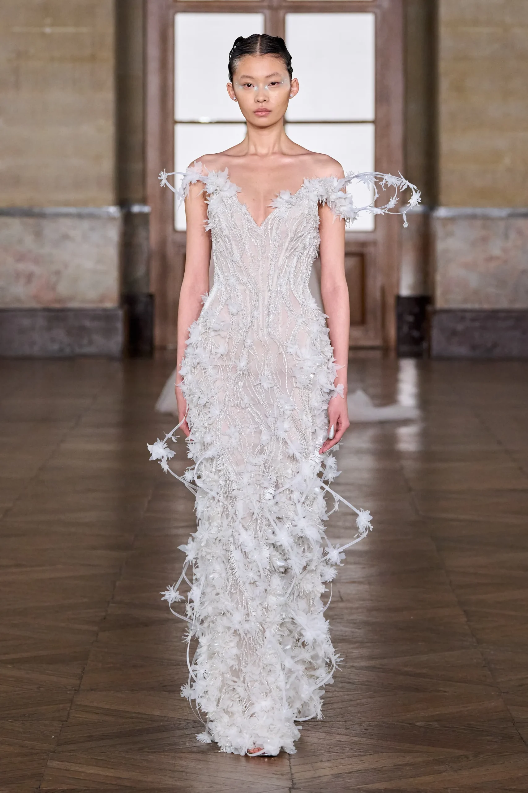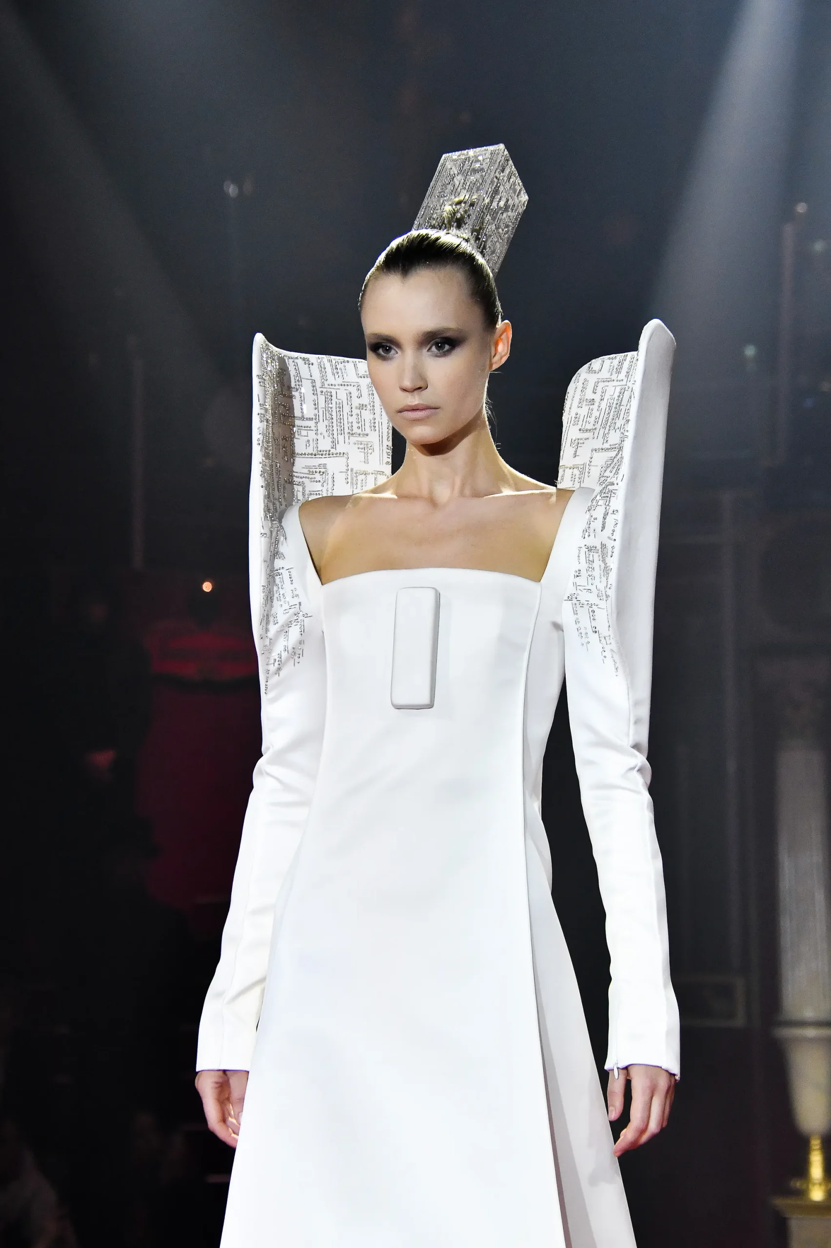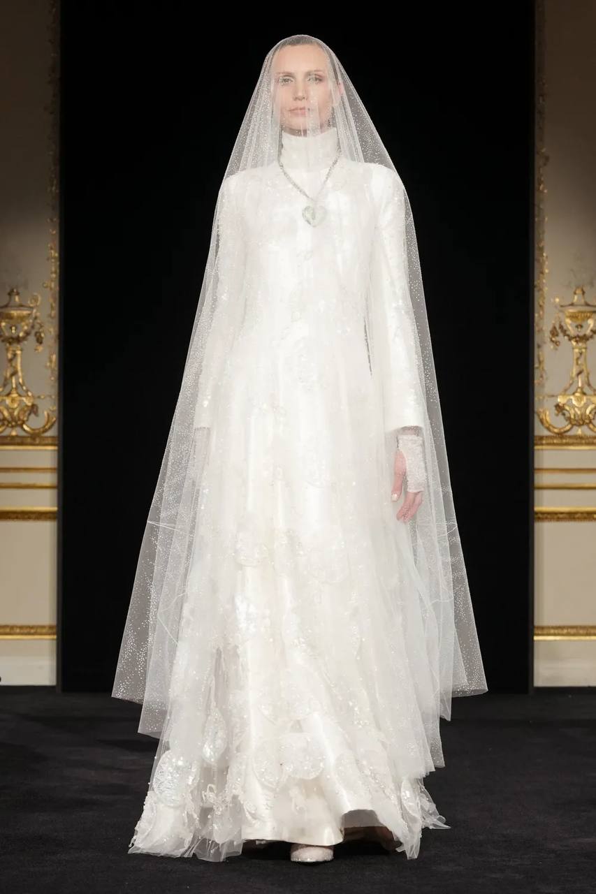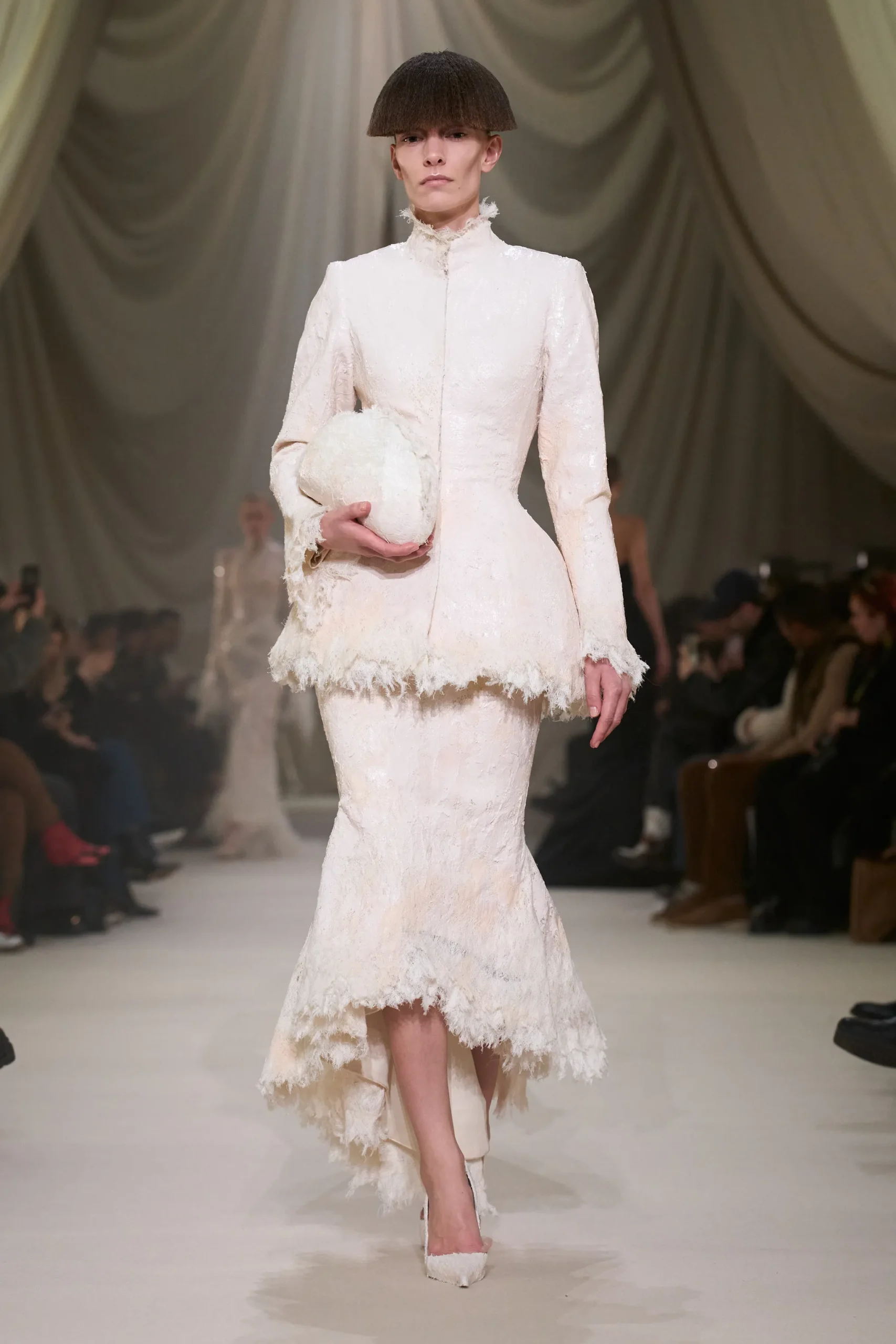 Бренд представил два свадебных образа в кутюрной коллекции. Первый — строгий минимализм цвета слоновой кости, второй — смелый антибрайд образ, дополненный россыпью из страз и короткой фатой.