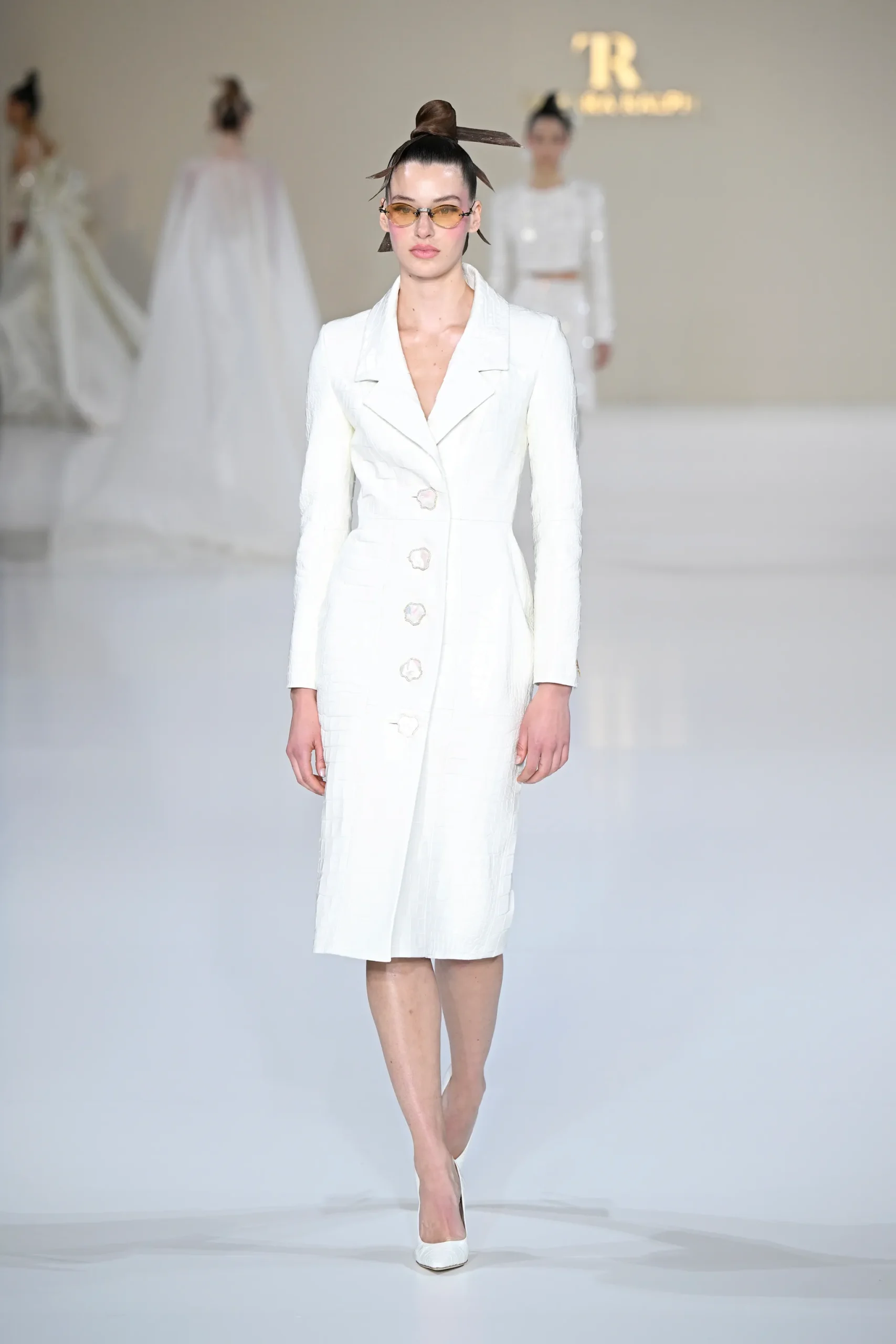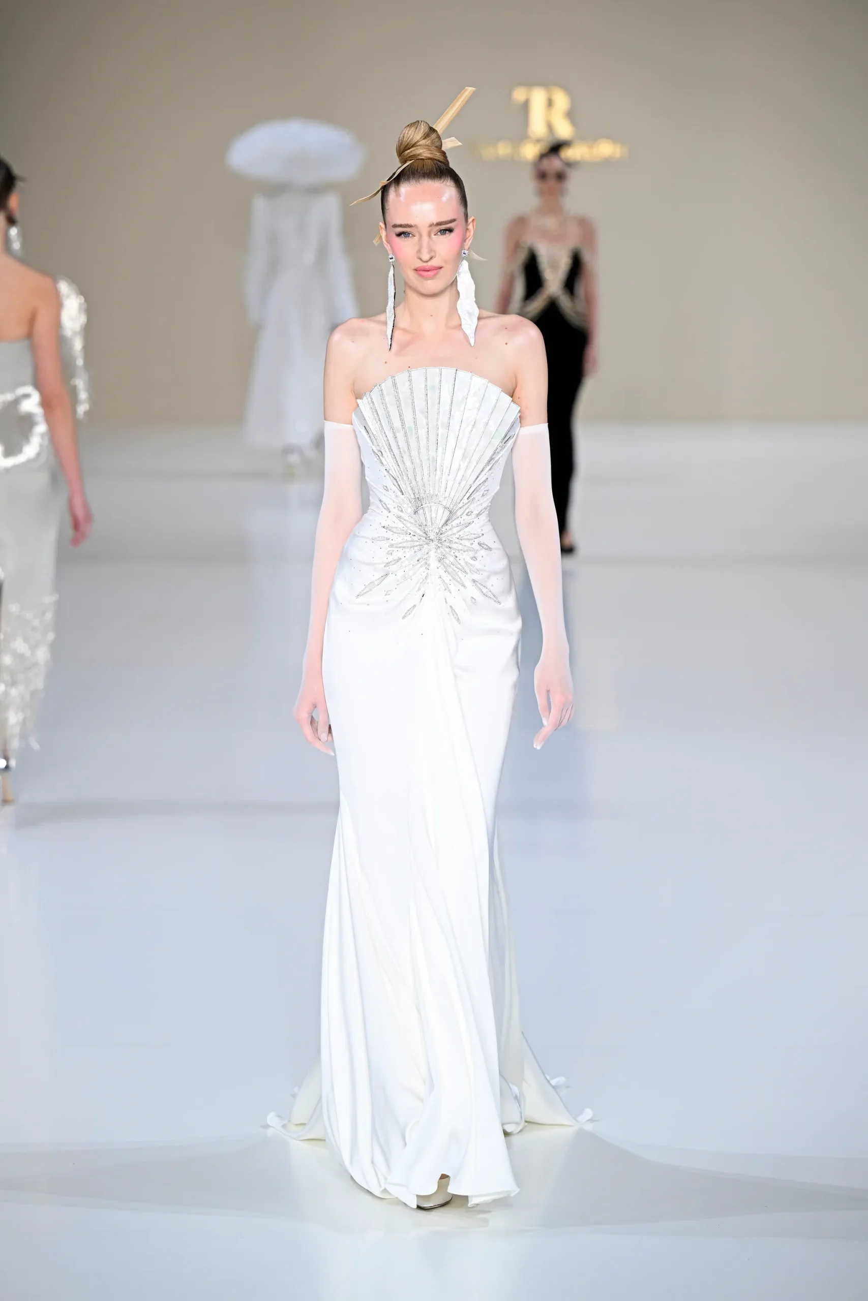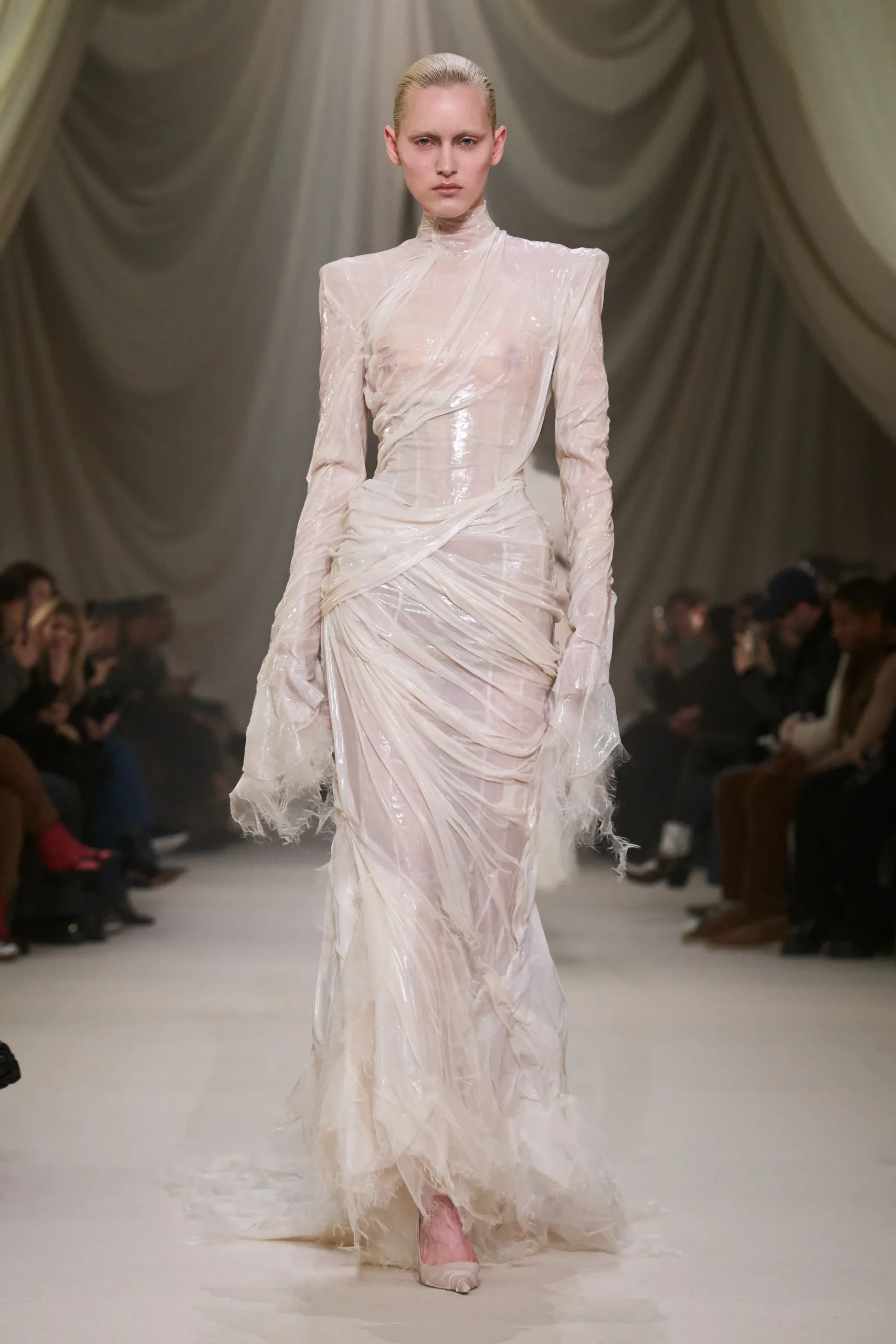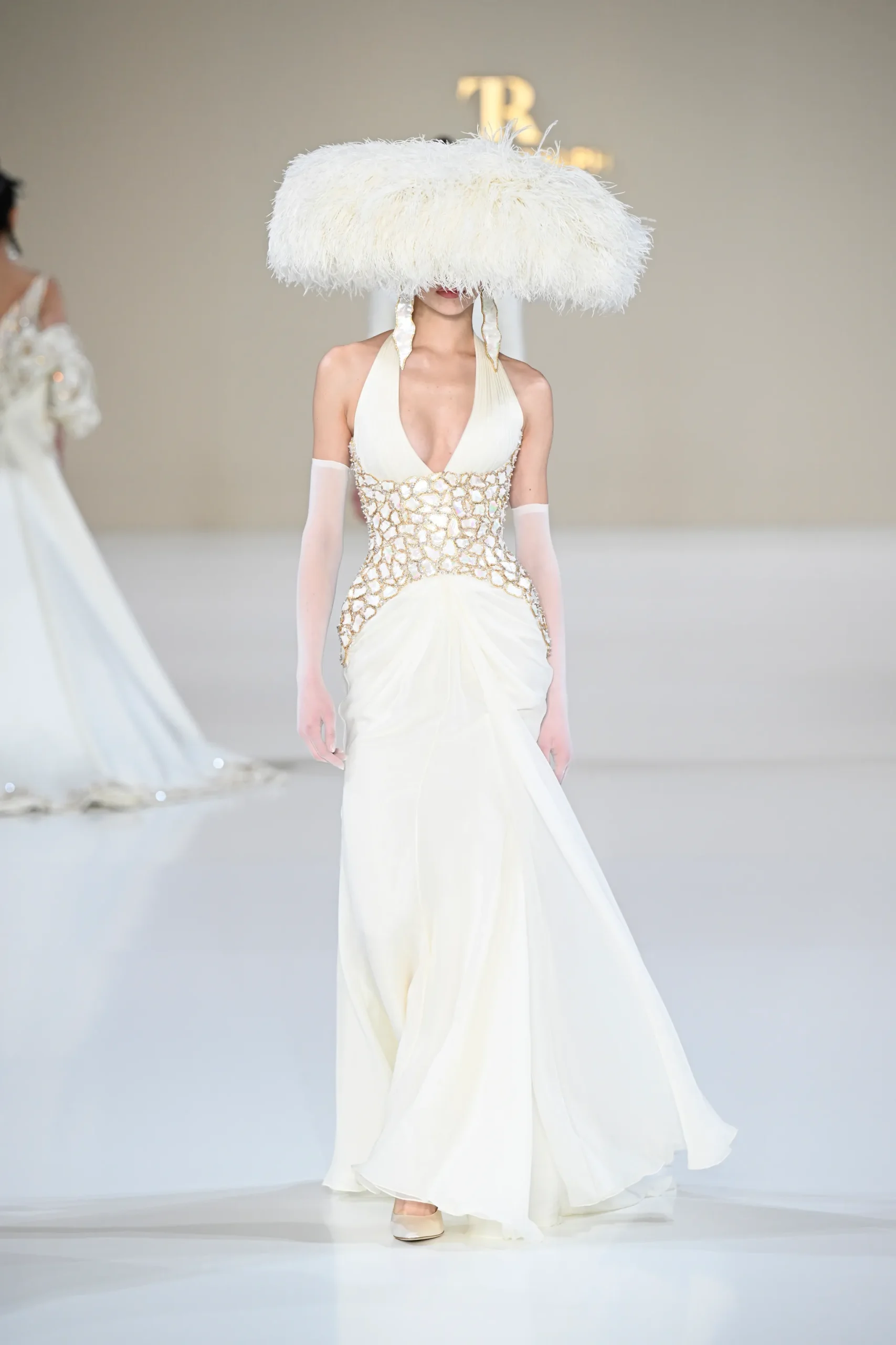 Бренд представил два свадебных образа в кутюрной коллекции. Первый — строгий минимализм цвета слоновой кости, второй — смелый антибрайд образ, дополненный россыпью из страз и короткой фатой.