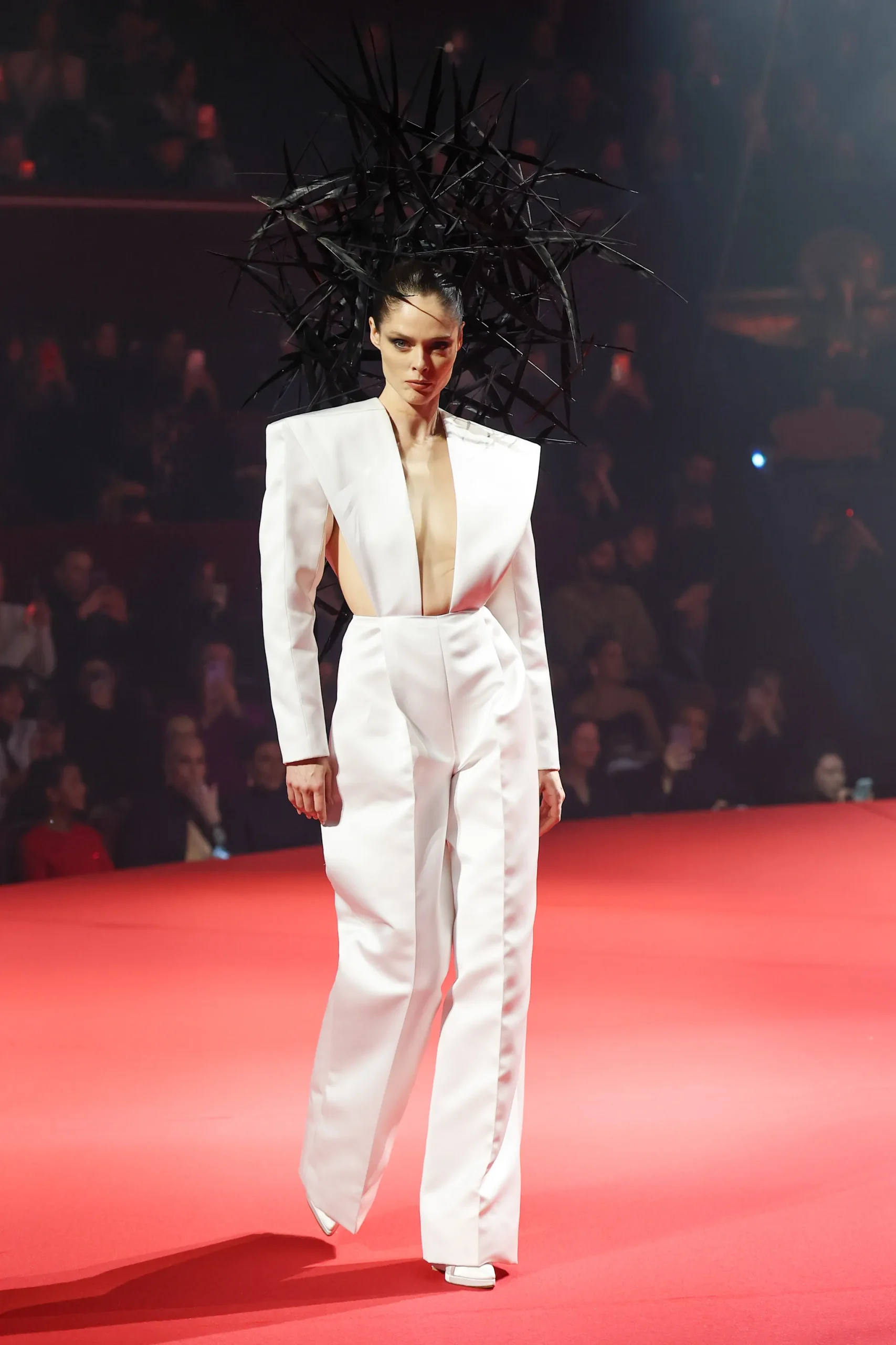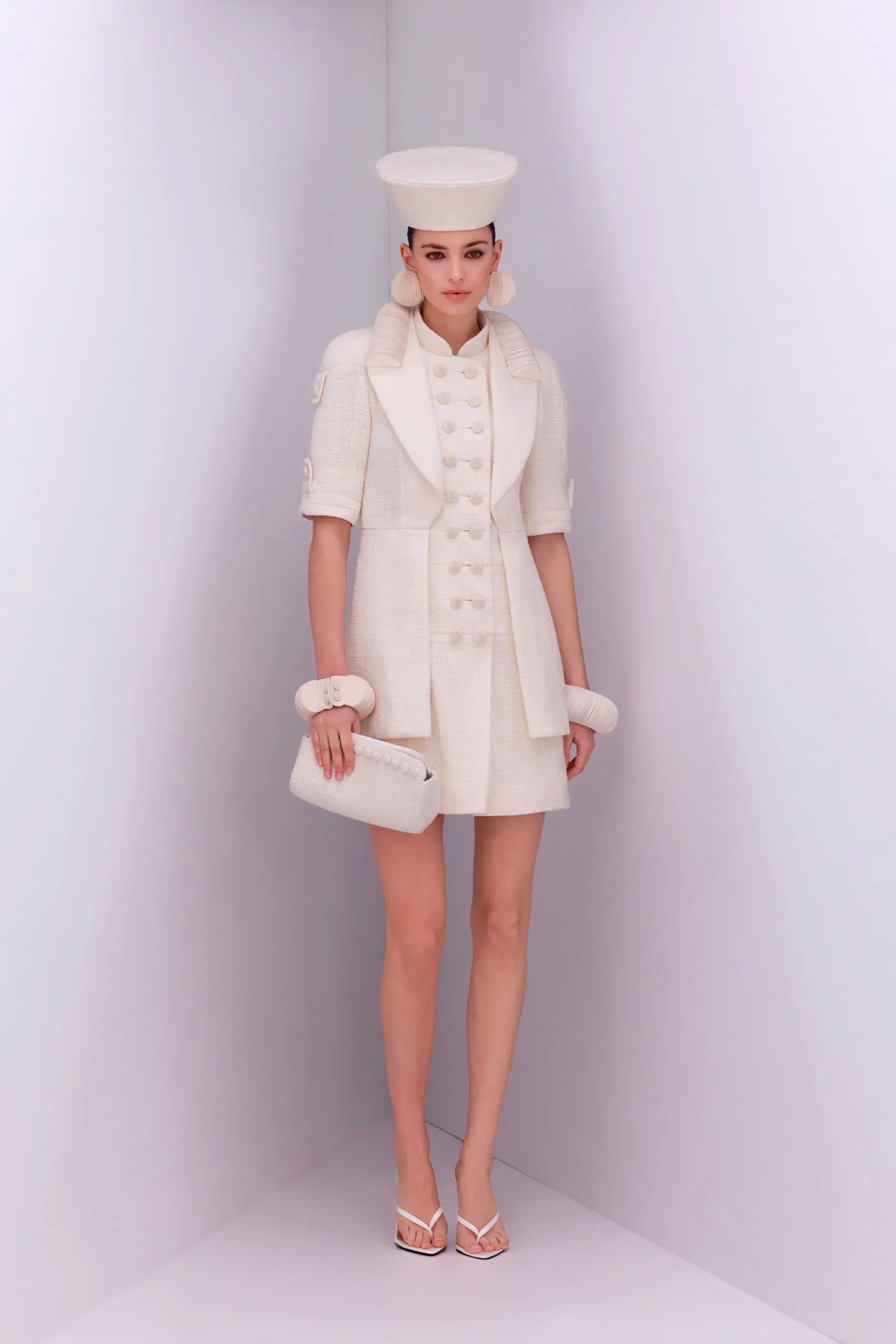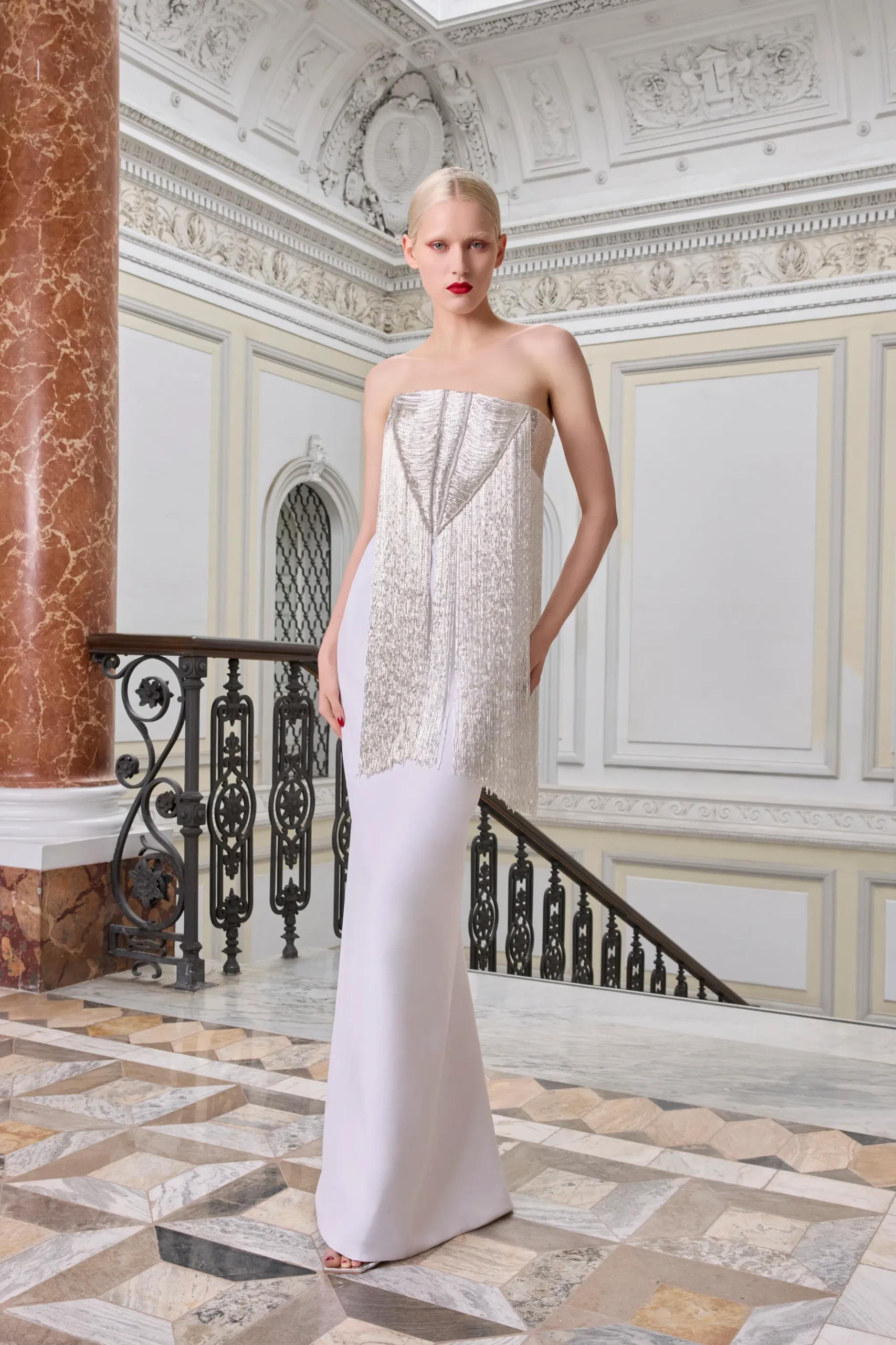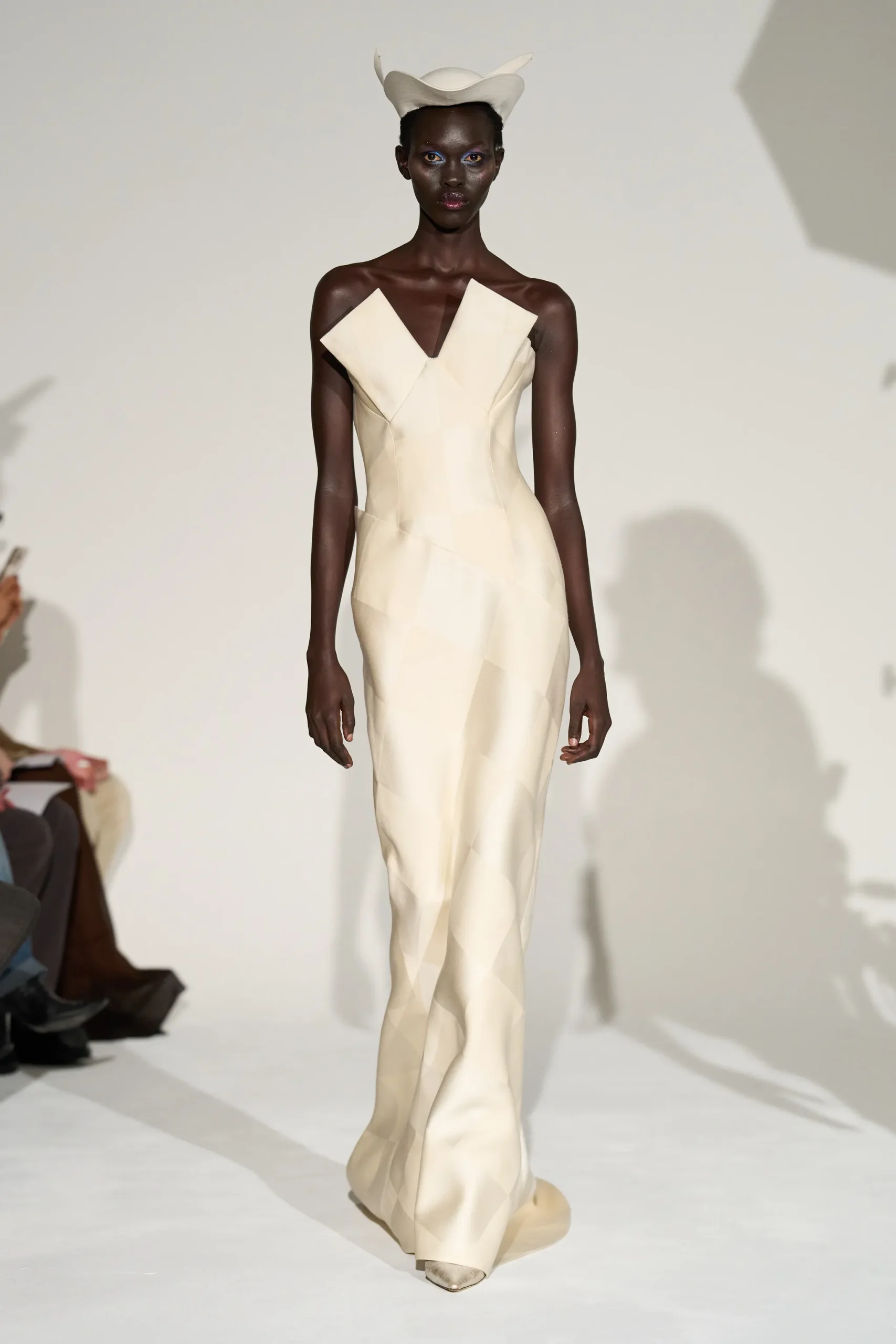 Бренд представил два свадебных образа в кутюрной коллекции. Первый — строгий минимализм цвета слоновой кости, второй — смелый антибрайд образ, дополненный россыпью из страз и короткой фатой.