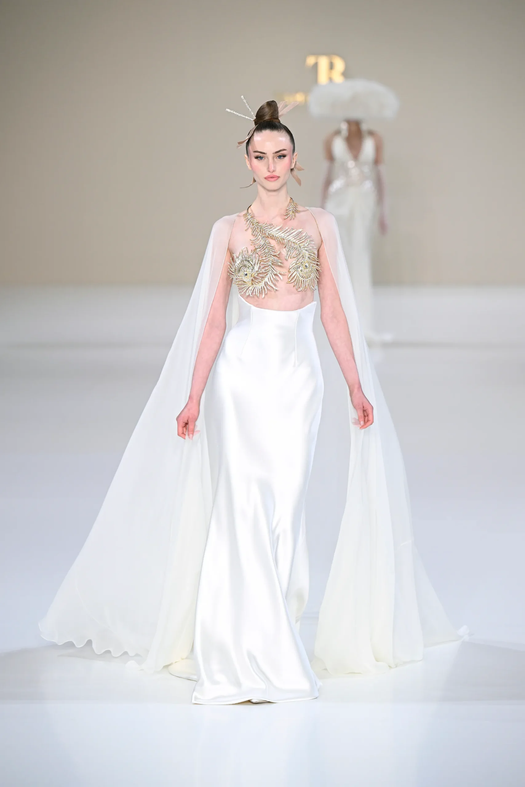 Ведущей темой коллекции стала гроза и метеорология. В образах невесты дизайнер сделал ставку на лаконичность, строгие формы и скульптурные силуэты. Первый образ — монументальный, второй — более воздушный, облегченный и с нотками весны в виде бабочек и шляпки.