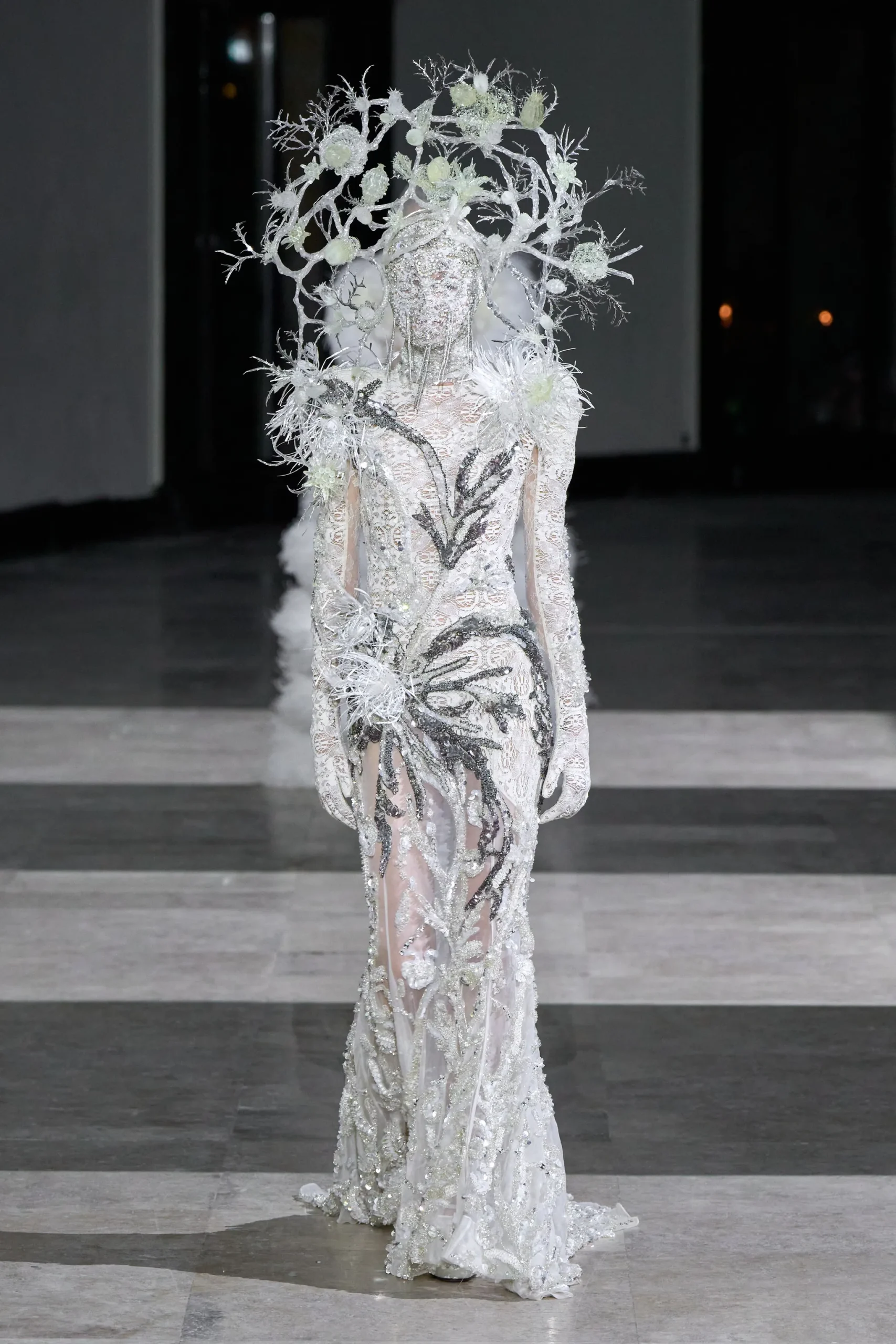 Белые свадебные наряды представали в образе первобытных существ, созданных из лепестков, сросшихся с перьями; ткани с животным принтом, насекомые, превращенные в формы, напоминающие люстры, и созвездия, сотканные из кристаллов, воплотили философские идеи коллекции в жизнь.
