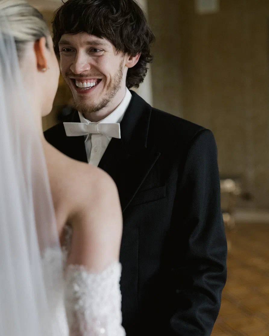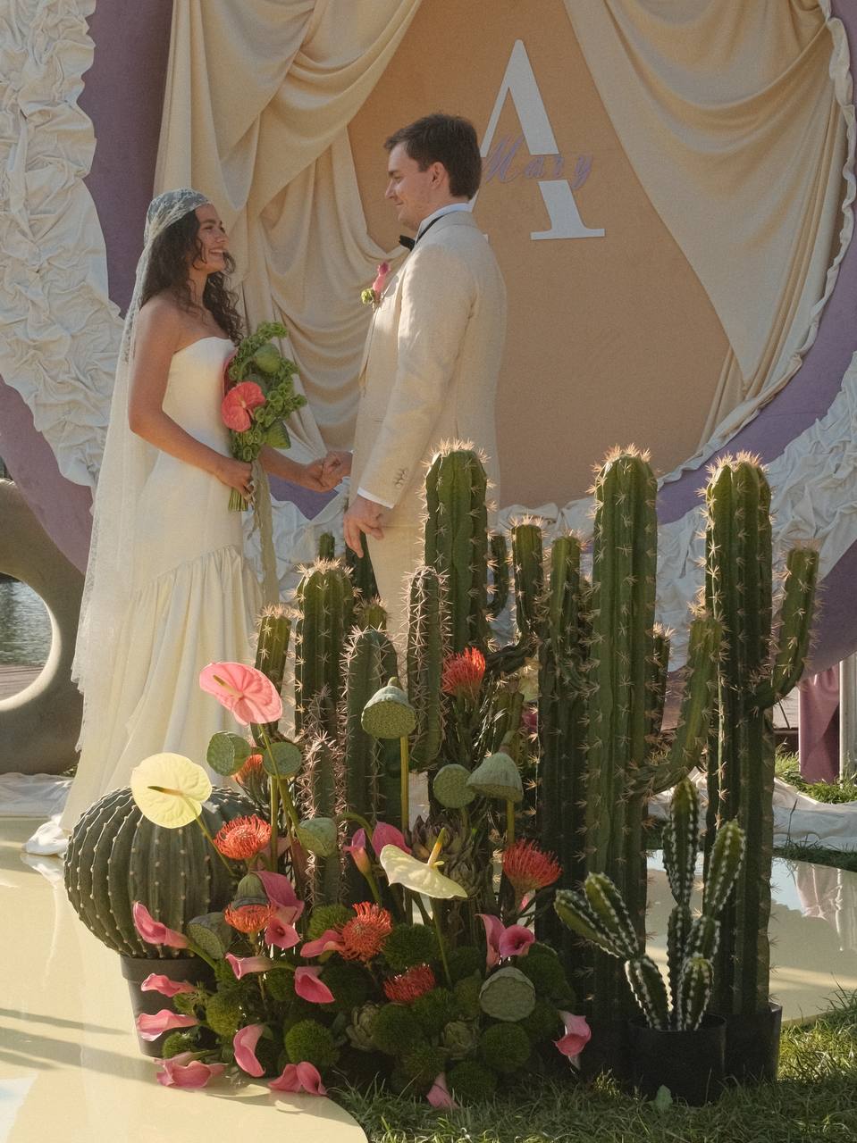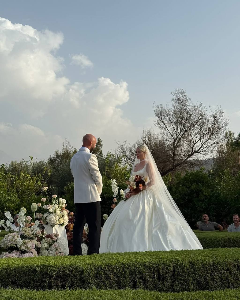 Нина выбрала изящное кружевное платье с длинной фатой от Galia Lahav, а Логан остановился на классическом костюме с белым пиджаком.