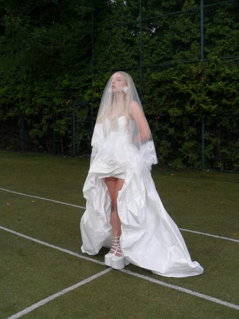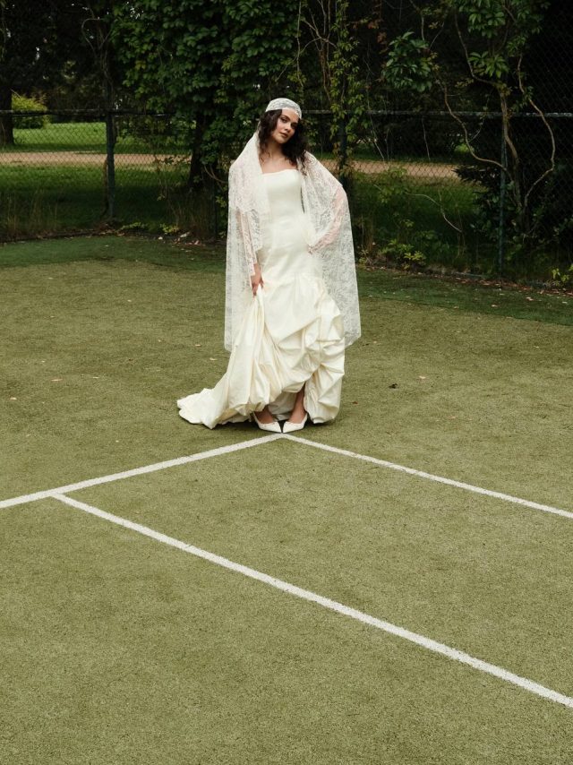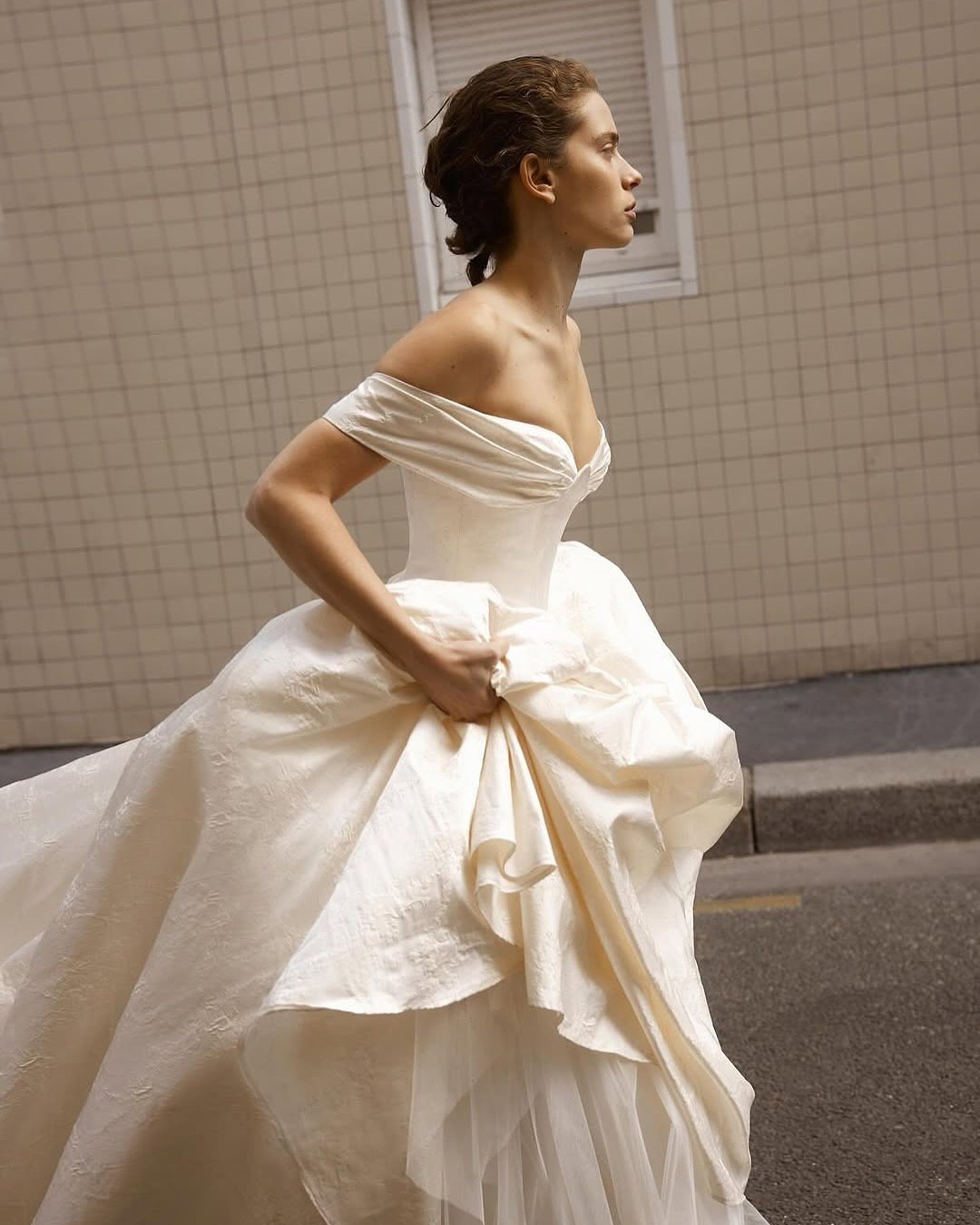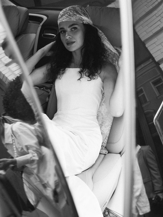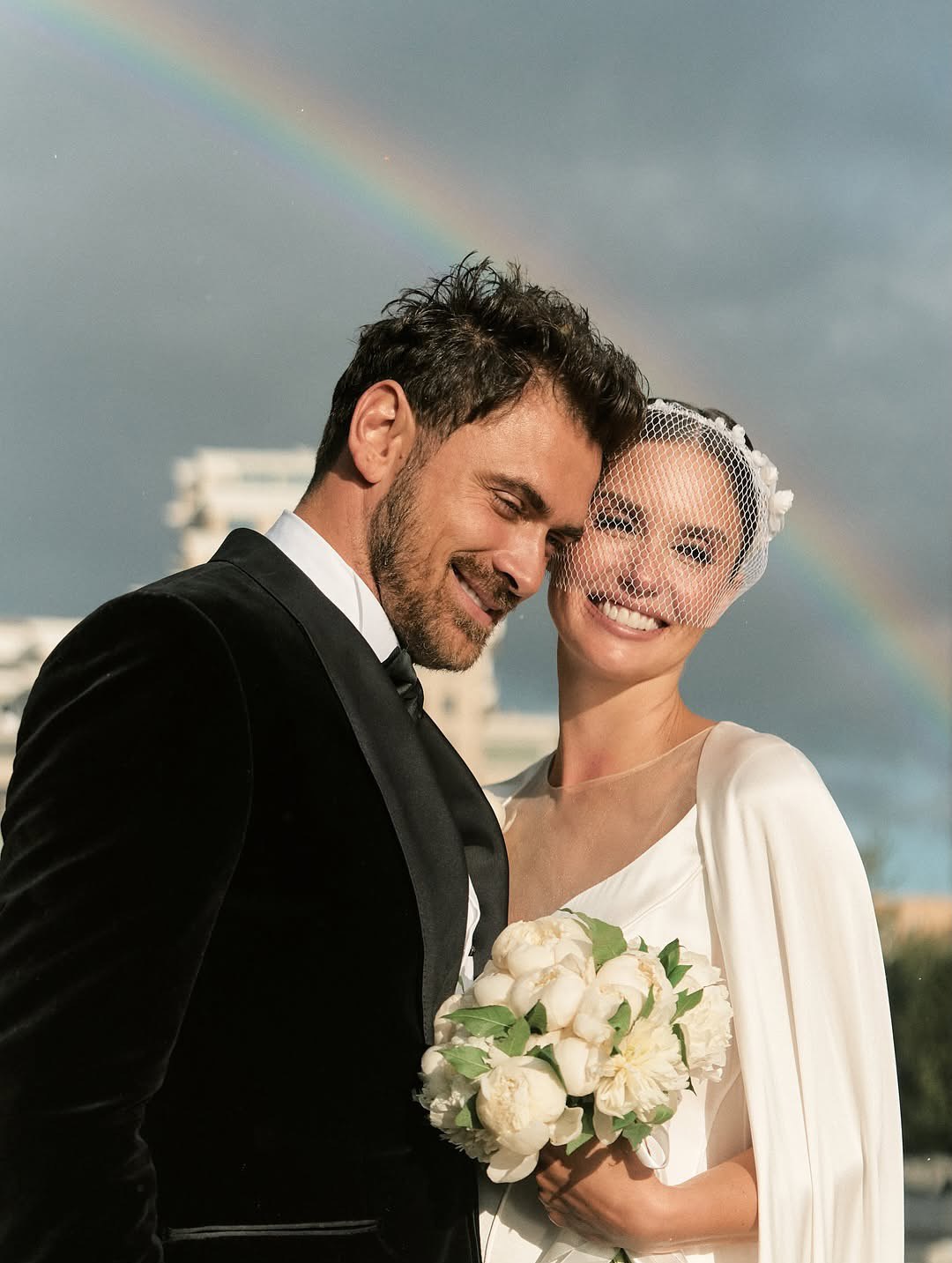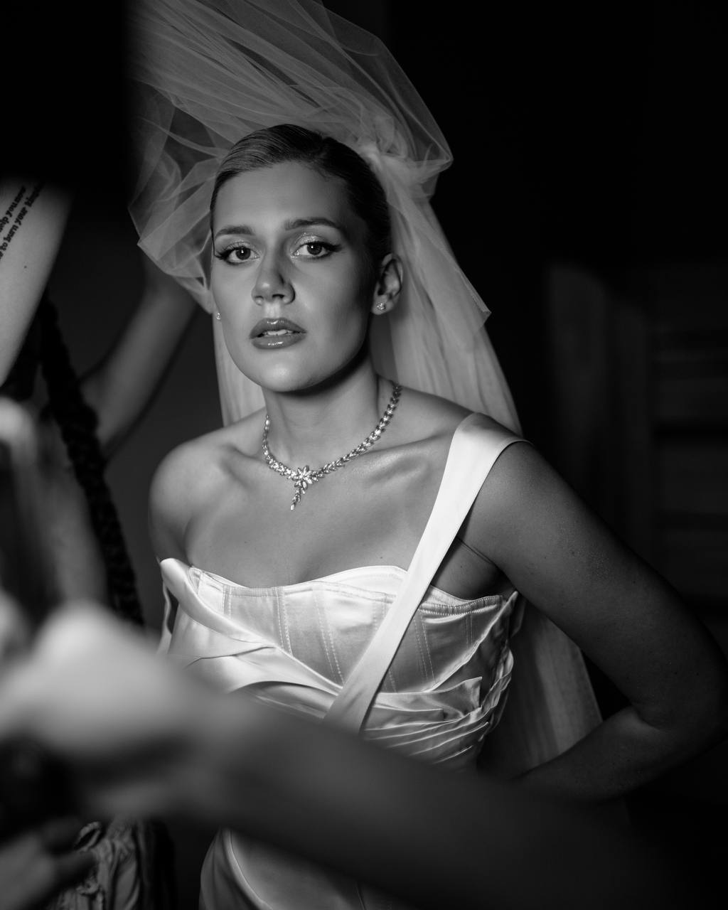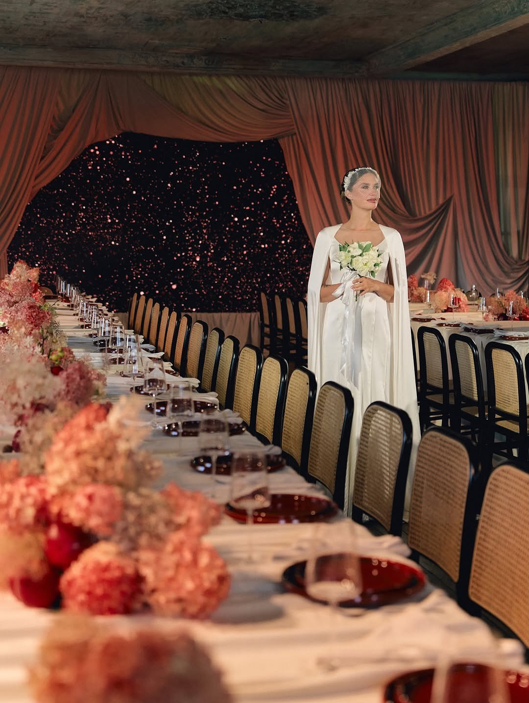 Никола выбрала романтичное платье с открытыми плечами, рукавами-буфами и деликатной цветочной отделкой на лифе. Особенный акцент — букет из одной розы и головной убор, который отсылает к свадебному образу её матери Клаудии.