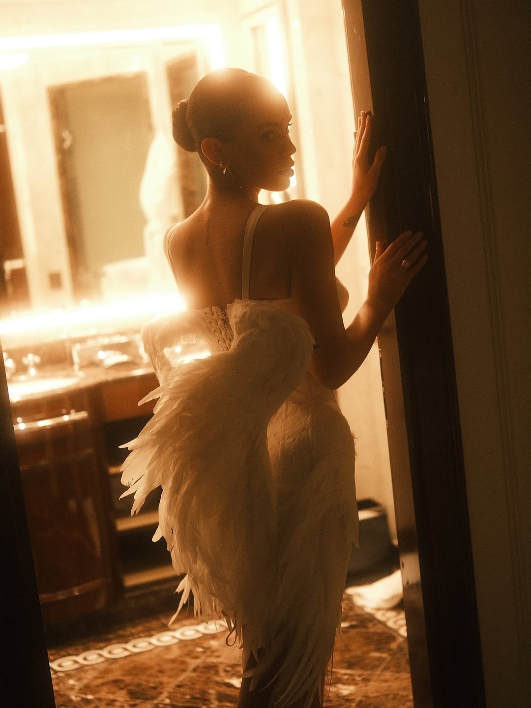 Николь сменила несколько образов. На девушке были белоснежный корсет, короткая юбка, чулки и укороченная фата, а также короткое корсетное платье с ангельскими крыльями, дополненное кружевной фатой и накидкой с длинным шлейфом. Оба образа просто невероятные!