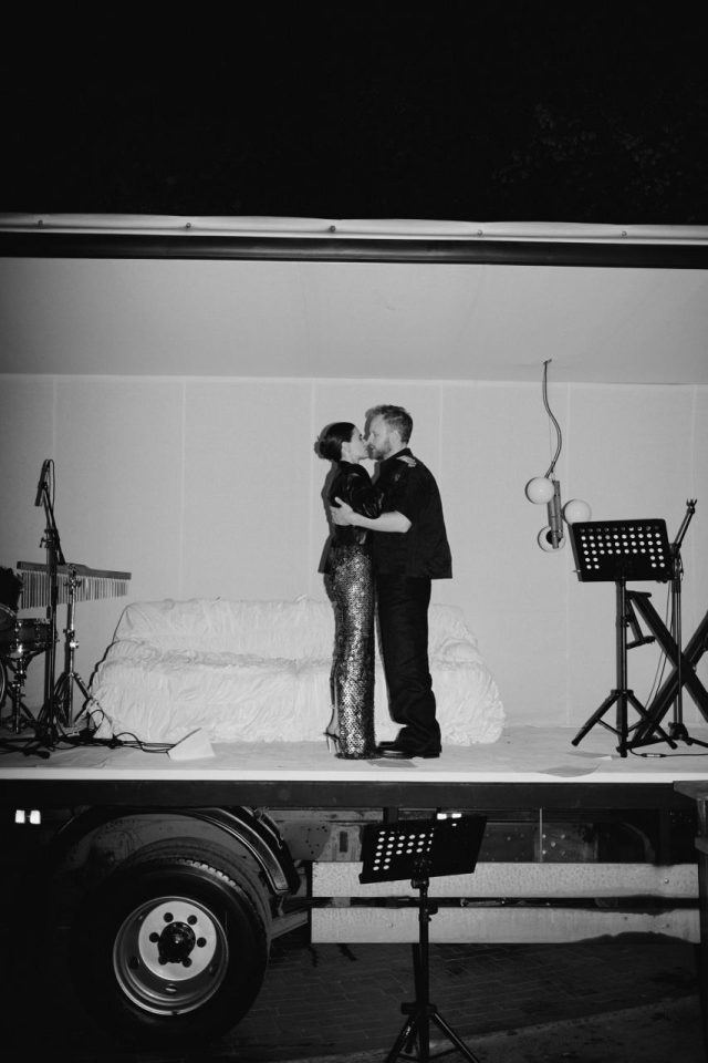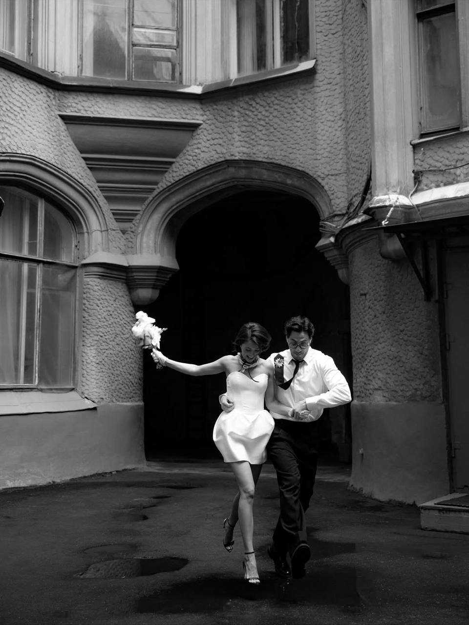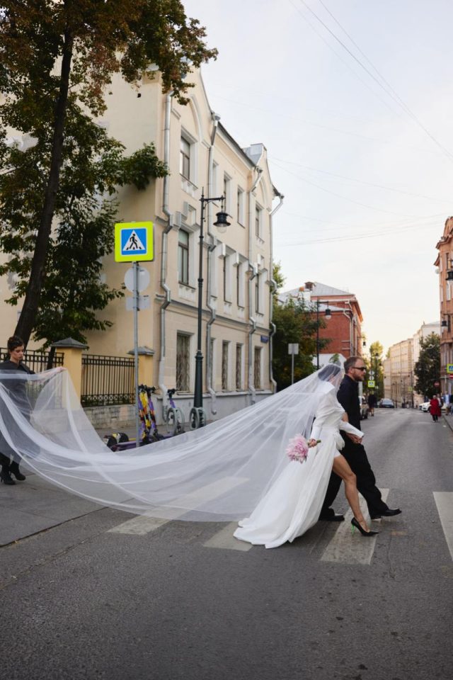 Свадьба прошла 14–15 сентября в урбан-локации «Автомойка by Veladora». У невесты было два образа: платье-рубашка с драпировками и фатой от Ильи Мигмуна, а также эффектное корсетное платье с металлическим декором от Хавьера Коллазо.
