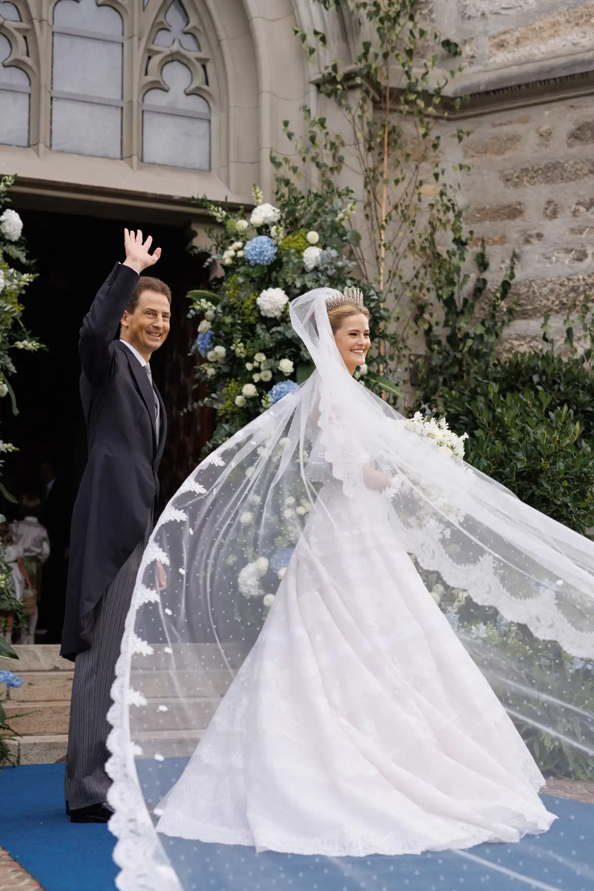 Церемония прошла в соборе Святого Флорина в Вадуце. Невеста предстала в классическом белом платье с длинной фатой. Образ дополняла фамильная тиара Габсбургов XIX века, созданная по мотивам русского кокошника.