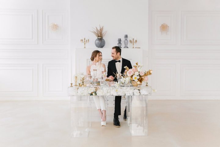 Важным элементом в декоре стала прозрачная столешница, которую флористы оформили белыми цветами, золотыми ветками и суккулентами. В остальной флористике мы придерживались лаконичных, благородных форм и классической цветочной рецептуры: пионы, ранункулюсы, розы. А вот зелень мешала бы восприятию, поэтому от нее мы отказались в пользу окрашенных в золотой цвет живых веток.