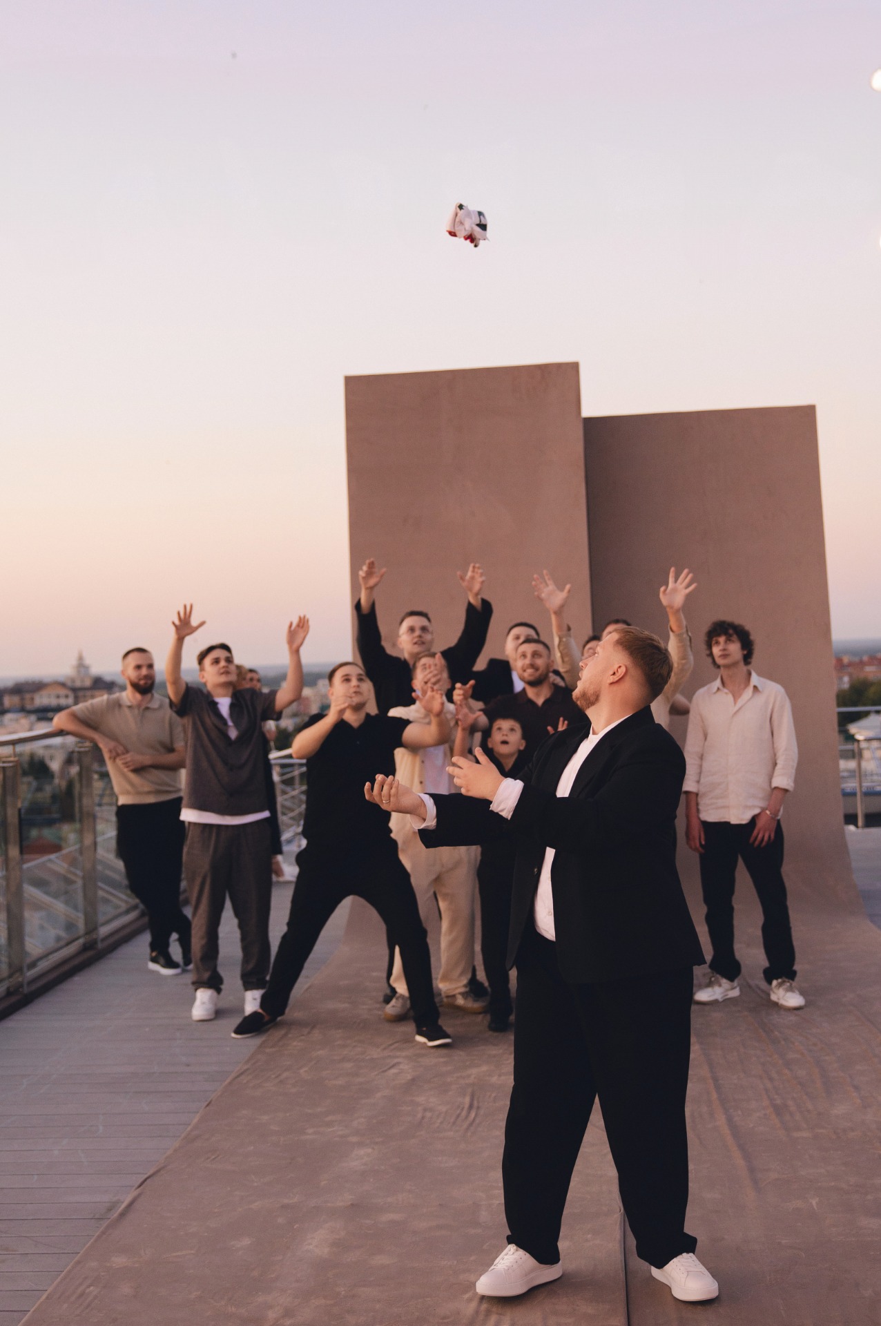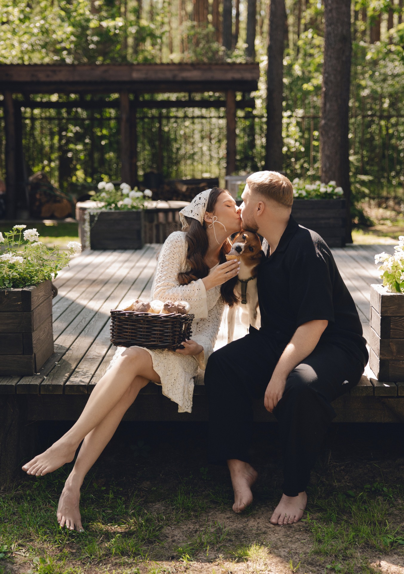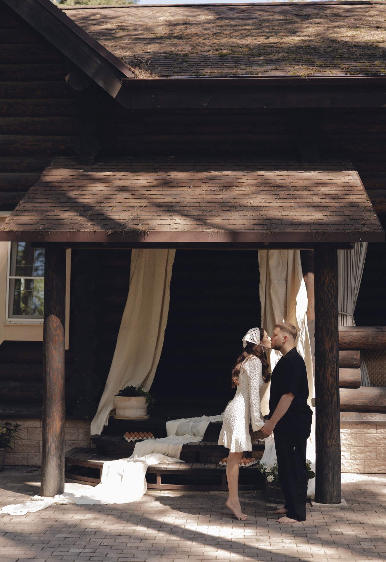 Этот праздник навсегда останется в нашей памяти как одно из самых тёплых воспоминаний. Во многом благодаря нашей потрясающей команде. Утро мы провели на родительской даче — в месте, которое для нас всегда было символом уюта. Там состоялась и наша утренняя съёмка: я была в мягком вязаном платье и кружевной косынке, а Аркадий — в расслабленном летнем образе. Всё было подобрано в духе нашей свадебной концепции «Голову вскружило». Мы слушали музыку, ели мороженое, играли с собакой и чувствовали, что начинается особенный день.