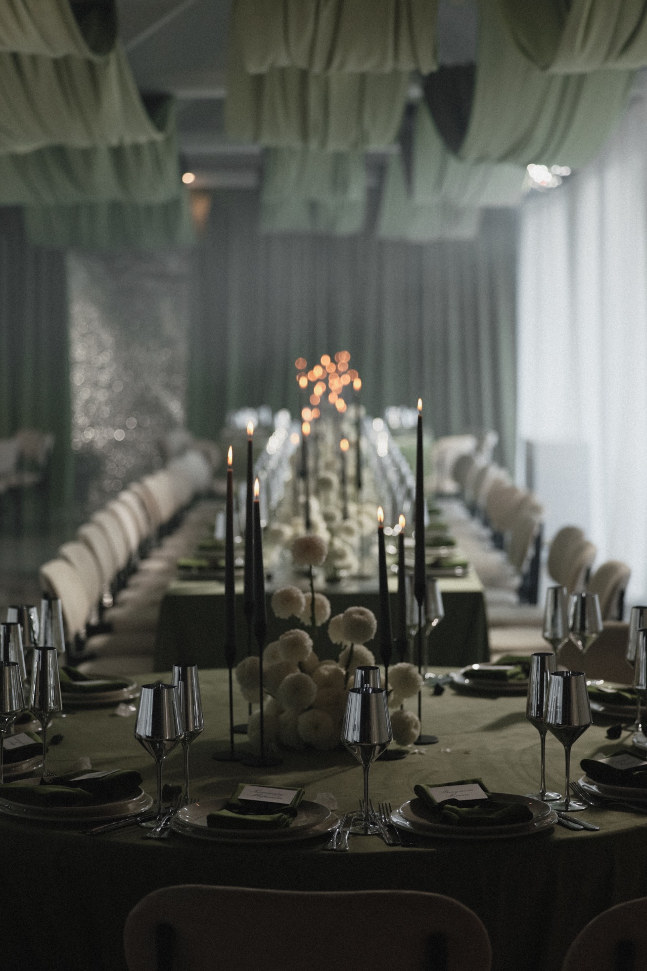 Они поделились трогательной историей предложения и рассказали о своей любви к горам. Им очень хотелось, чтобы горы стали лейтмотивом свадьбы. При этом мы сознательно избегали буквального образа гор. В концепцию мы заложили цветовой код: оттенки зелёного, белого и серебра. Центральным объектом церемонии стал «горный разлом» — арт-объект, напоминающий трещину между скалами, за которой будто бы открывается вид на горный массив.