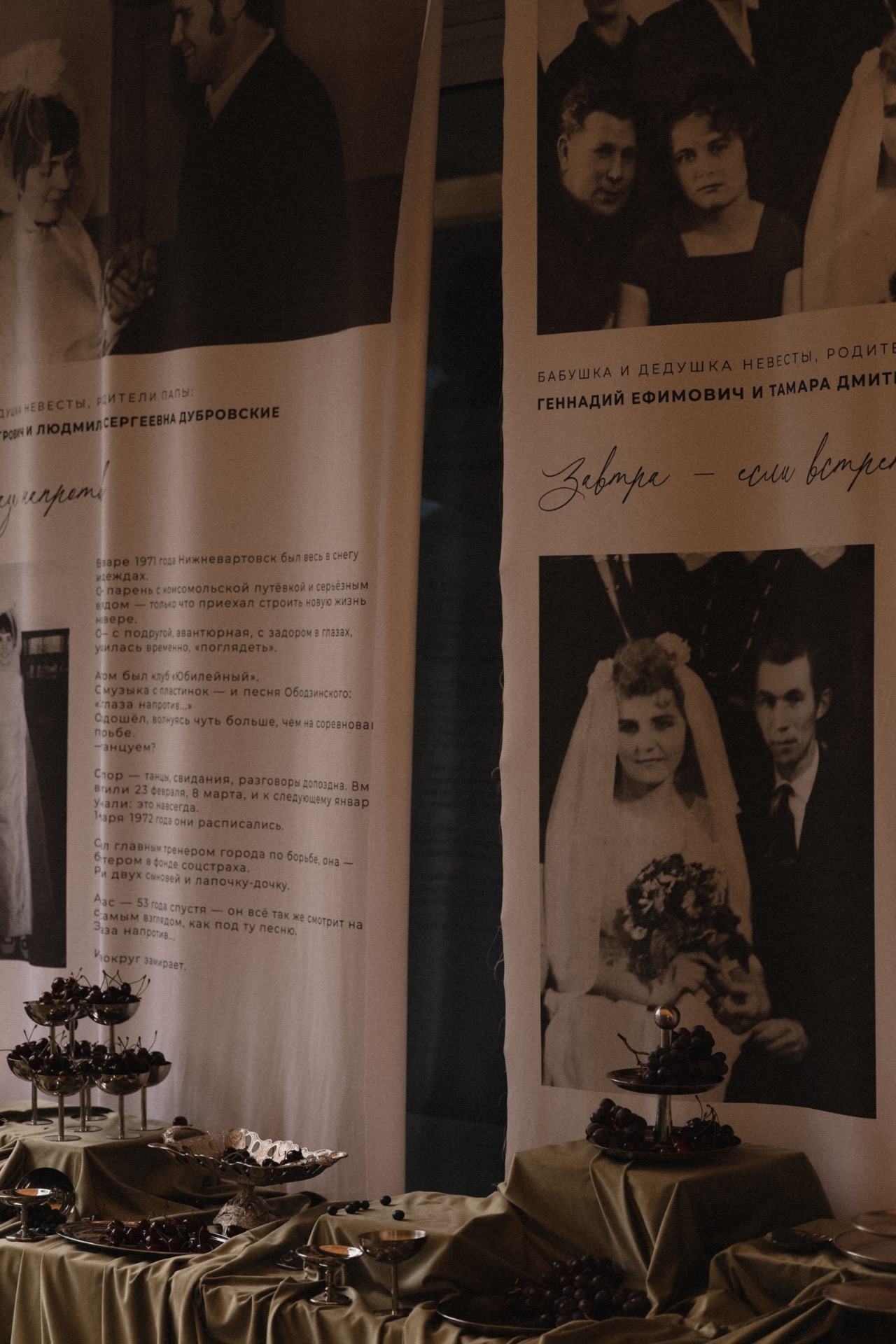 Отдельного внимания заслуживает «галерея семейных историй» — стенд с историями любви и свадебными фотографиями бабушек, дедушек и родителей Дениса и Анастасии. Настя бережно относится к семейным ценностям, поэтому идея объединить такие архивы с эстетикой фуд-стайлинга особенно откликнулась в сердцах пары.