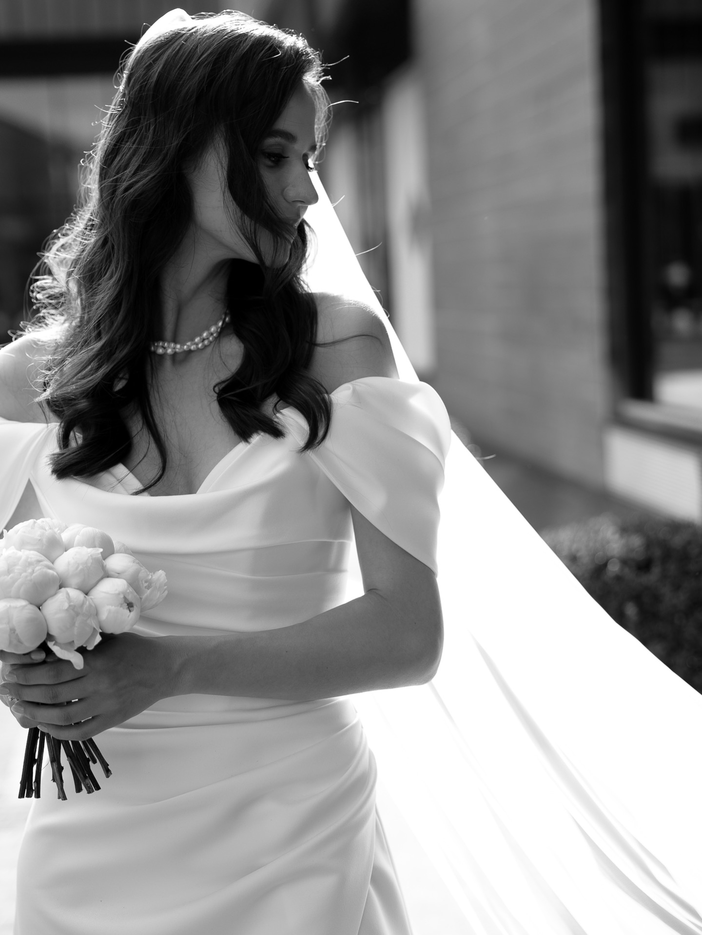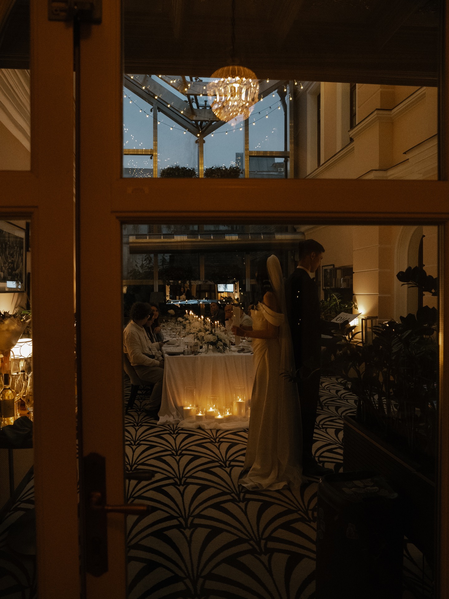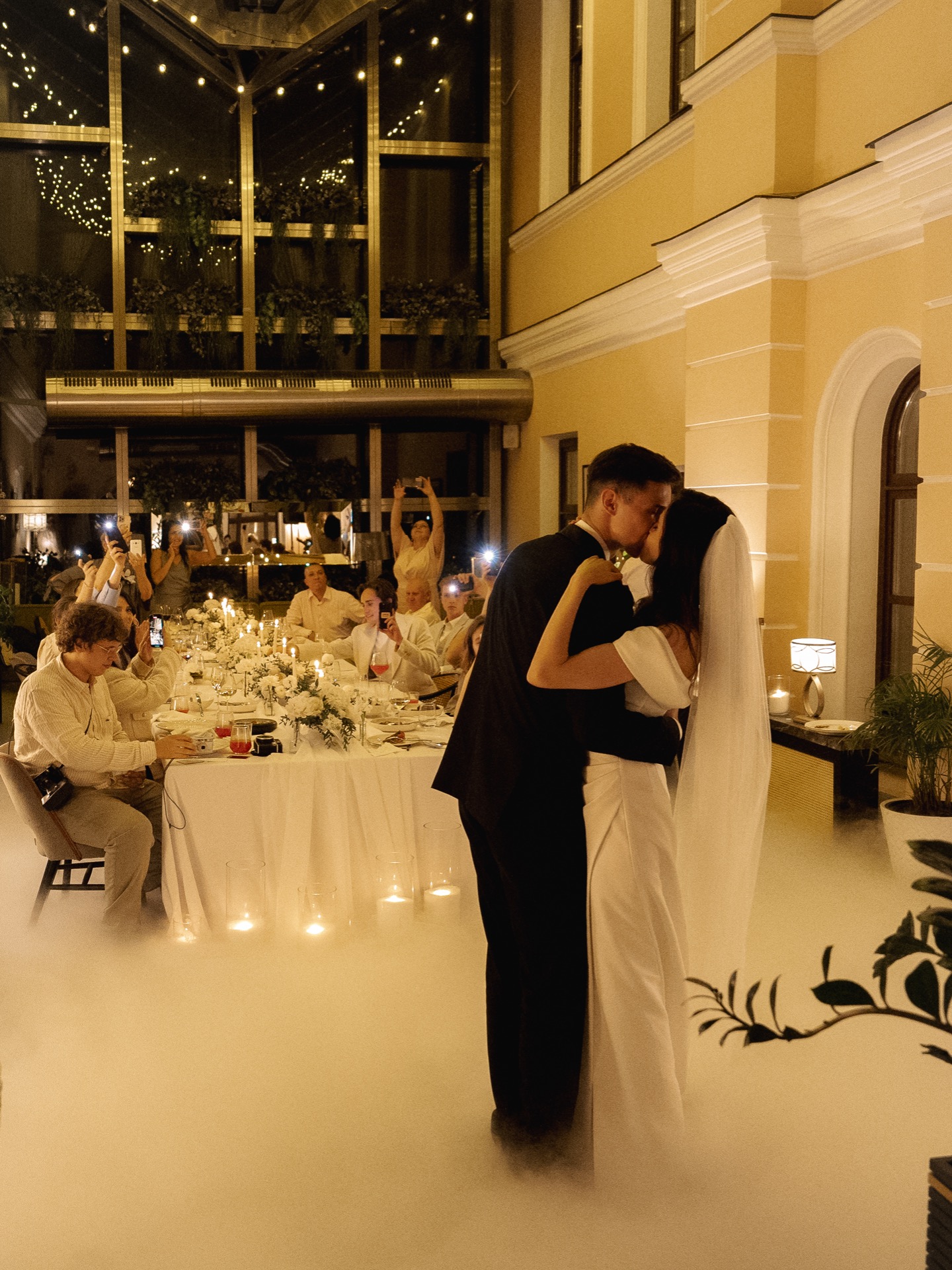 Строгий чёрный смокинг и нежное белое платье со шлейфом и съёмными рукавами лаконично продолжили стиль современной классики, заложенный концепцией свадьбы.