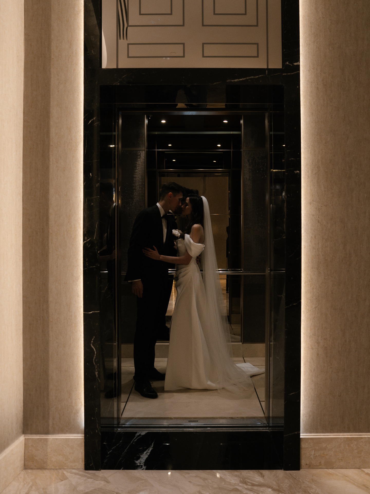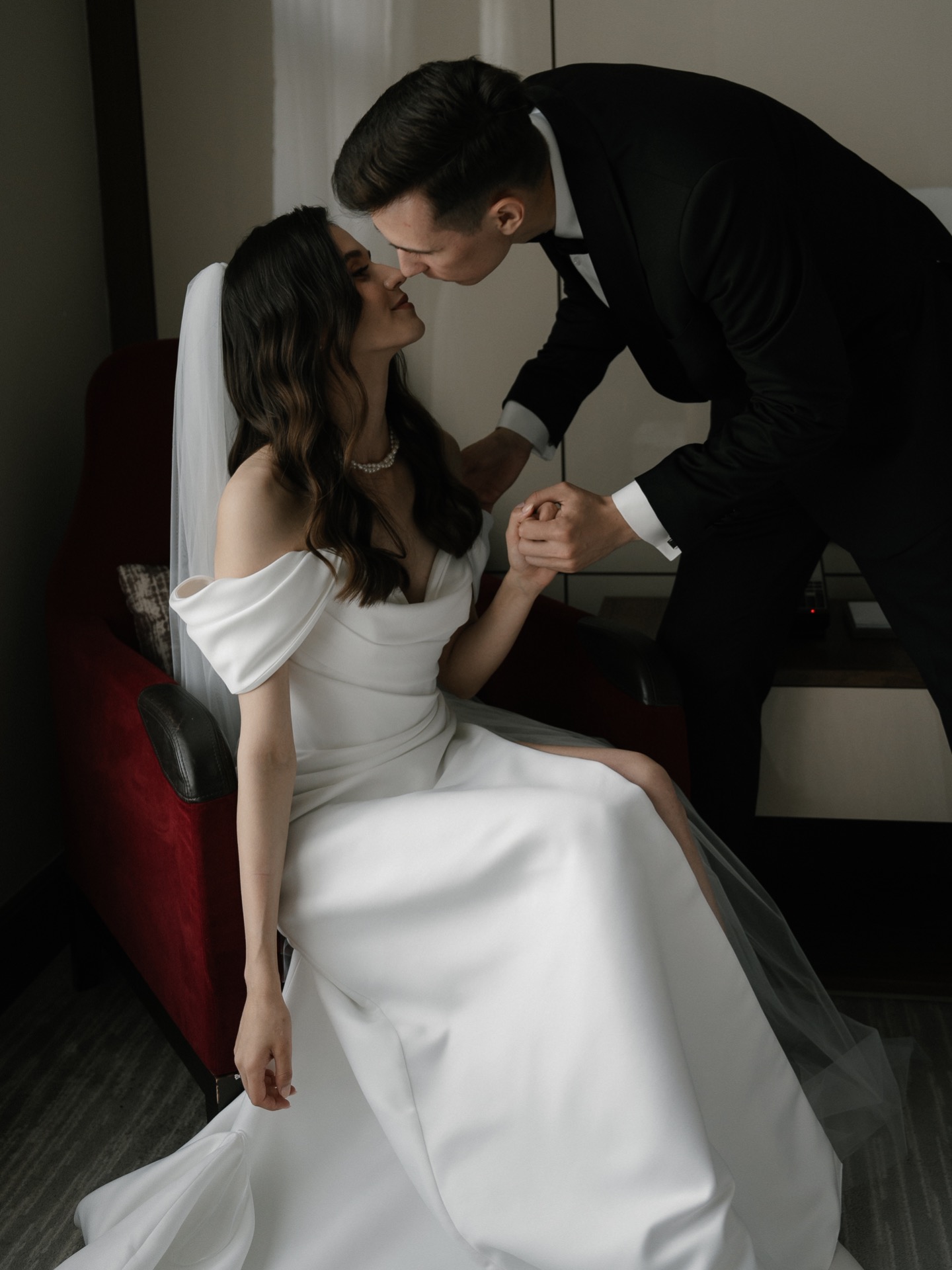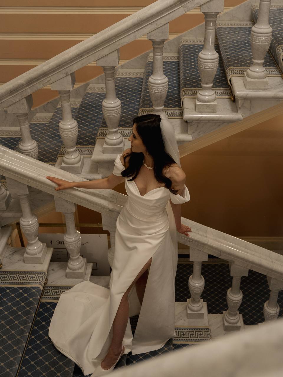 Строгий чёрный смокинг и нежное белое платье со шлейфом и съёмными рукавами лаконично продолжили стиль современной классики, заложенный концепцией свадьбы.