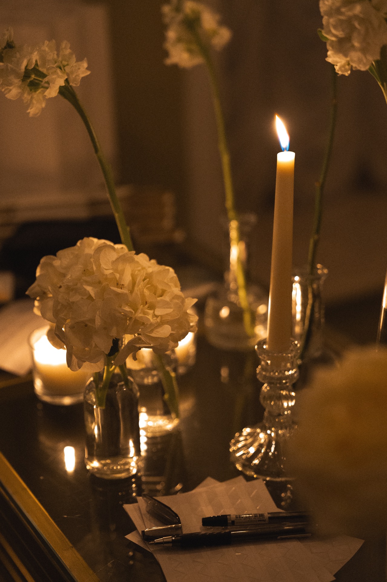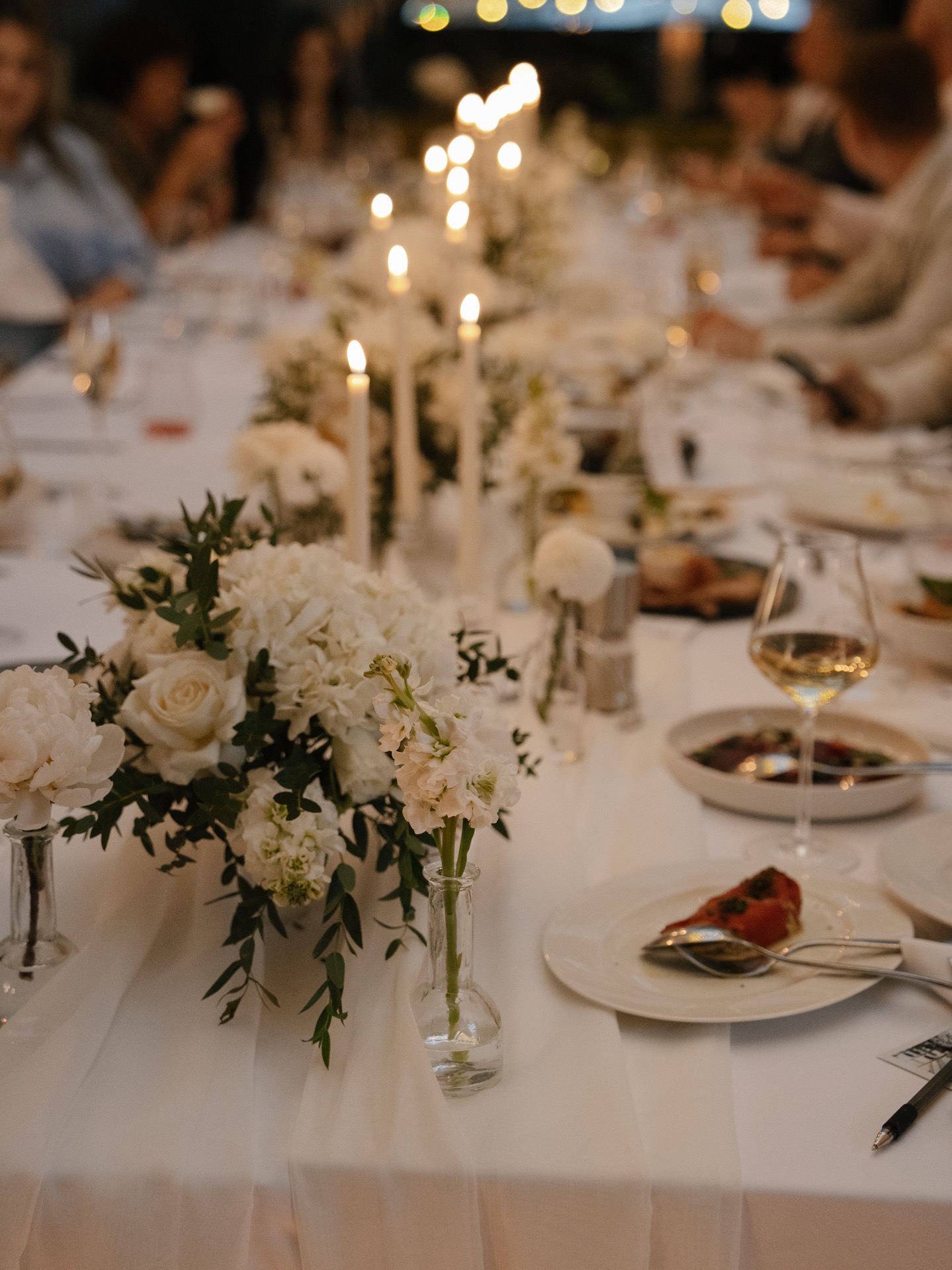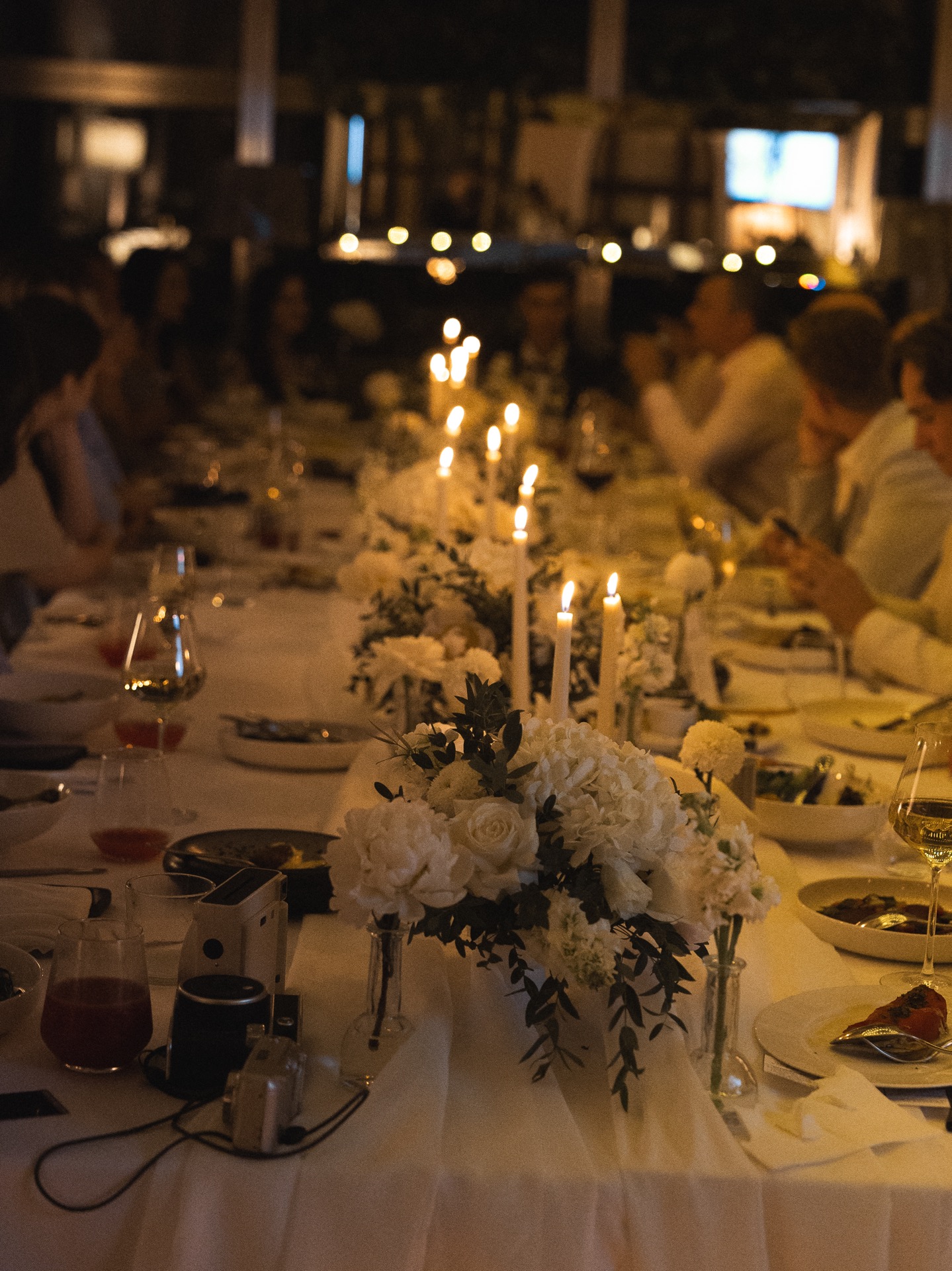 При выборе дресс-кода, мы отдали предпочтение пастельным тонам, а в качестве декора выбрали композиции из объёмных живых белых цветов, придающих свежесть, в сочетании с насыпными белыми свечами, которые вечером создали атмосферу семейного тепла.