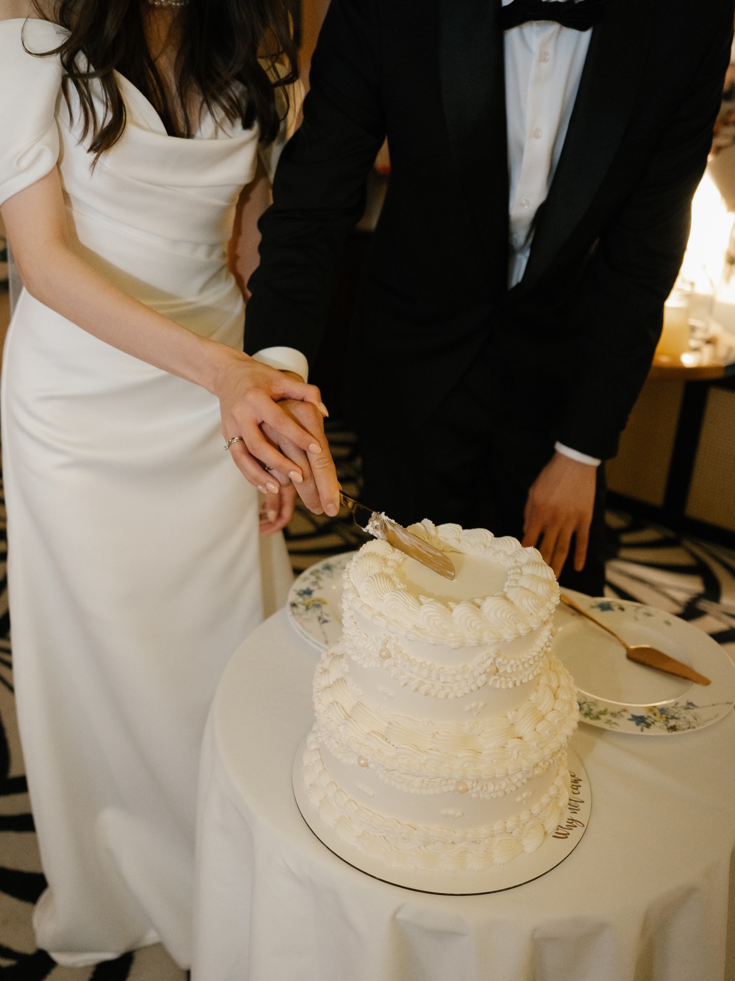 Нашим свадебным тортом стал белоснежный двухъярусный торт в стиле Ламбет.
