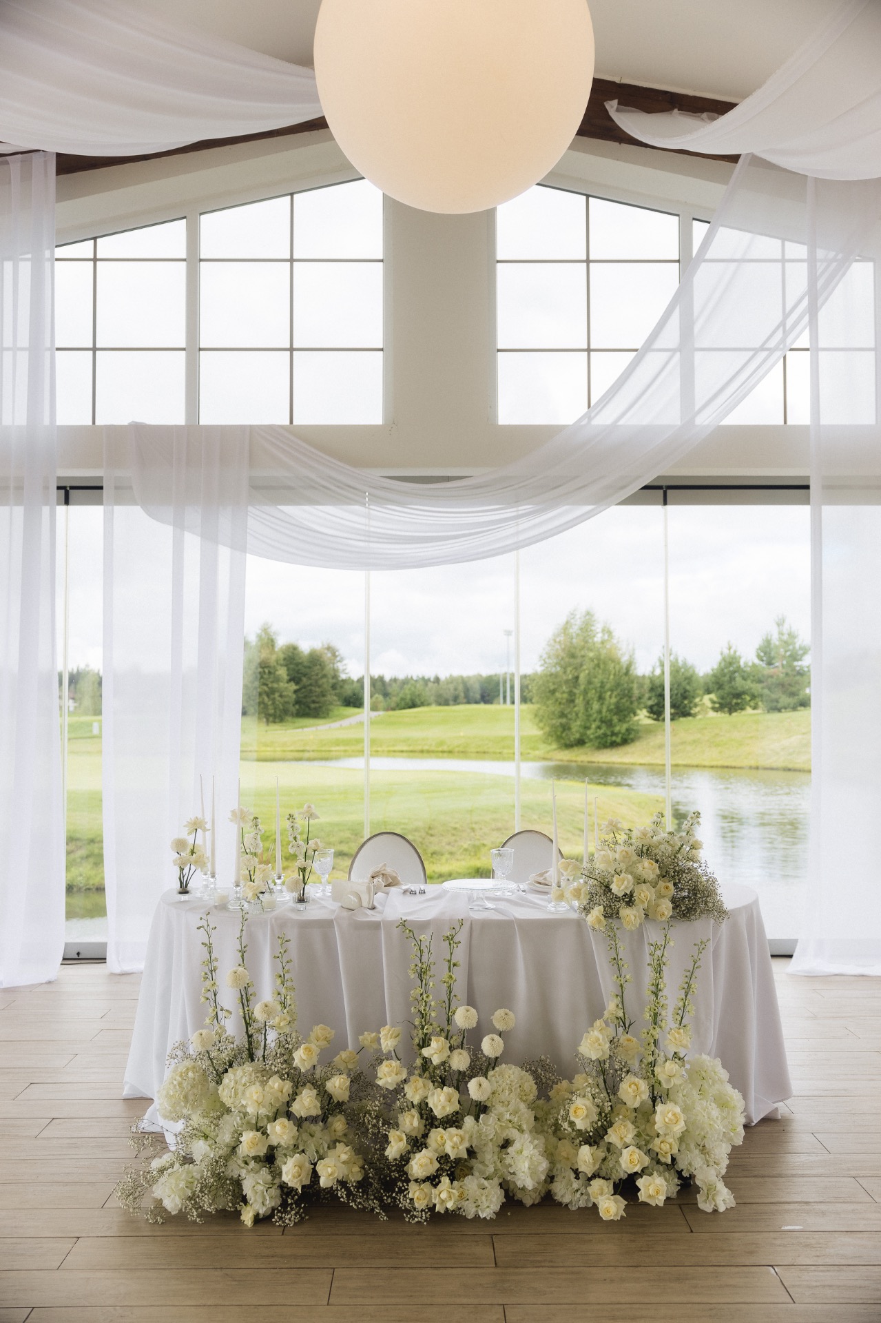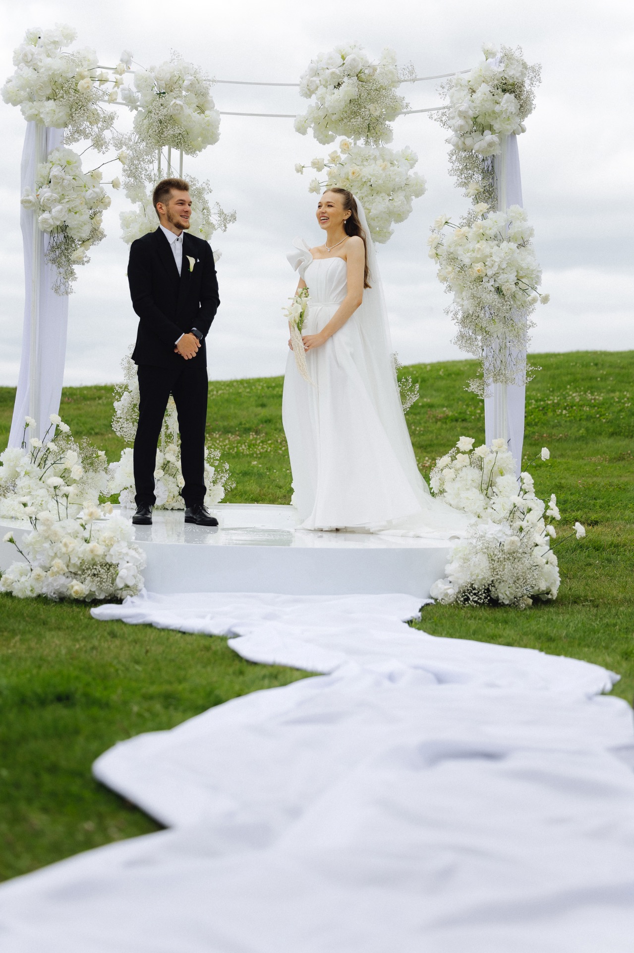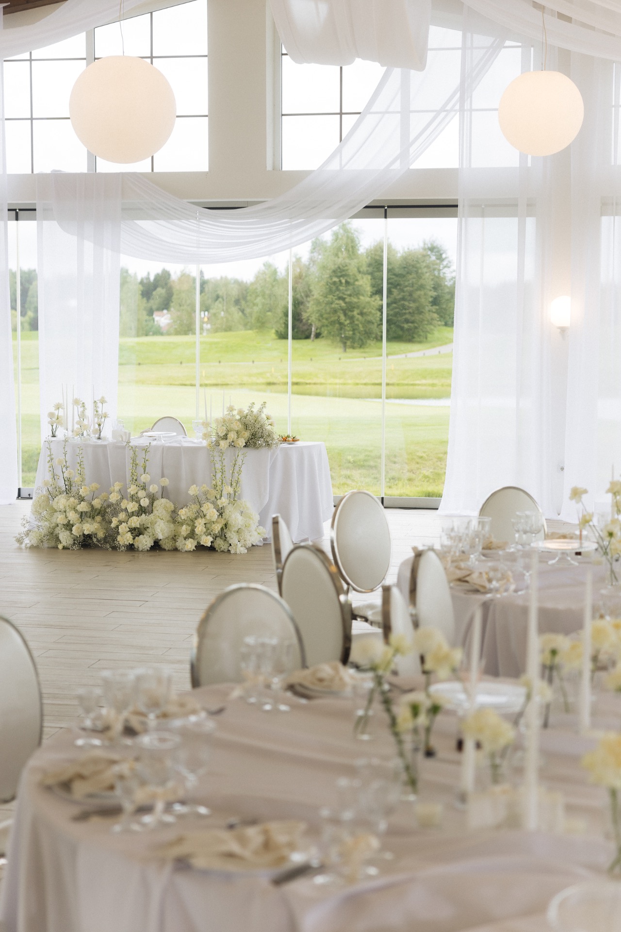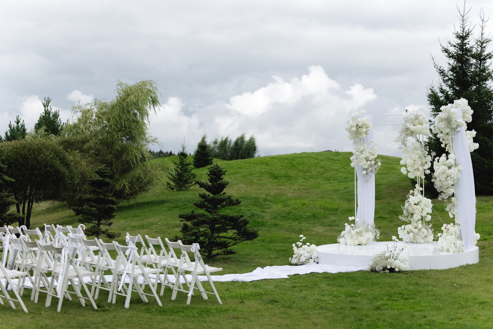 Мы сразу определились с площадкой. Мне хотелось много зелени и красивого ландшафта, и поле для гольфа оказалось той самой золотой серединой. В вопросе палитры сомнений тоже не было. По нашему мнению, зелёное поле для гольфа лучше всего сочетается с белой классикой.