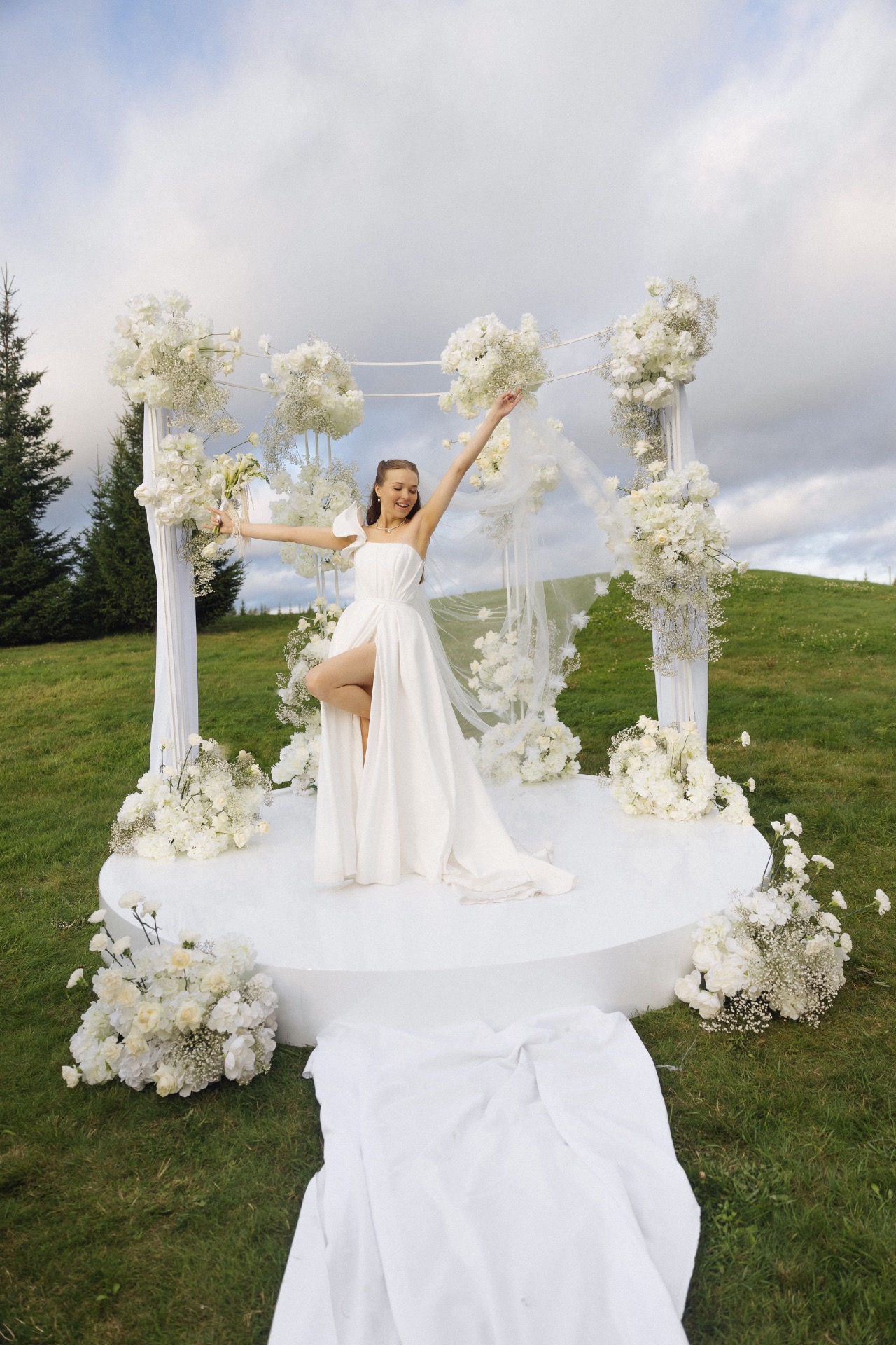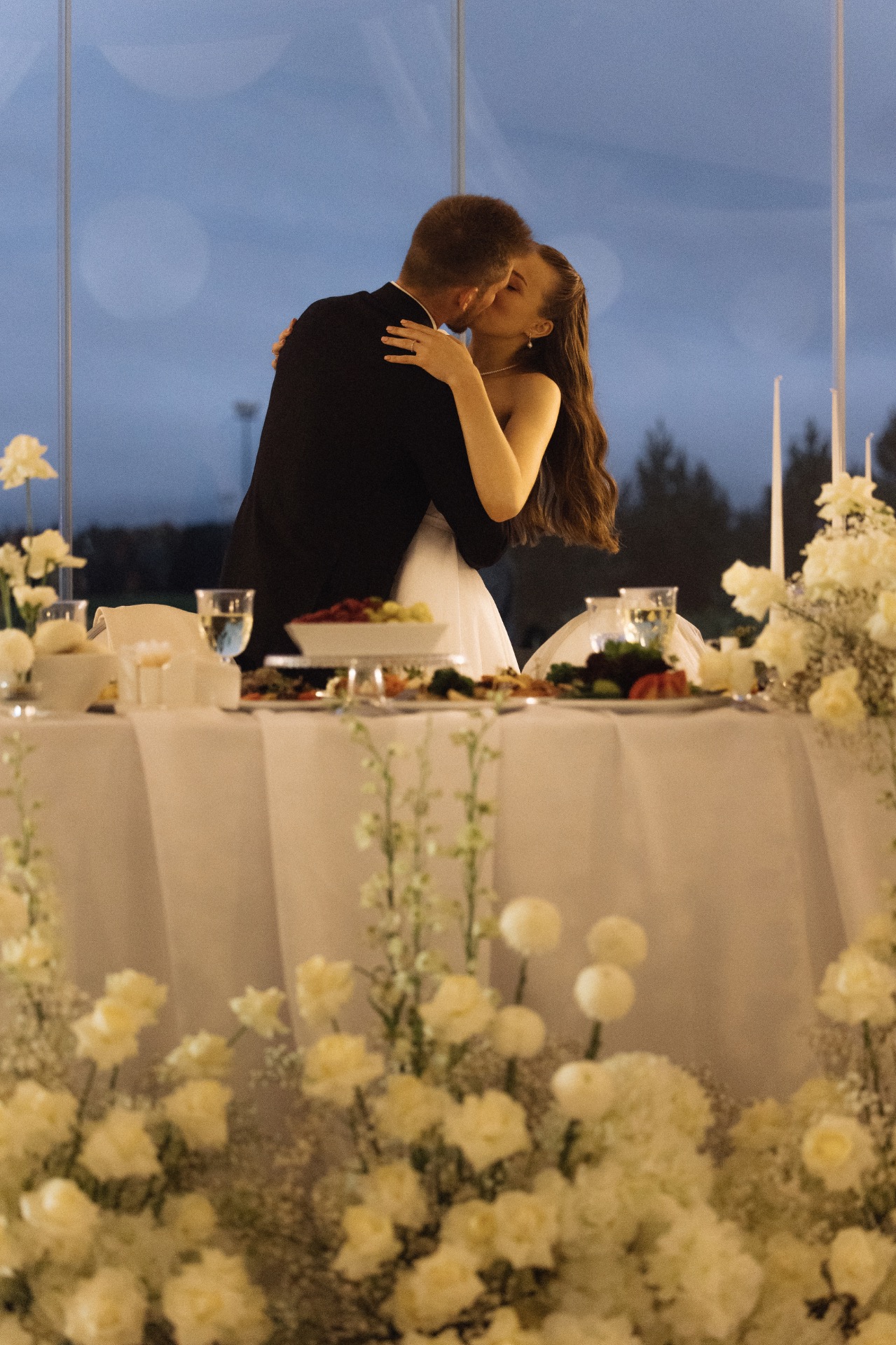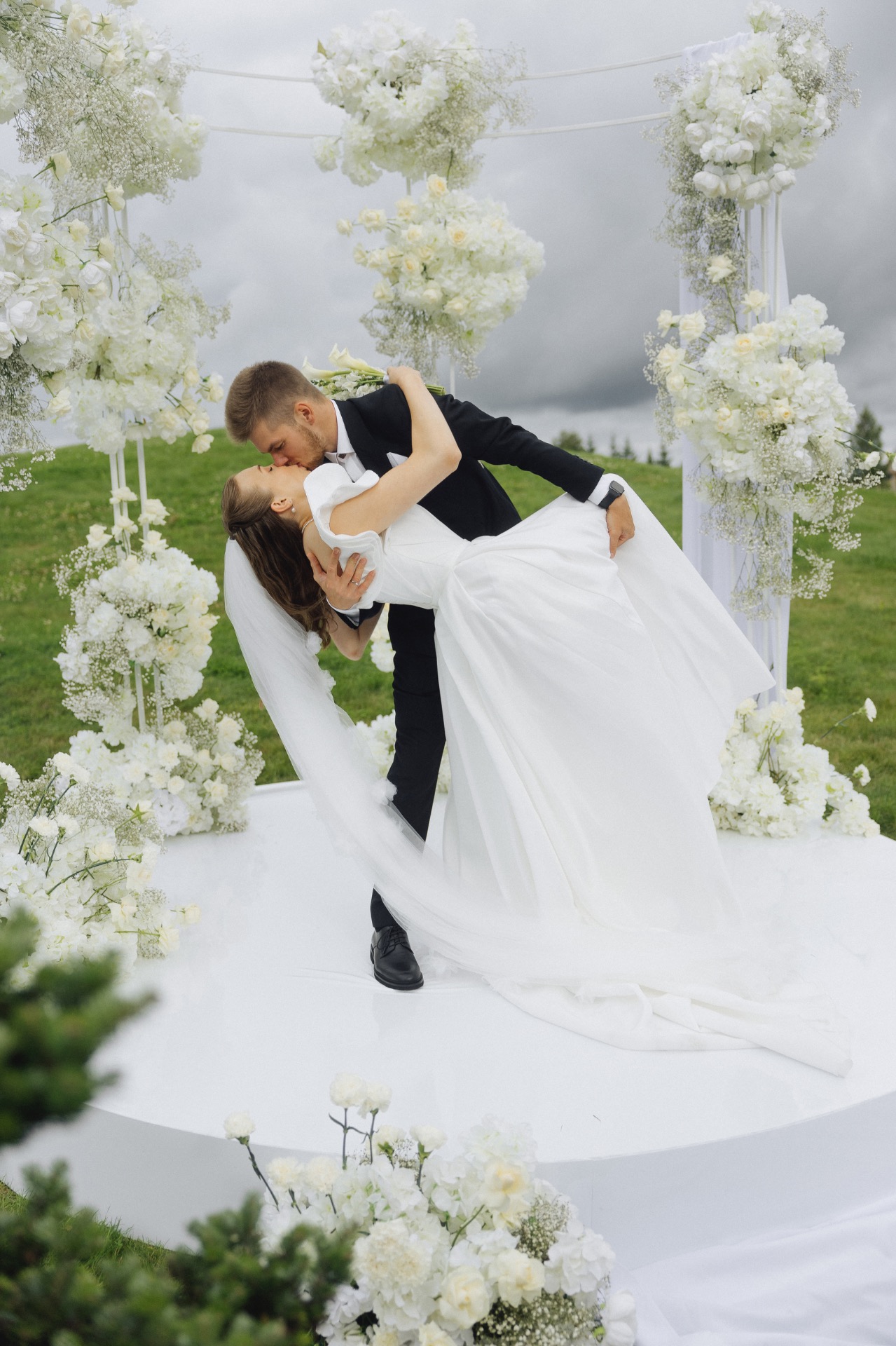 Я хотела свадьбу как на Pinterest, поэтому мы добавили в наш праздник много трендовых элементов: расстановку столов змейкой, тканевые полотна под потолком. А от арки в зоне церемонии я до сих пор в восторге, как и все гости, которые были на нашей свадьбе.