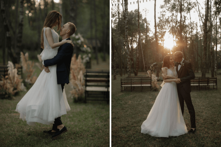 Каждый элемент оформления отражал отношение друг к другу – нежная палитра, сказочные сухоцветы и легкость. Мы выбрали открытую площадку, где гости чувствовали себя уединенно и спокойно. Все оказались среди зеленых деревьев, что позволило почувствовать себя героями лесной сказки.