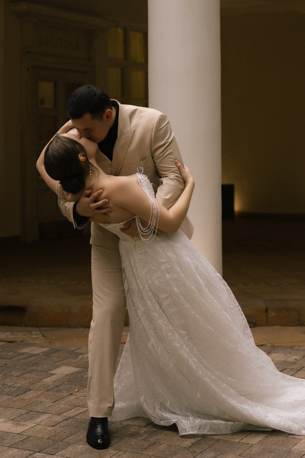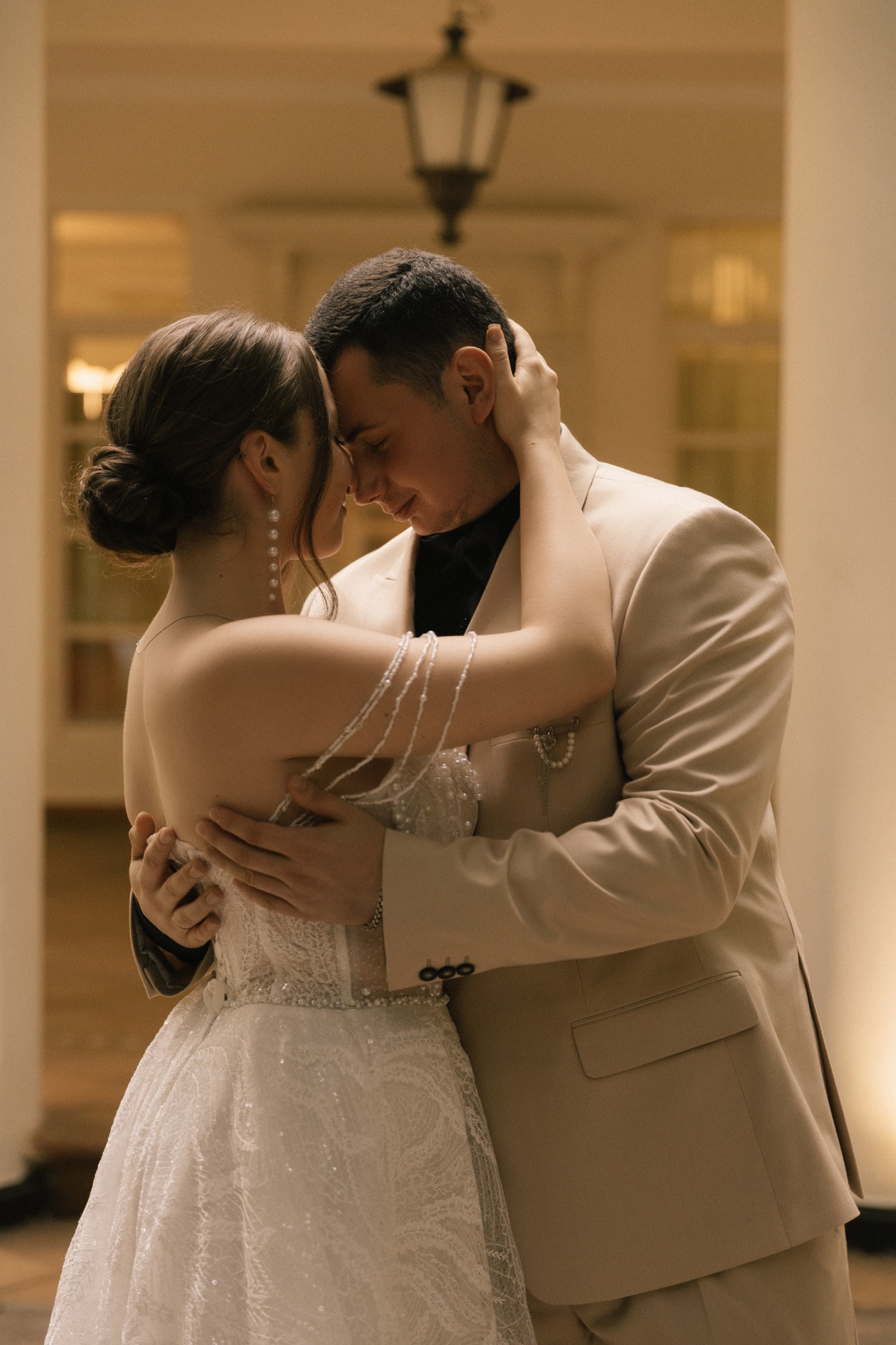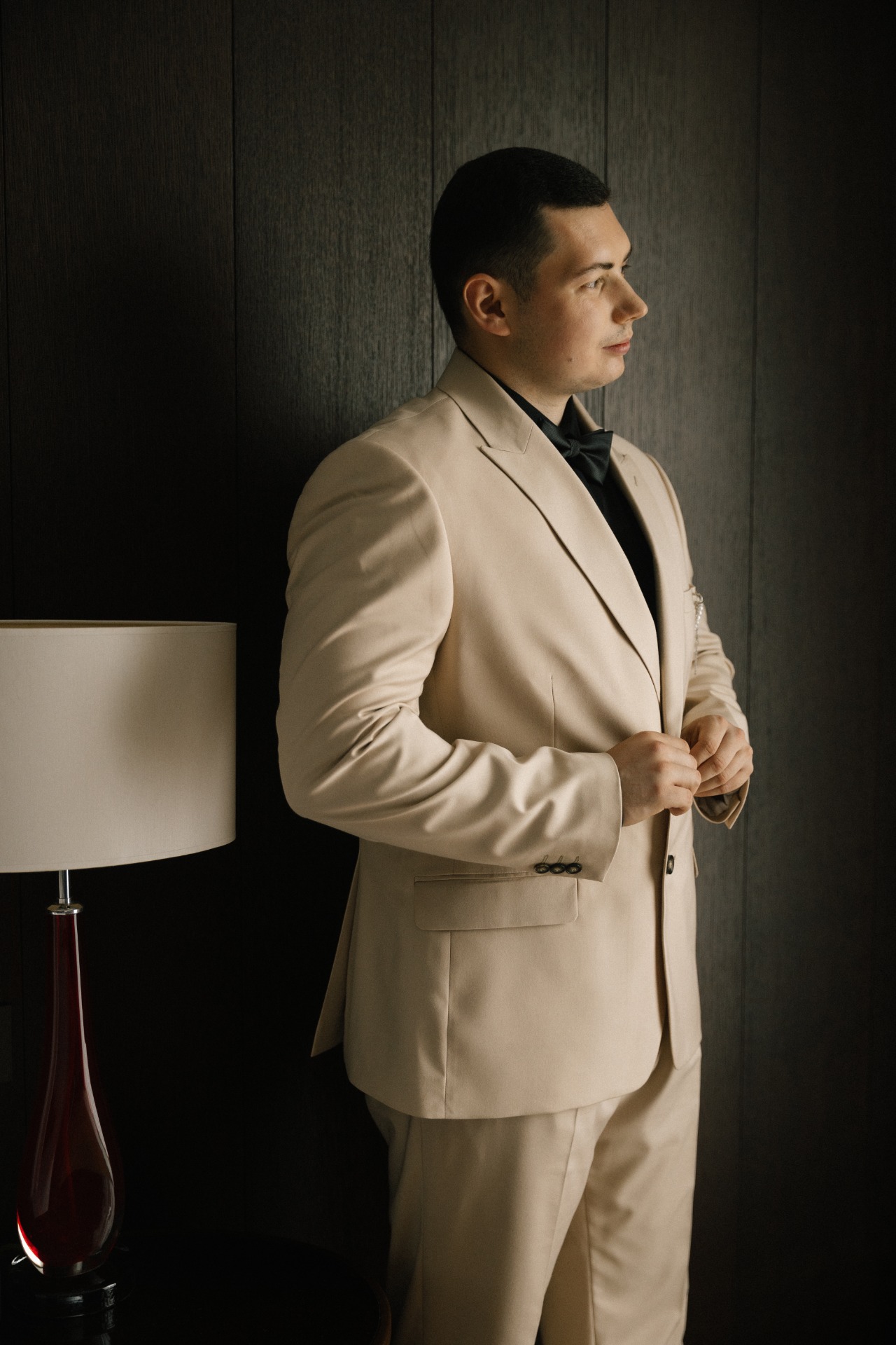 Максим тоже быстро определился с костюмом. Он сразу знал, что хочет наряд в бежевых тонах и обязательно с бабочкой. Мы долго думали над цветом рубашки и бабочки и остановились на чёрном — получилось очень лаконично и отлично подходило под стиль нашей свадьбы.