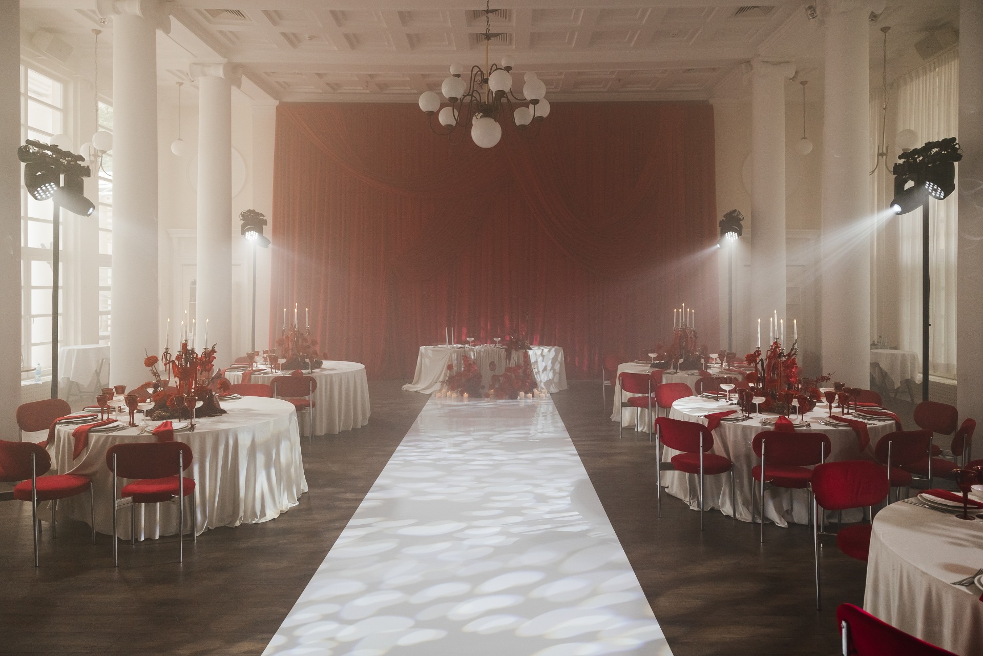 Мы предложили организаторам референсы и изначально думали делать свадьбу в стиле бохо. Но для площадки этот стиль не подходил, поэтому мы остановились на более благородном оформлении, полностью доверившись декораторам.