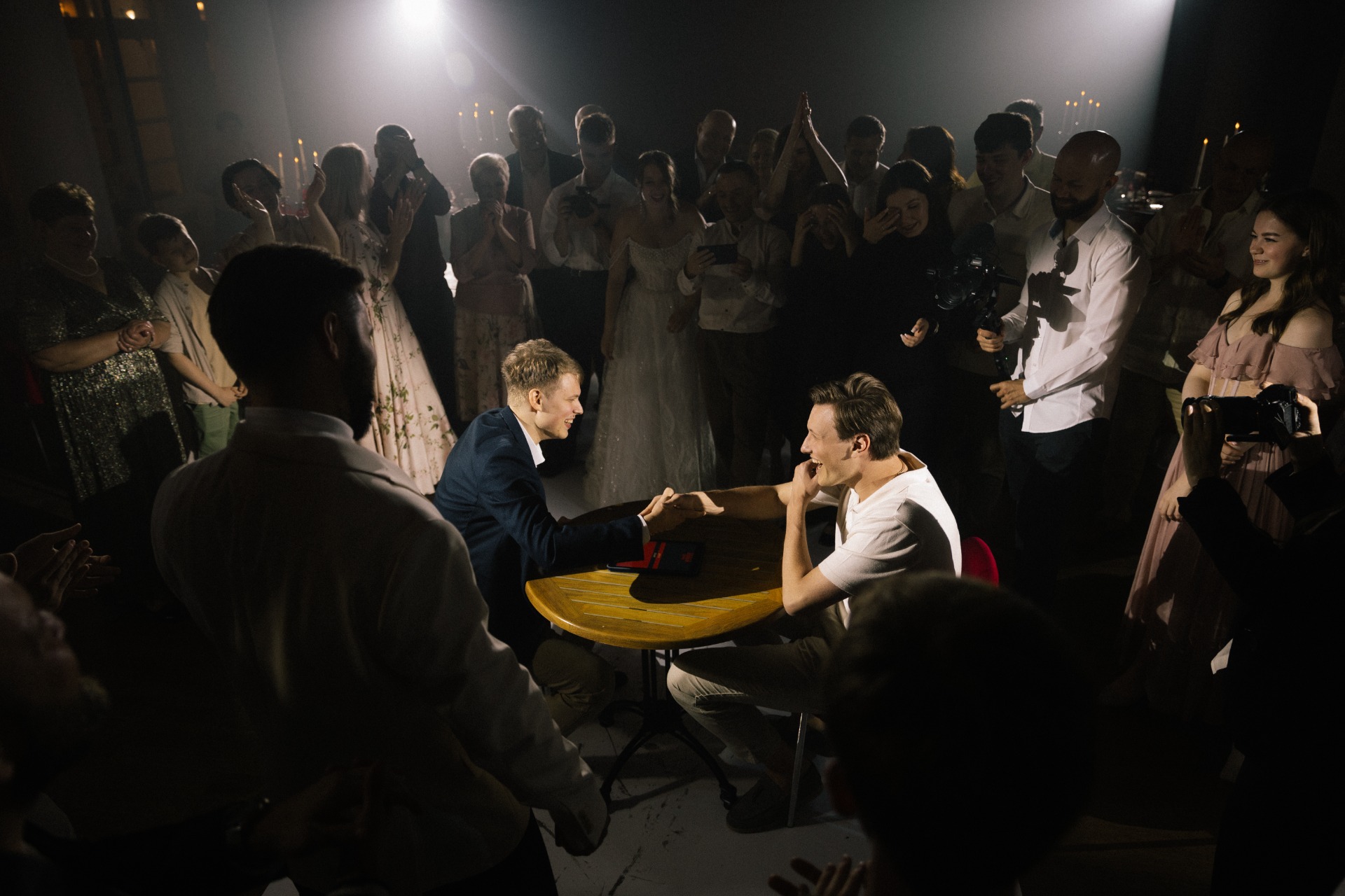 Одной из фишек нашей свадьбы стал розыгрыш бутоньерки. Друзья жениха должны были играть в игру, где нужно было быстро нажимать на экран, чтобы занять всю территорию. Обстановка была очень напряжённой. Мой брат выиграл бутоньерку под крики «Я русский» и соответствующую песню.
