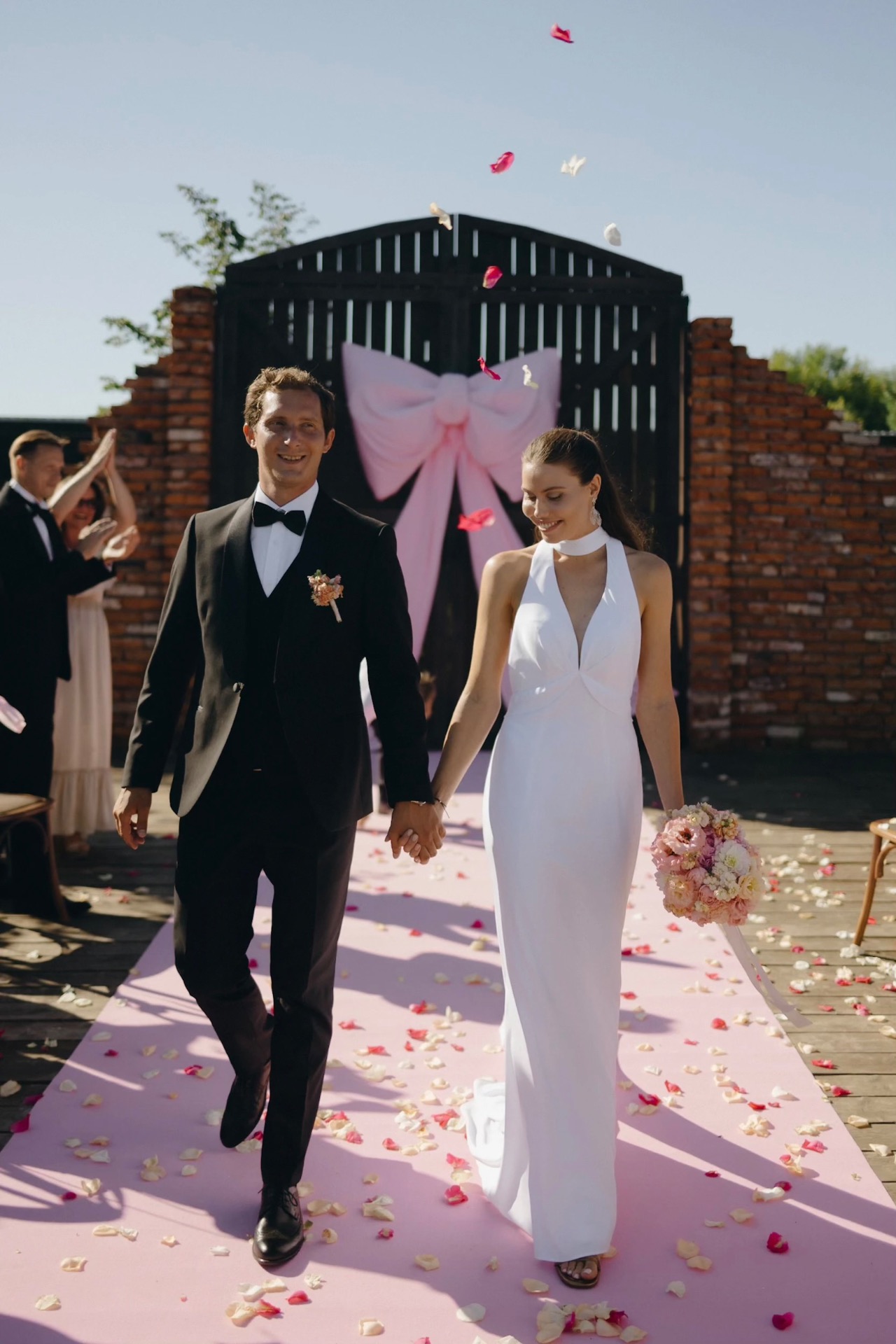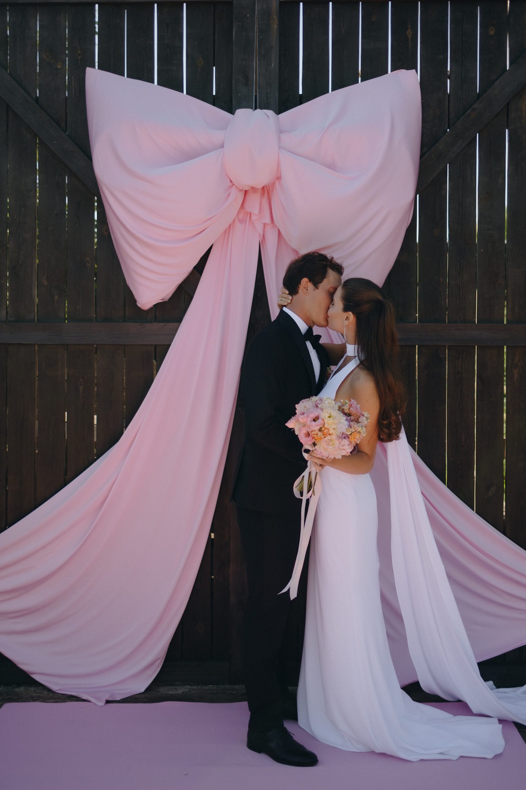 Единственное, что заняло больше времени — поиск площадки. Мы объездили четыре варианта, и только пятое место действительно откликнулось. Как только мы его увидели, сразу захотелось добавить сочных красок. Долго думали, как оформить выездную церемонию, не хотелось цветов и чего-то банального. Так родилась идея с розовым бантом. Кстати, розовый — любимый цвет Миши, и он стал главным акцентом!