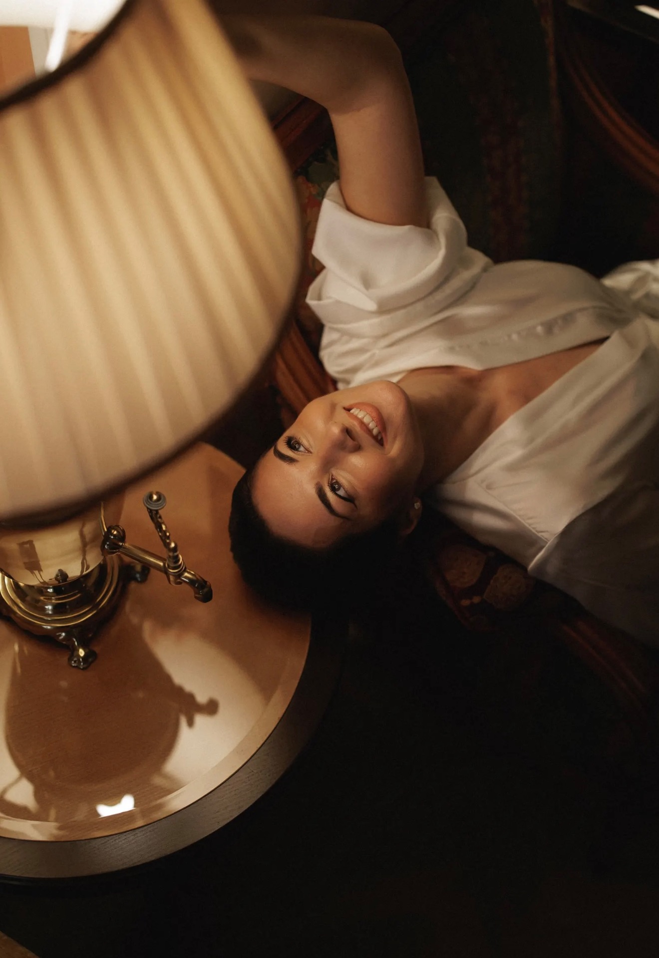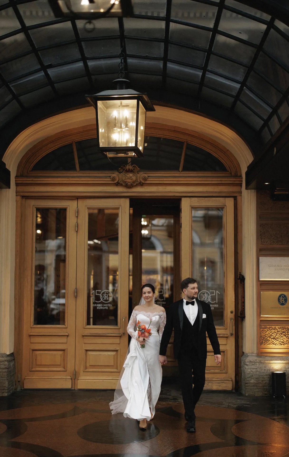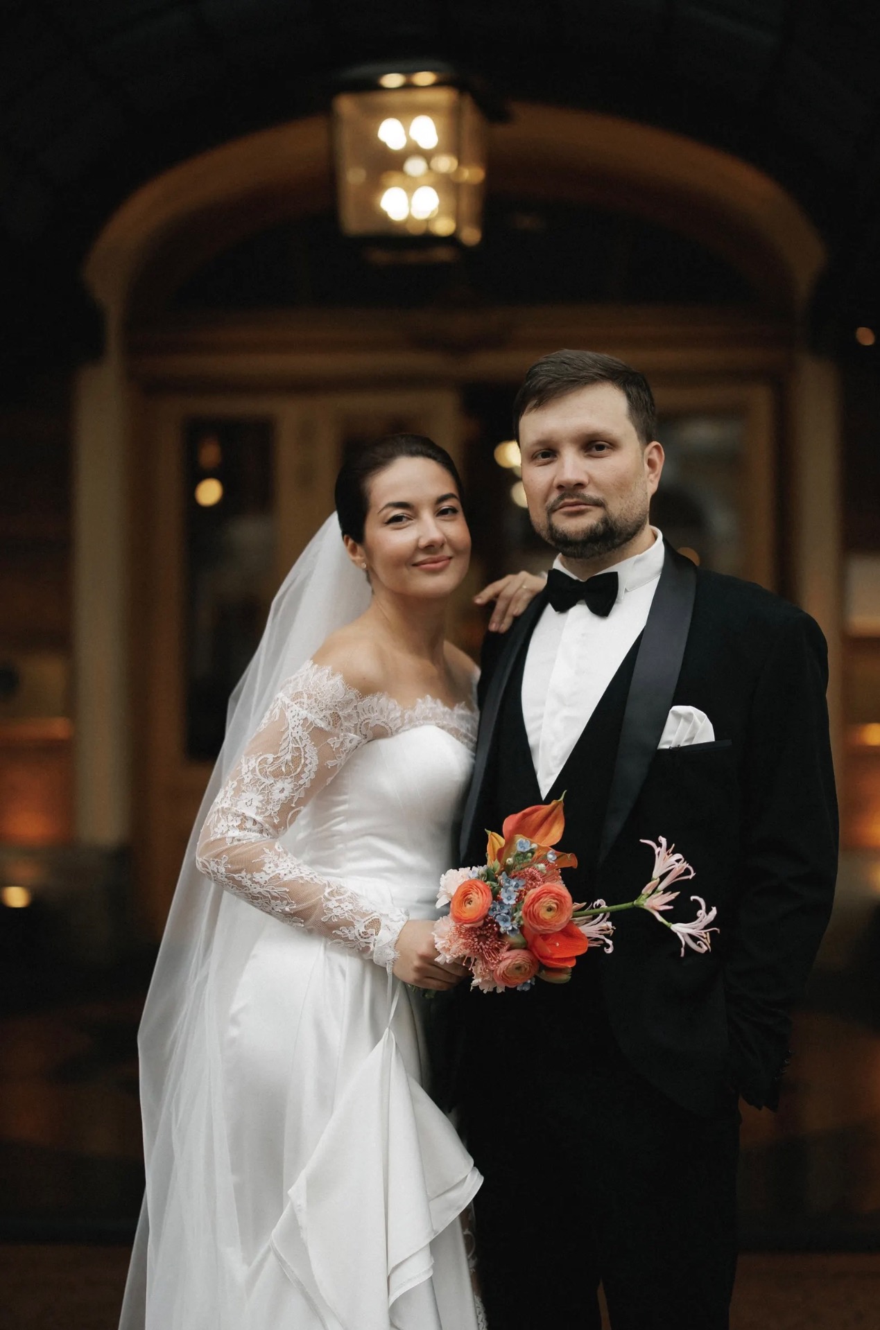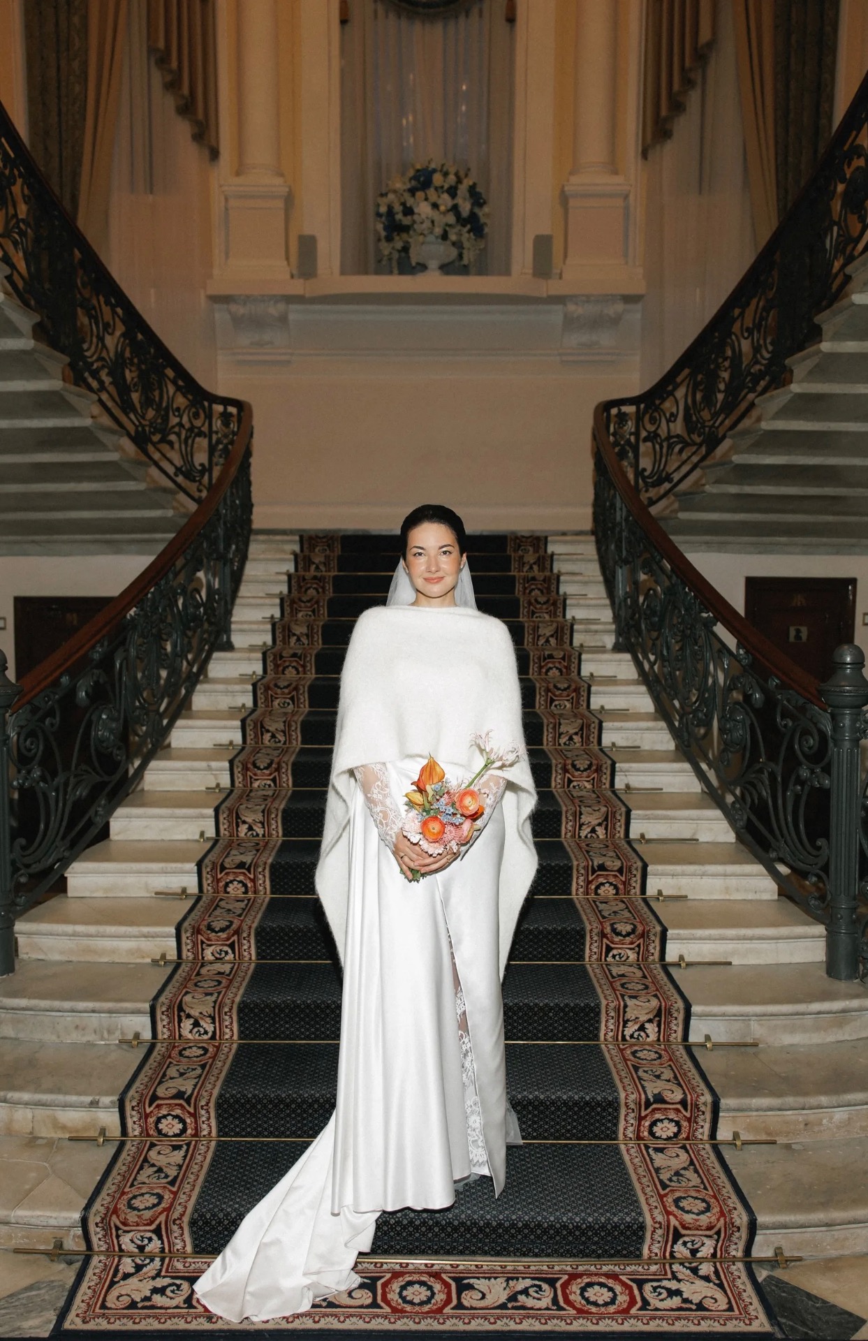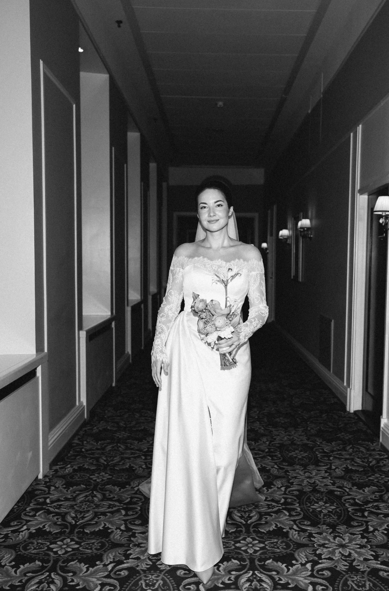 К моменту выезда в ЗАГС и вечернего ужина мы преобразились, отдав дань торжественности. Я выбрала силуэтное платье в пол с кружевным декольте — оно добавляло образу чувственности и элегантности. Фата привнесла классическую свадебную ноту, а пучок подчеркнул линию шеи и завершил образ. Для выходов на улицу я дополнила образ вязаной накидкой из белоснежного меха альпаки, она стала не только тёплой, но и очень тактильной деталью.