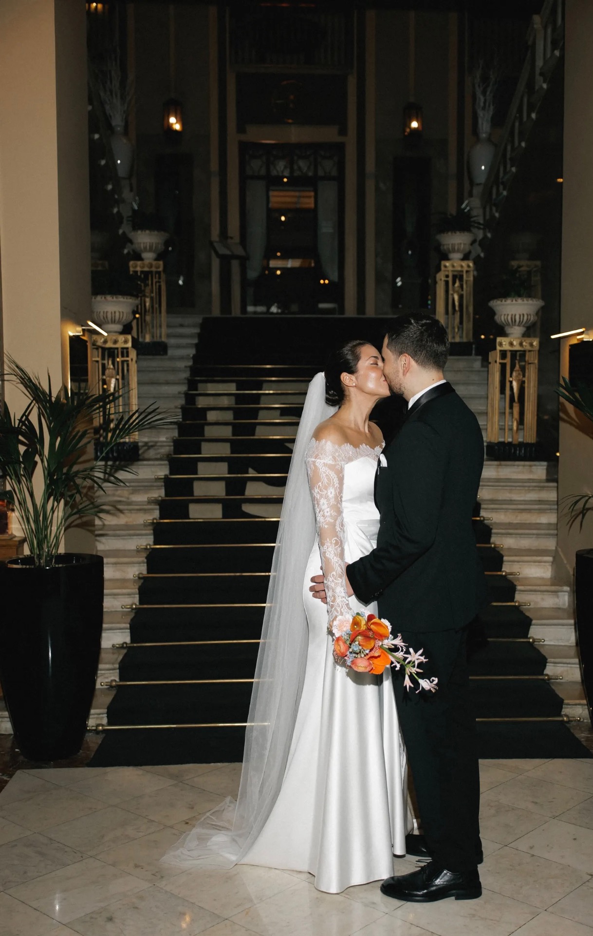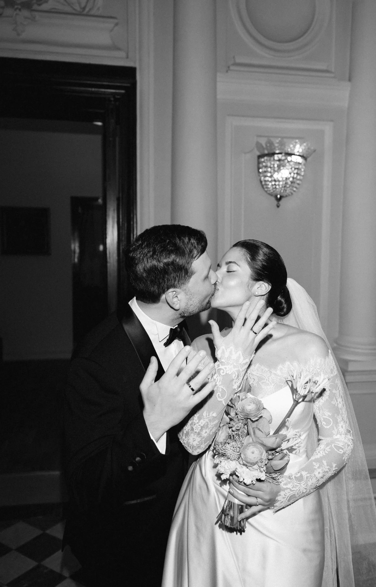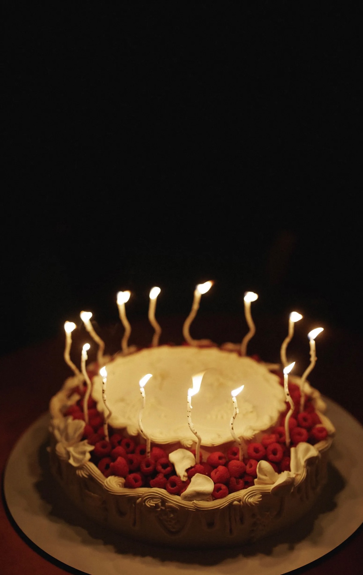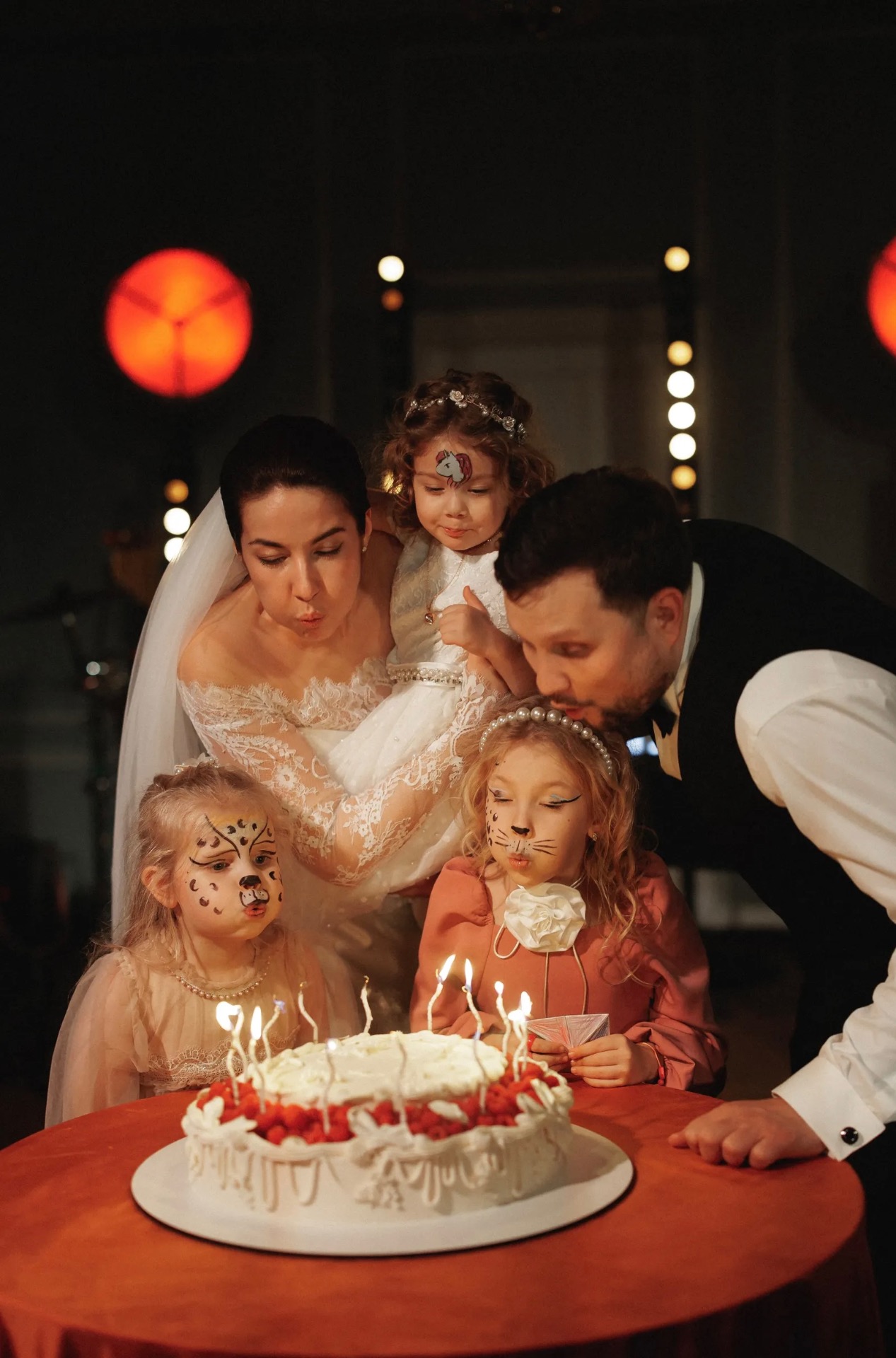 Церемония, проведённая прямо среди ужина, в окружении сотен свечей, стала моментом настоящей магии. А завершением вечера стал торт — утончённый, с декором, продолжающим лепнину зала, украшенный сочной малиной.