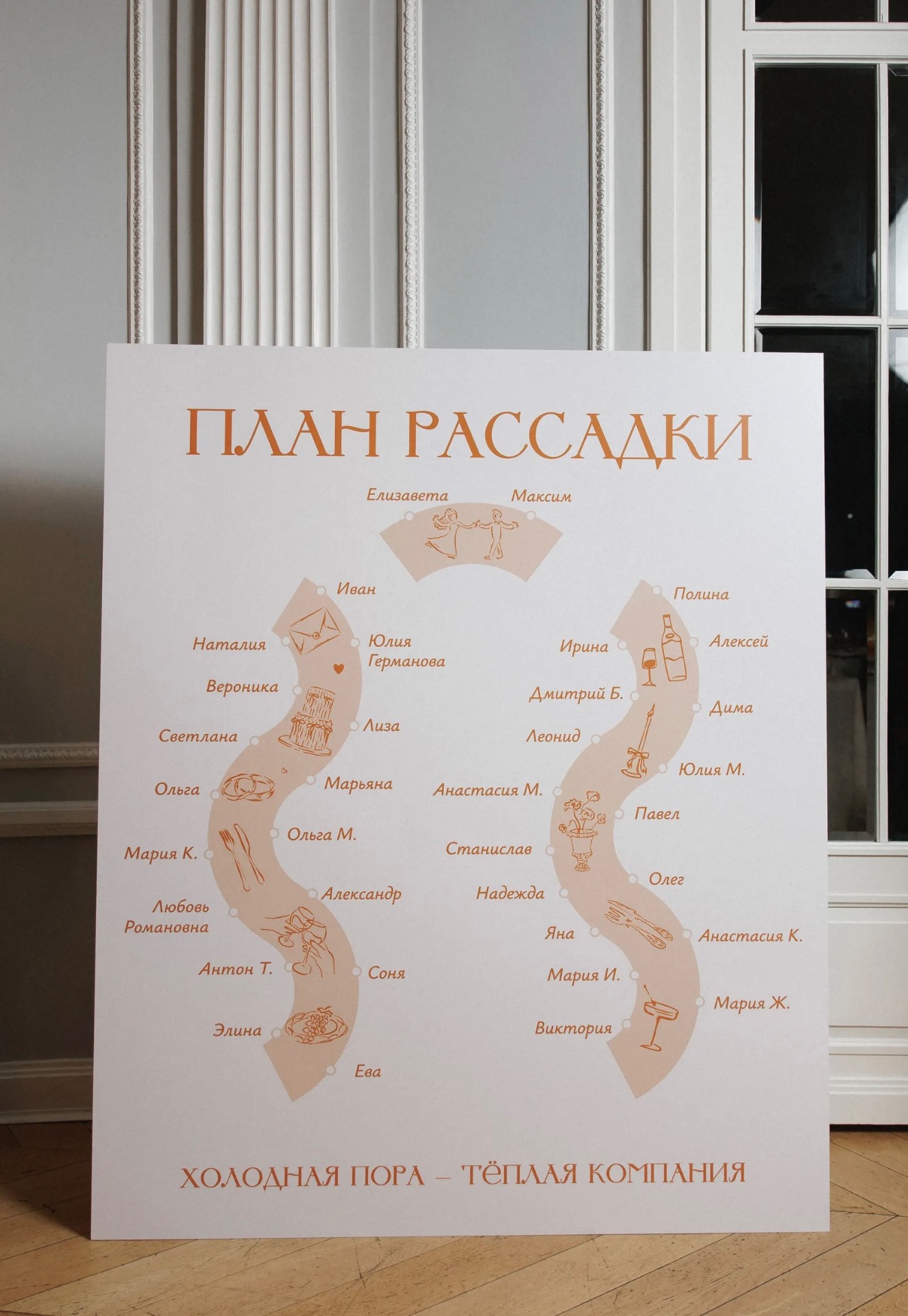 Мы уделили особое внимание целостности пространства. Меню и план рассадки повторяли плавные формы столов. Для каждого гостя мы подготовили маленький сюрприз — печенье с предсказанием.