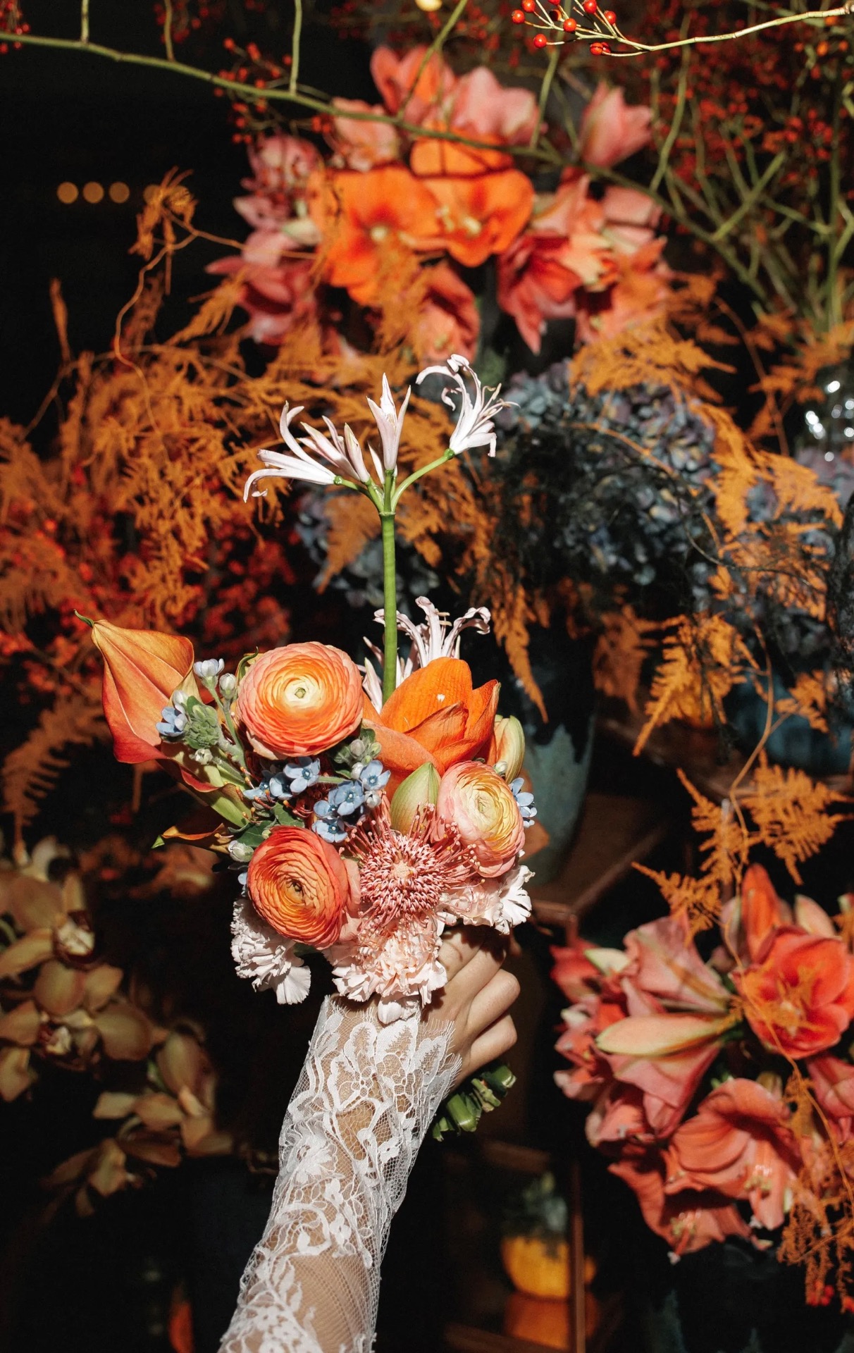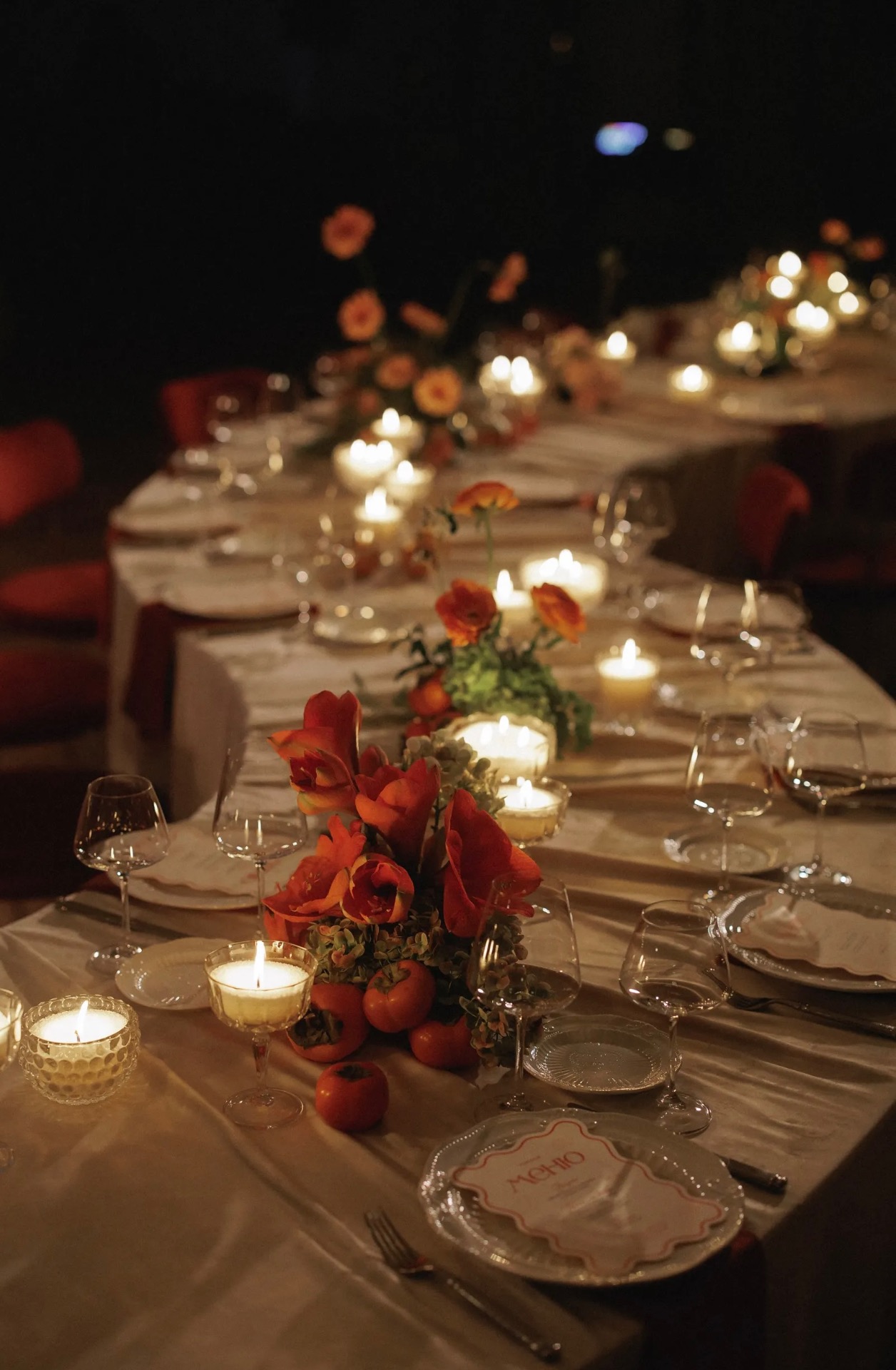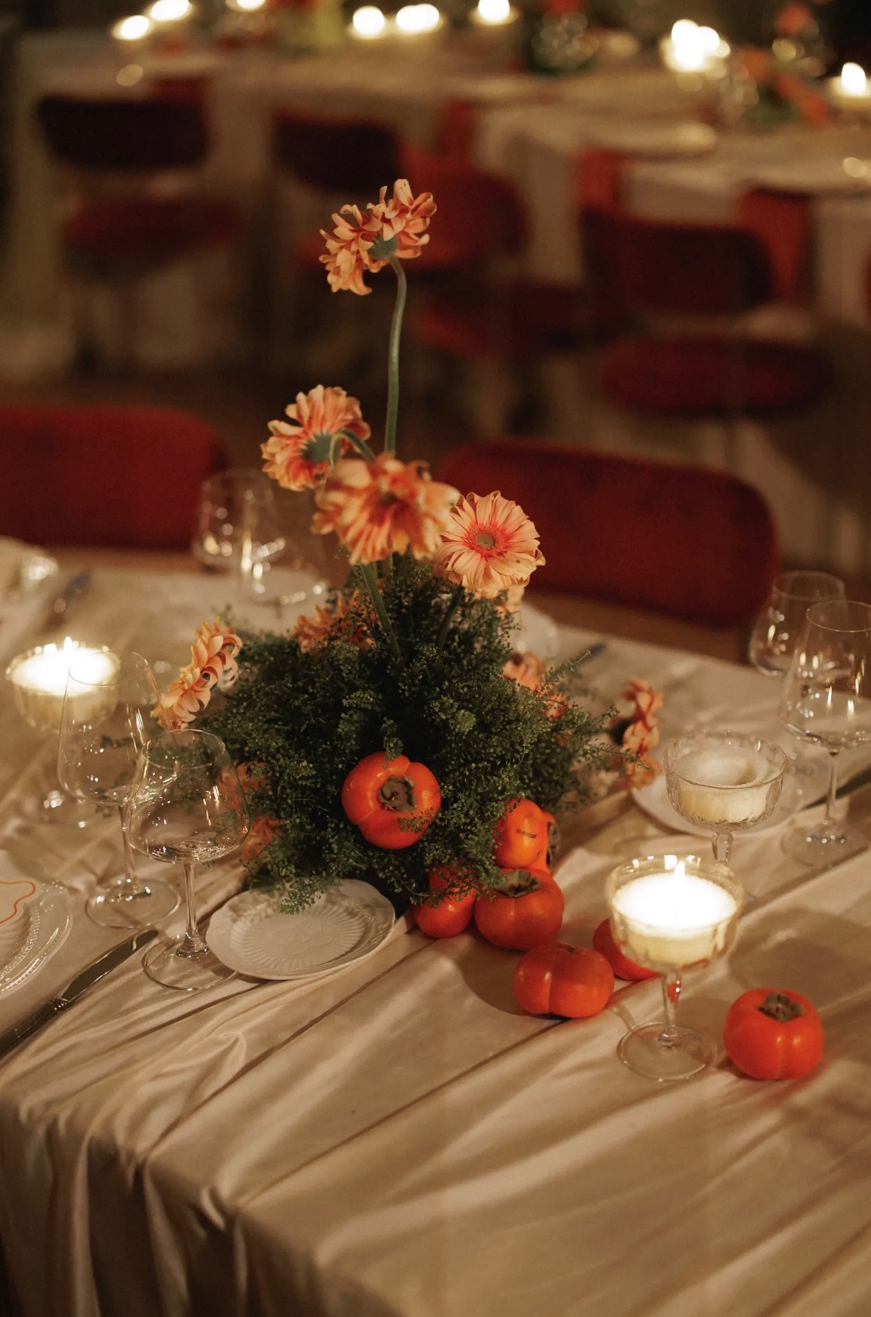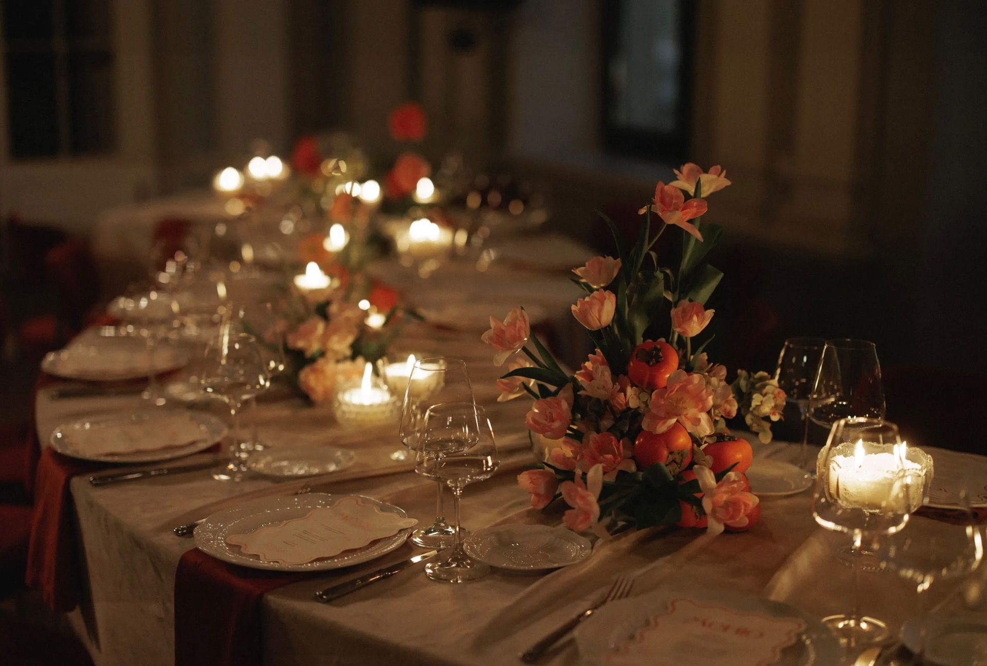 Местом торжества стал особняк Путилова — истинно петербургская площадка с историей. Декор стал продолжением этой идеи: множество свечей в хрустальных креманках разливали по залу мягкий, дрожащий свет, создавая атмосферу камерной таинственности. Мы выбрали яркую флористику, композиции с сочной хурмой добавляли тёплые, солнечные акценты, словно напоминание о тепле среди ноябрьской прохлады.