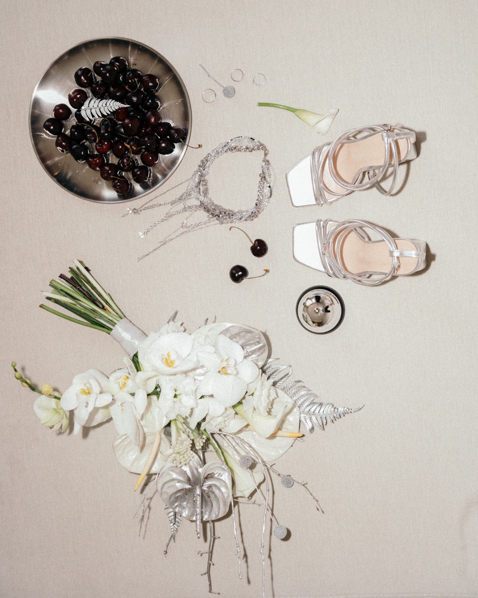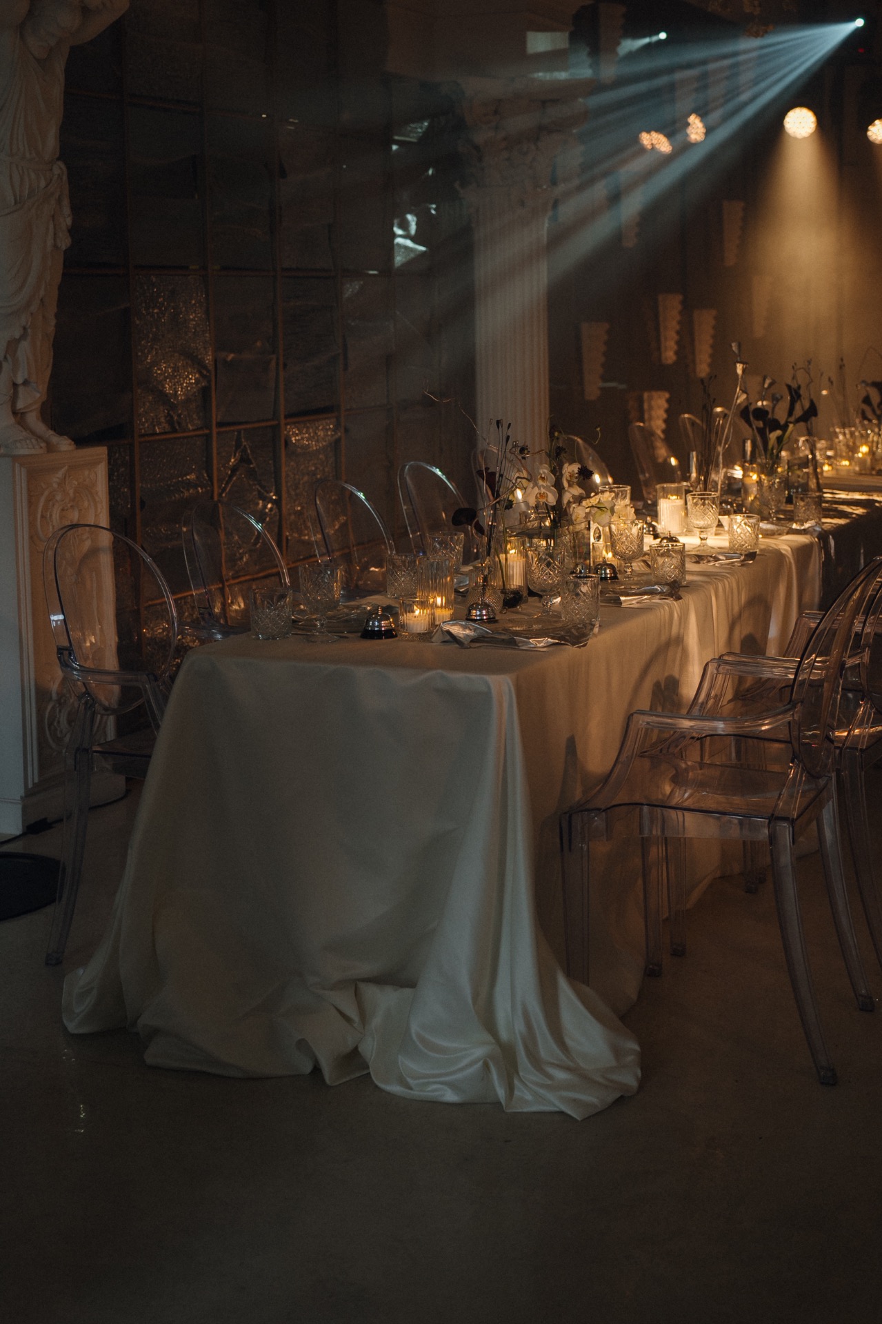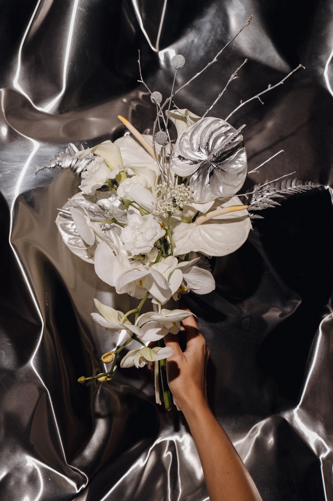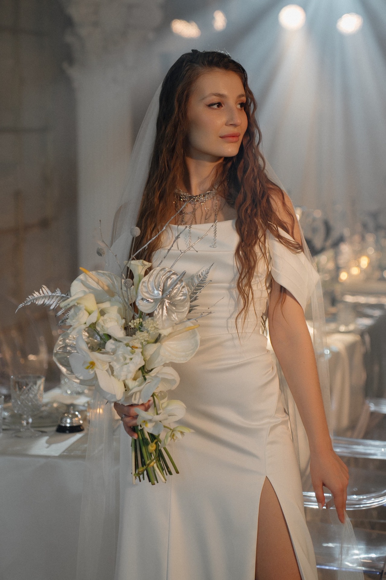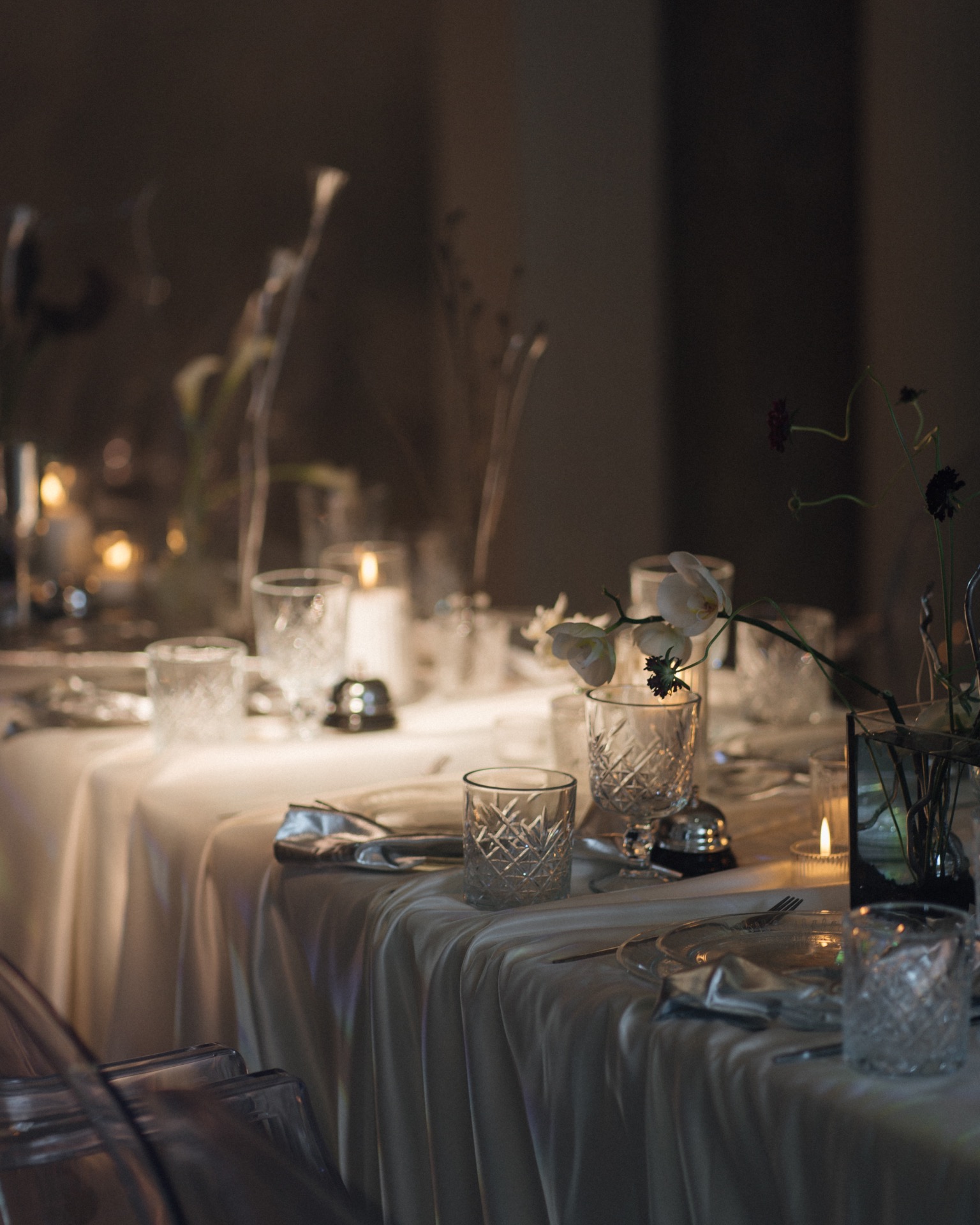 Мы выбрали концепцию «Дзынь» по мотивам нашего любимого мультика «Монстры на каникулах». Она обрастала всё новыми деталями, нашими «фишками», чтобы всё было про нас и каждая деталь передавала свой смысл. Так в нашей палитре появился мой любимый серебристый цвет, а также мы разместили звоночки в подарок каждому гостю. Классическая флористика переплеталась с посеребрёнными веточками, напоминающими готический лес, а на столах мы установили аквариумы с живыми рыбками, в которых отдельно располагались цветочные композиции.