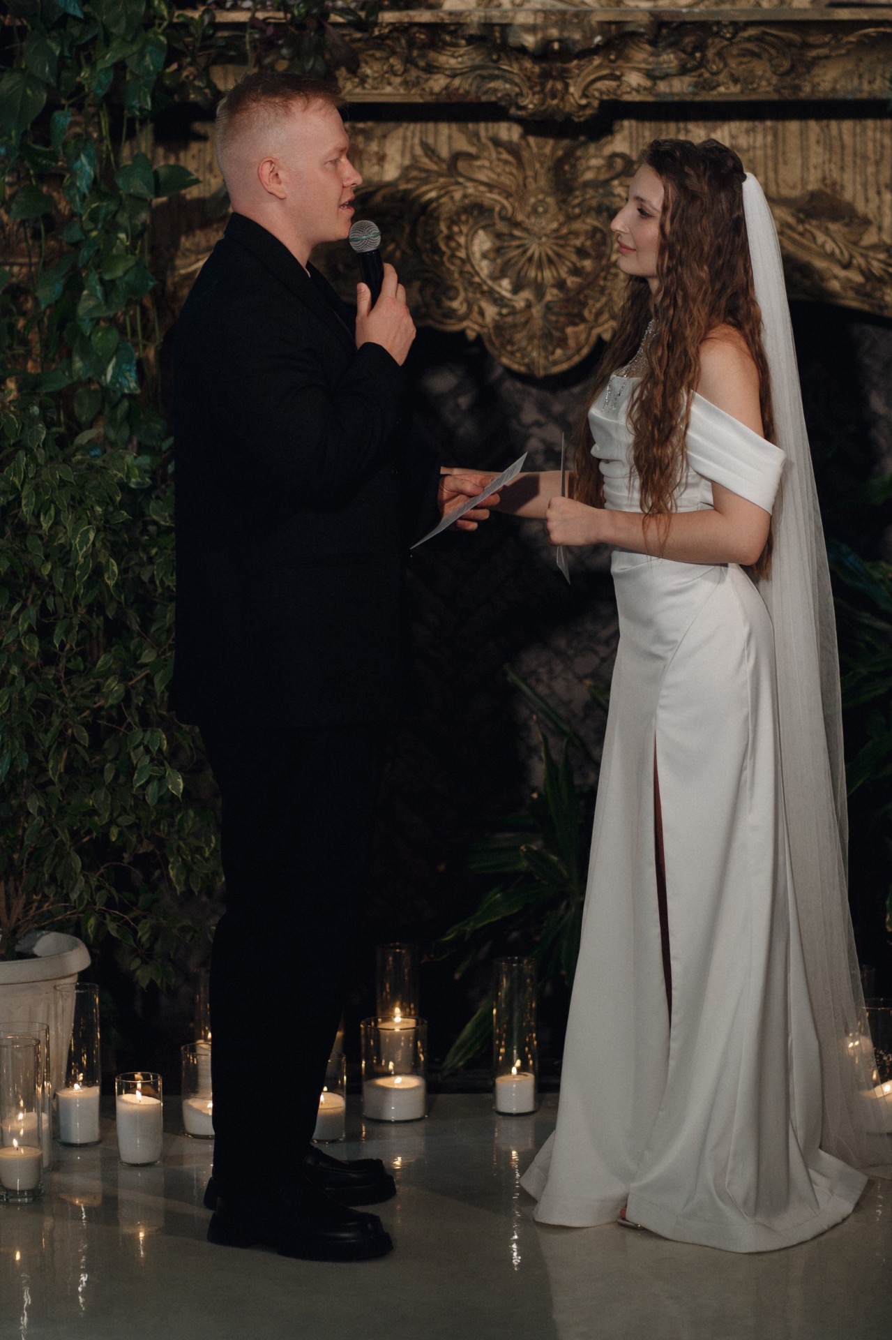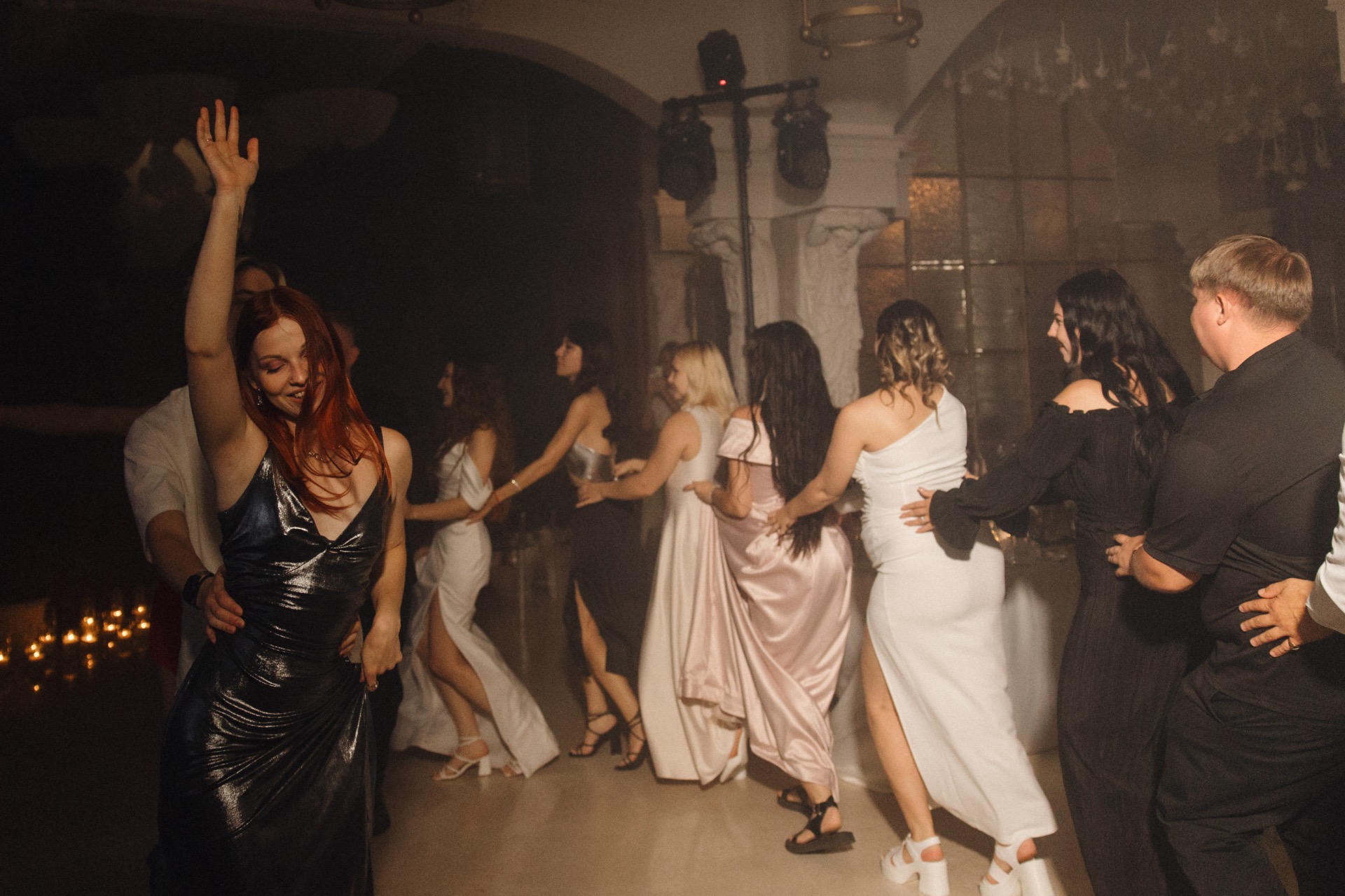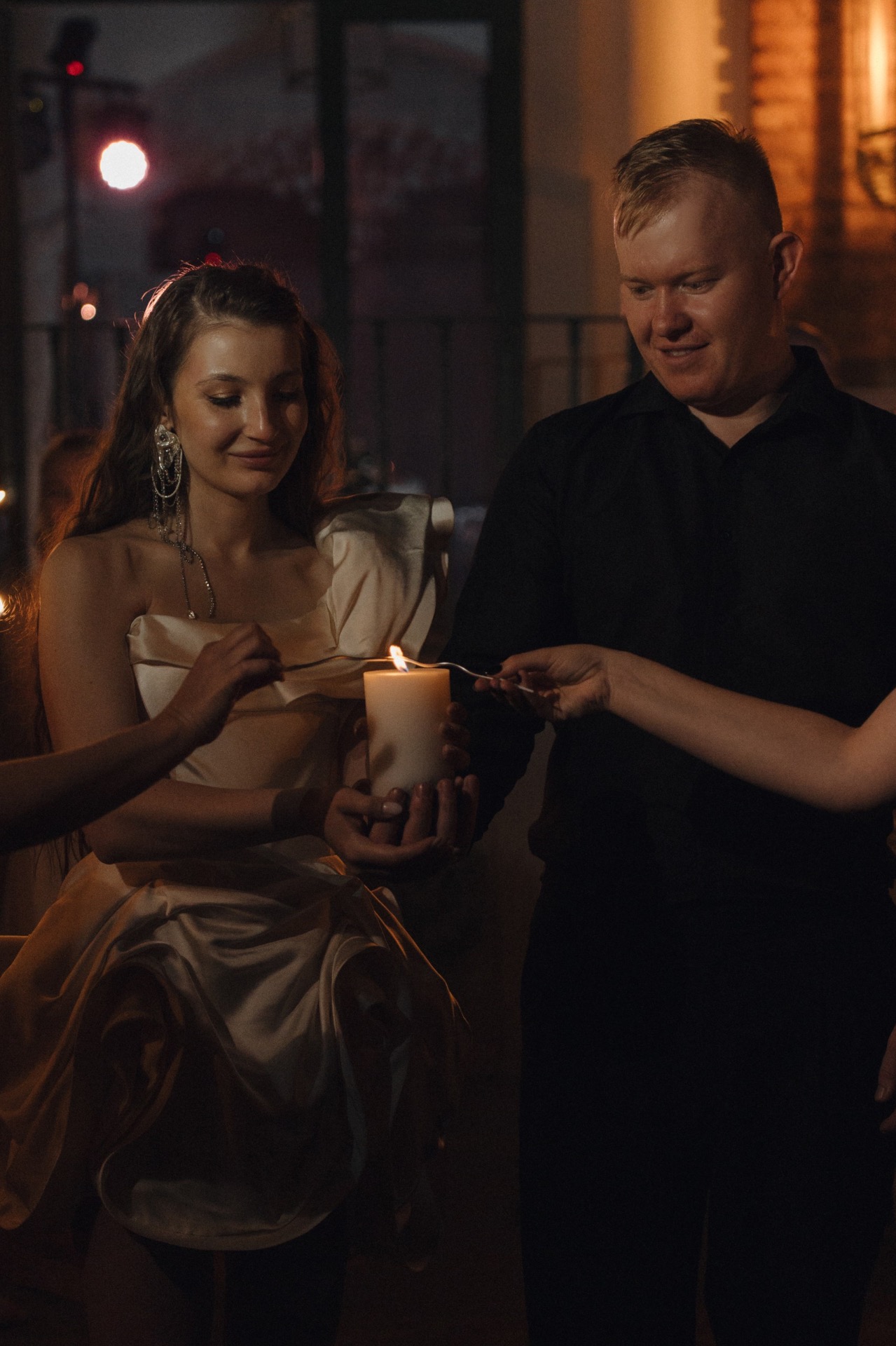 В завершение вечера у нас была церемония со свечами. Мы изменили классический ритуал «очага» и внесли в него свою изюминку: каждому гостю выдали по свече, и от нашей большой свечи каждый зажигал свою. Получилось очень символично — мы будто поделились нашим семейным теплом с каждым приглашённым. А после мы загадали самые заветные желания и задули свечи все вместе.
