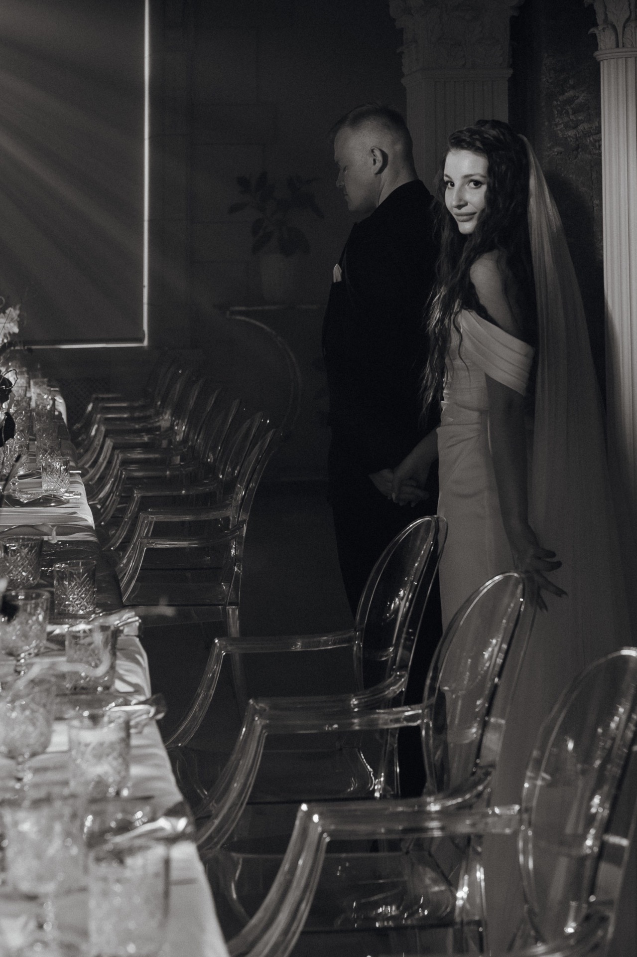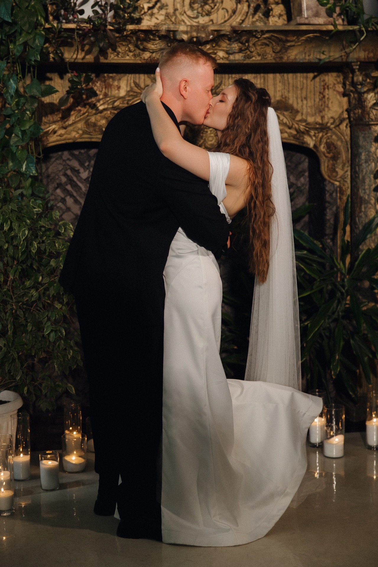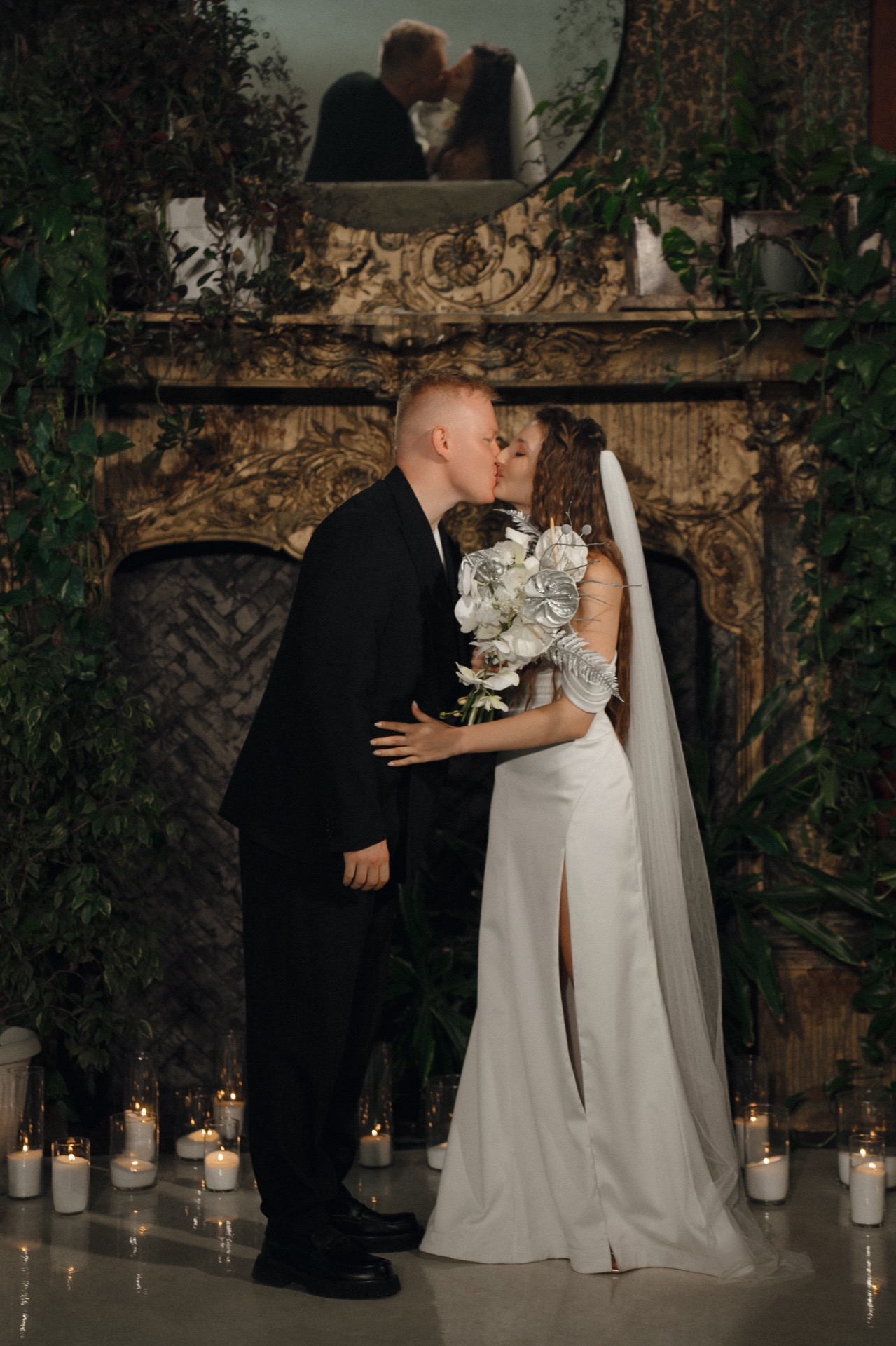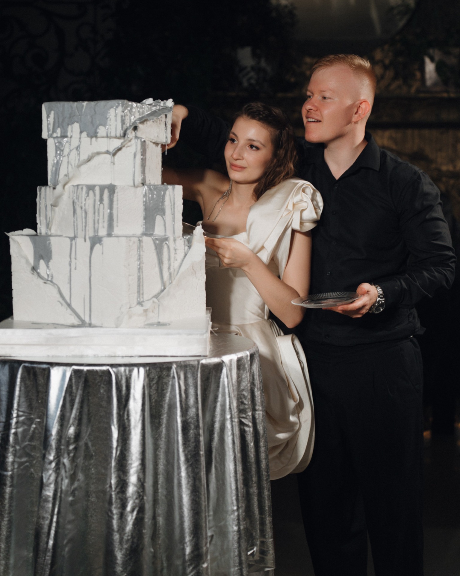 Подачу торта мы также хотели сделать интересной и запоминающейся: у нас было несколько вариантов, в том числе «безбашенных», которые не одобрила площадка. Поэтому мы остановились на квадратной форме с асимметрией, которая у нас с Виталием ассоциировалась с замком Дракулы, о котором мы мечтаем. Декорировали мы торт прямо при гостях, поливая его серебряной глазурью под музыку.