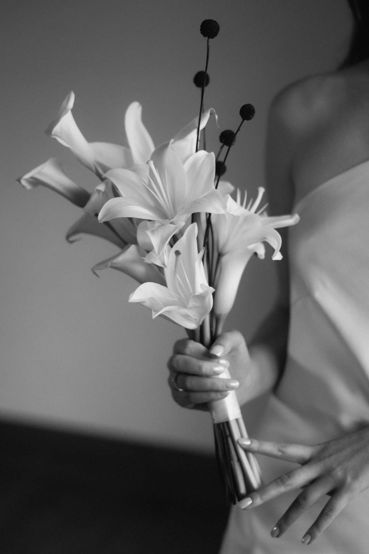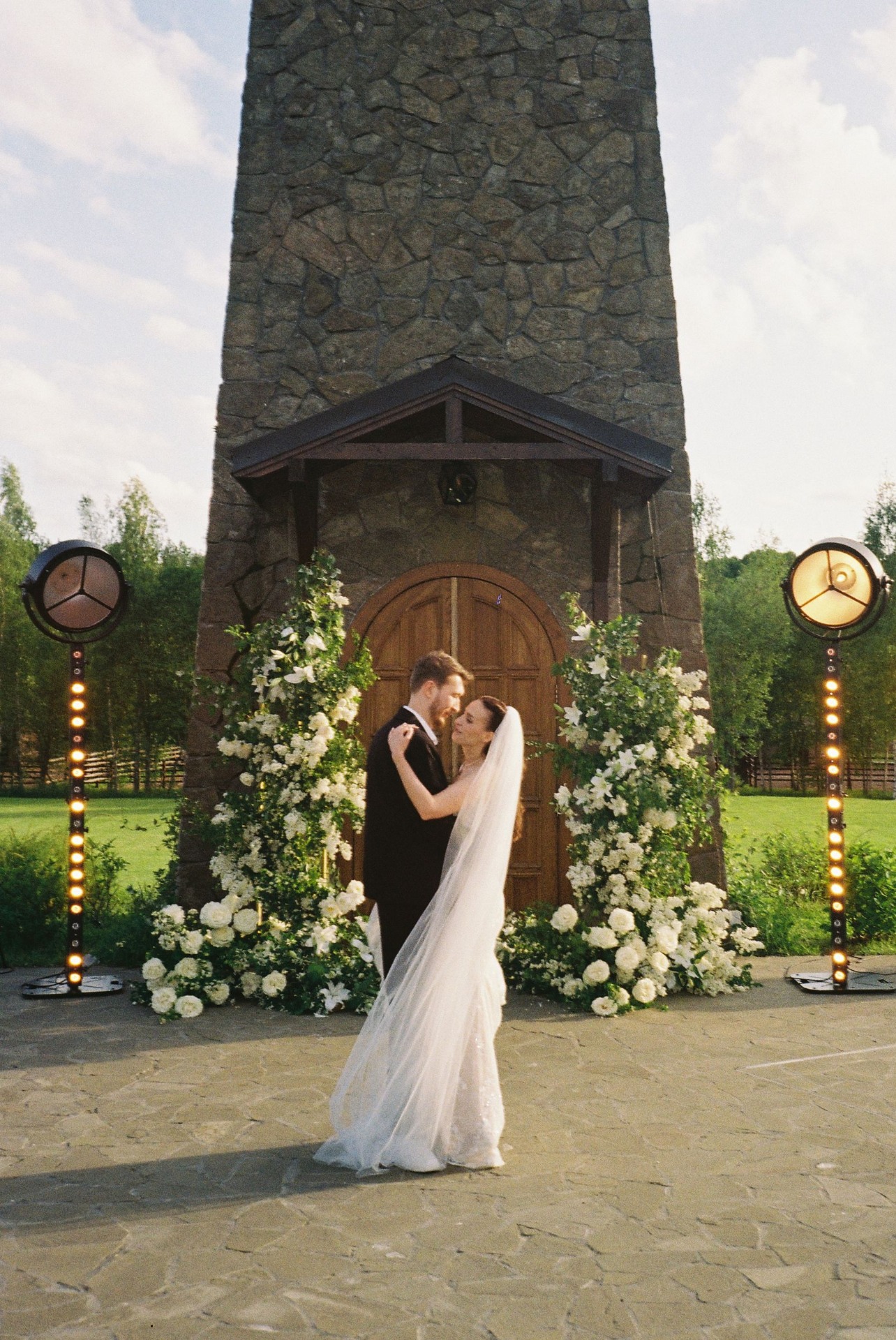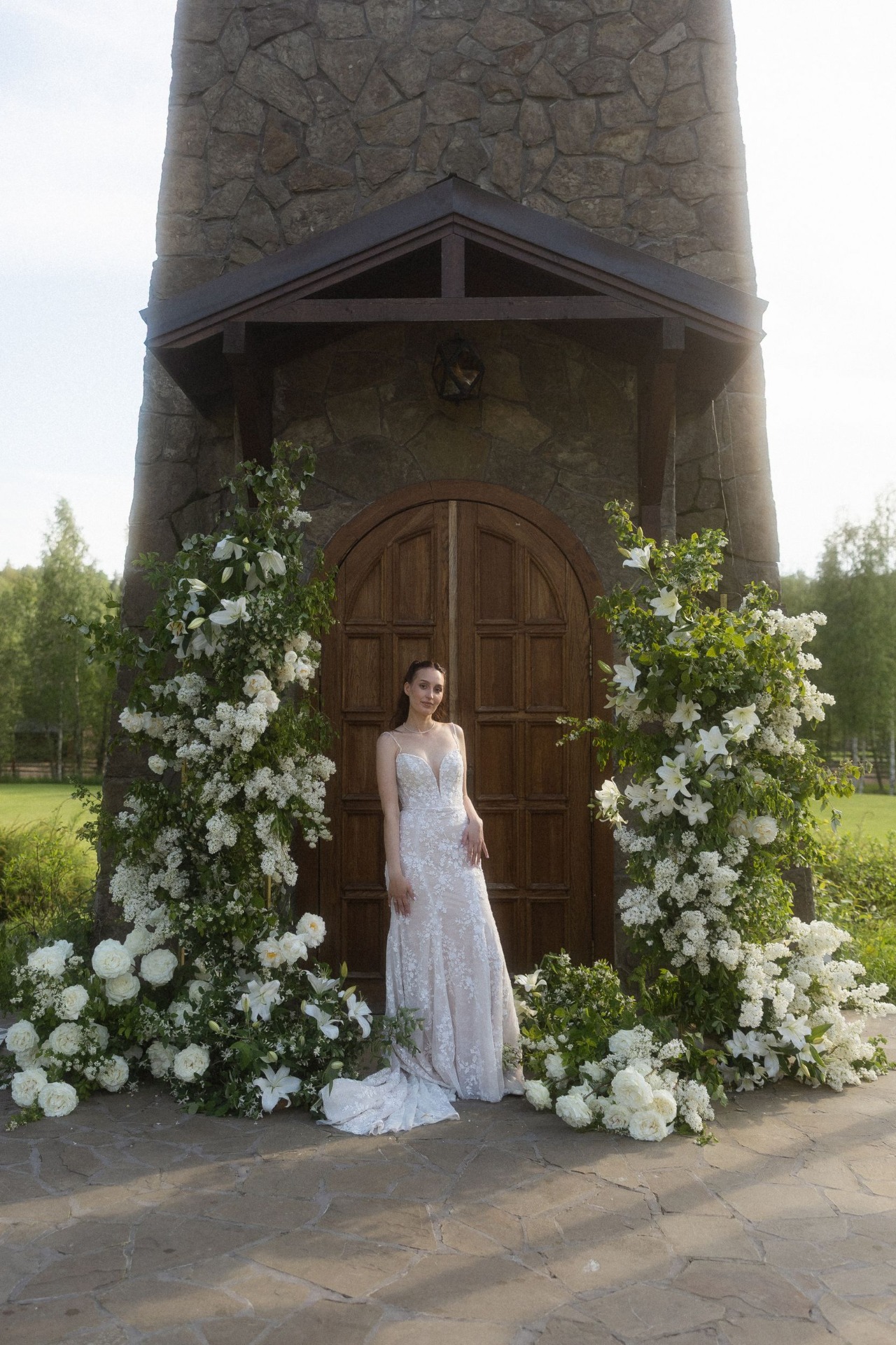 Палитра зелёного, белого и чёрного задала настроение свежести и современной элегантности — сочетание природы, света и графики. Арку декораторы оформили густой зеленью, лилиями, пионами, розами и белой сиренью: эти цветы символизировали чистоту, мягкость чувств и живую энергию.