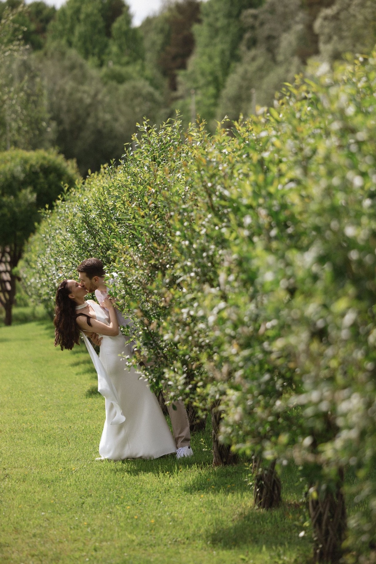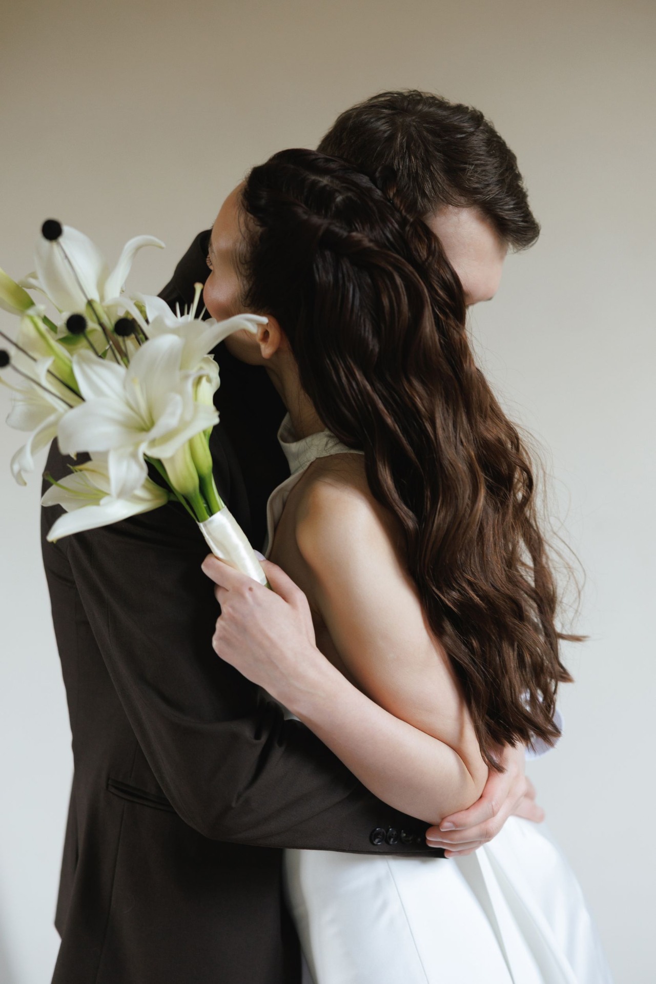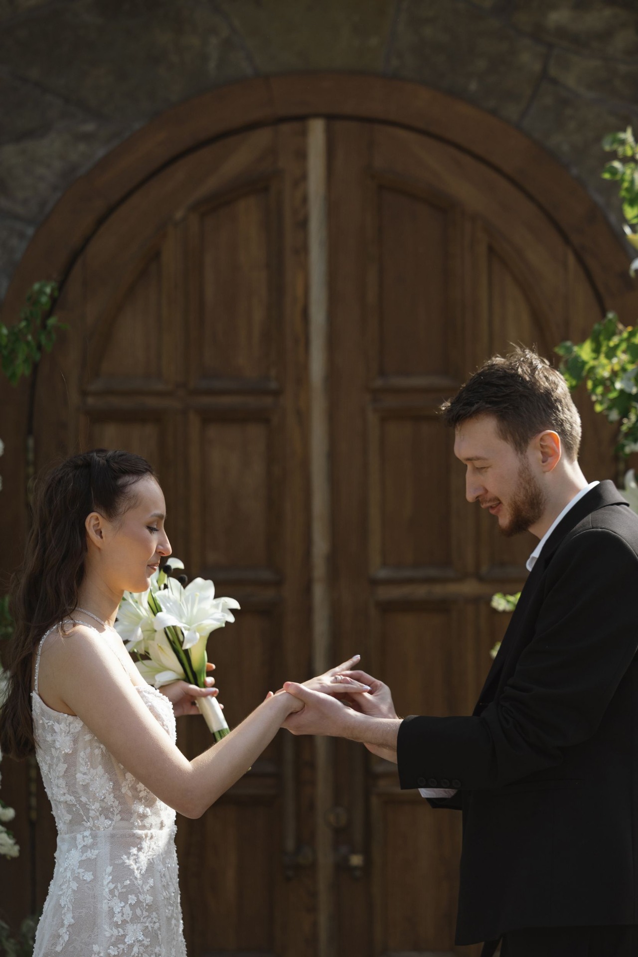 Жених был в светлых тонах и классической белой рубашке — вместе этот дуэт олицетворял красоту в простоте и свободу в движении. Именно из таких деталей и состояло по-настоящему спокойное, осмысленное начало дня.