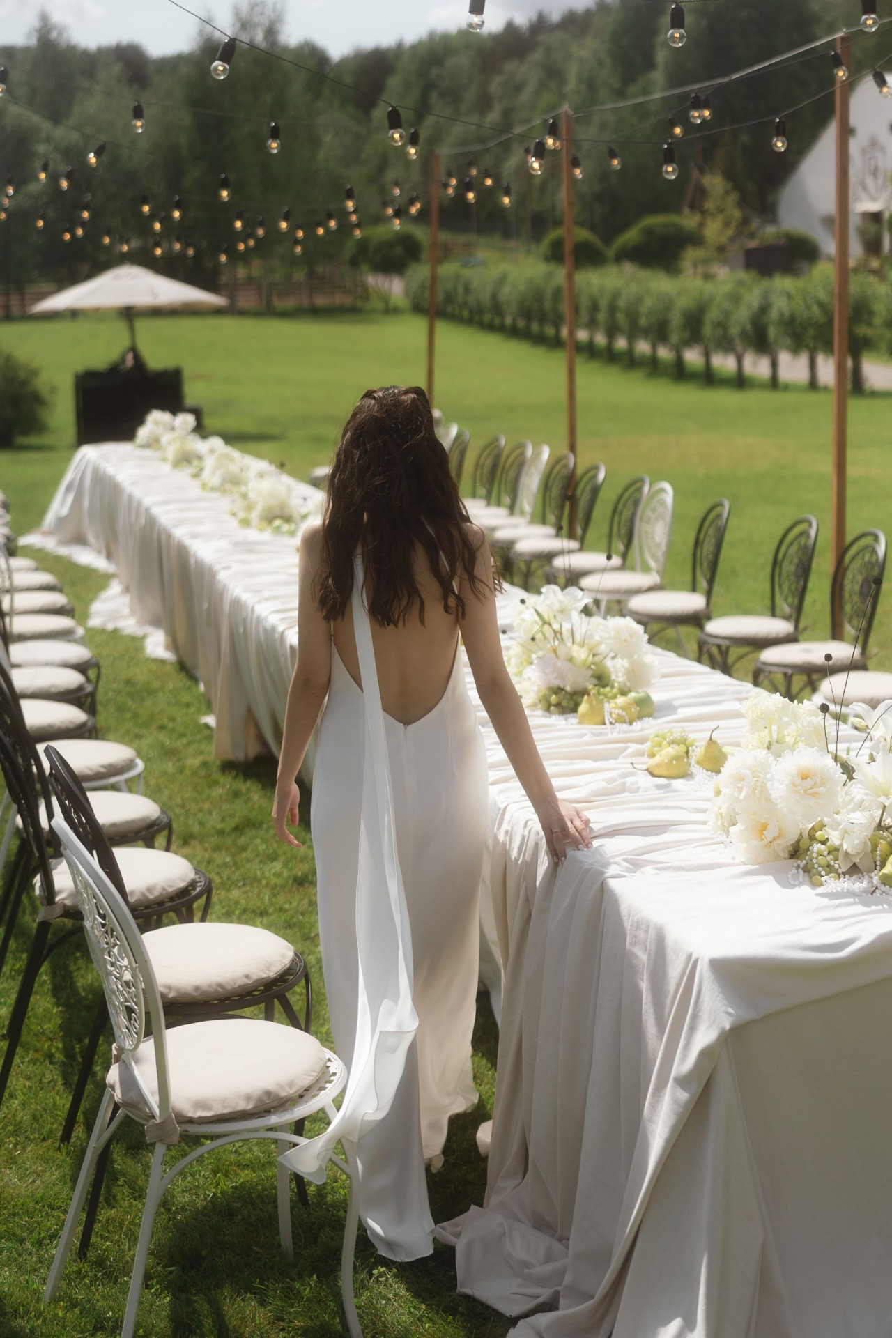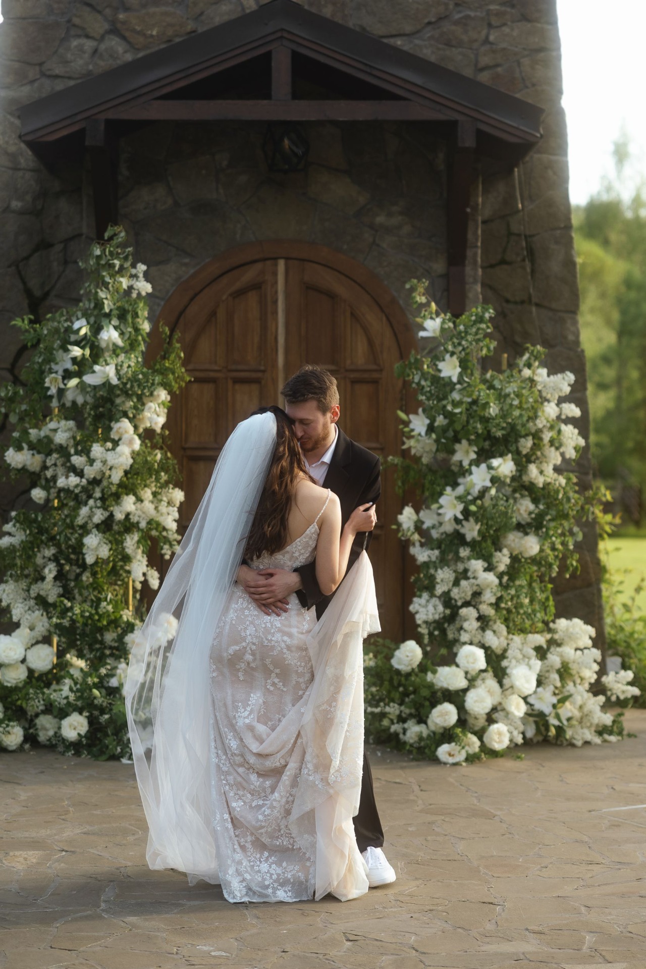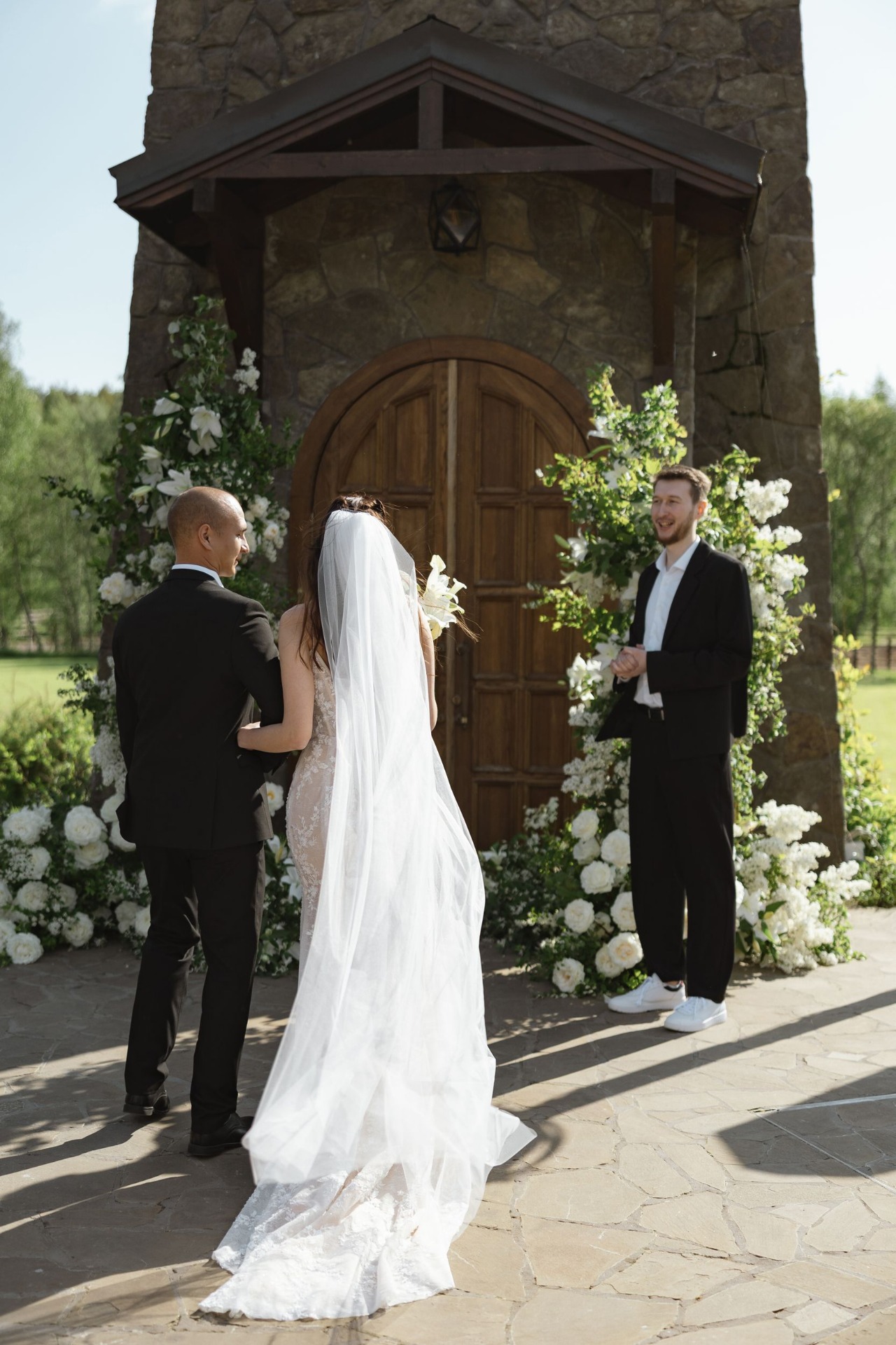 Для основного торжества невеста выбрала утончённое платье с вышивкой и декольте — лёгкое, струящееся, а длинная фата добавляла движения воздуху вокруг неё. Образ получился чистым, живым и естественно романтичным.