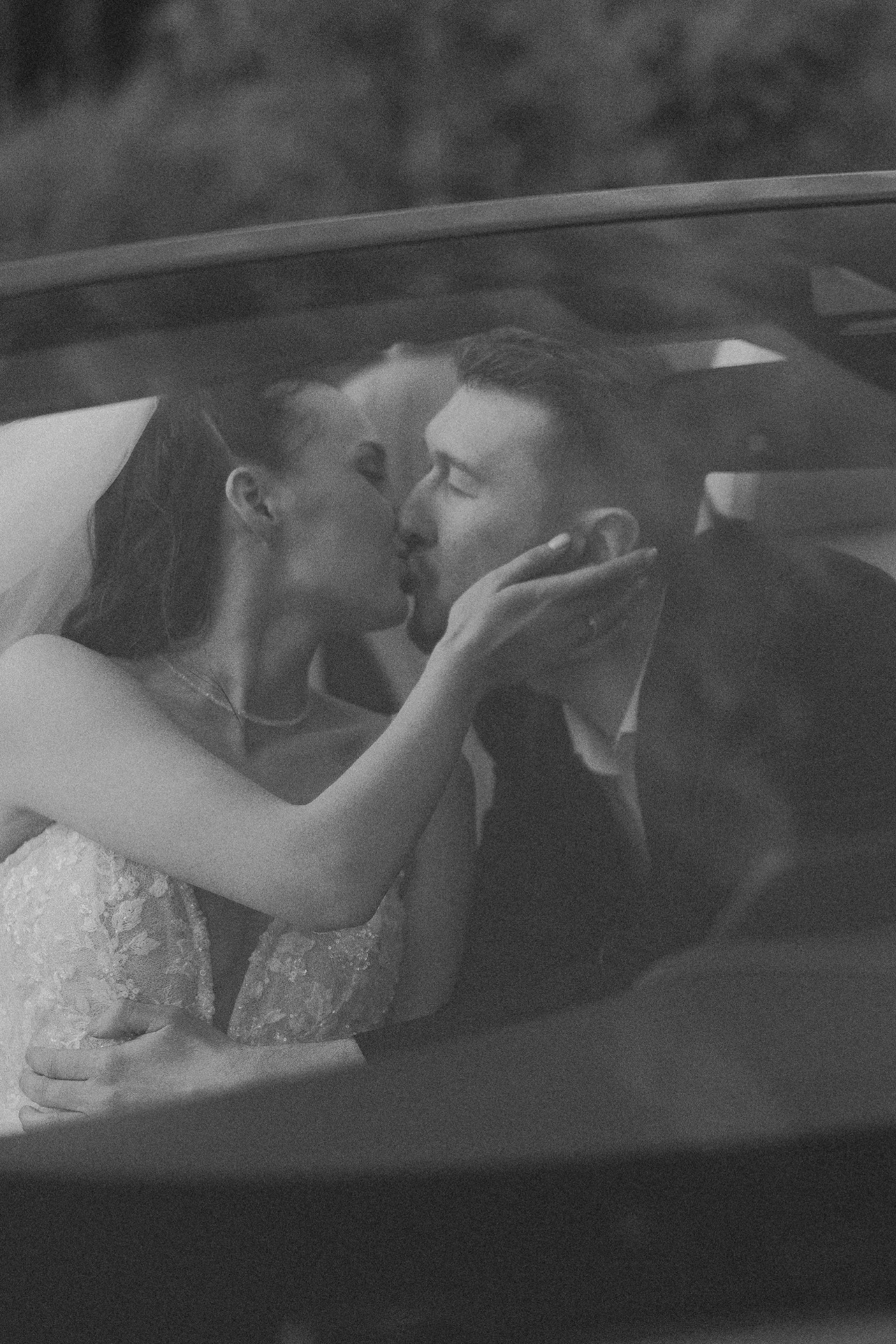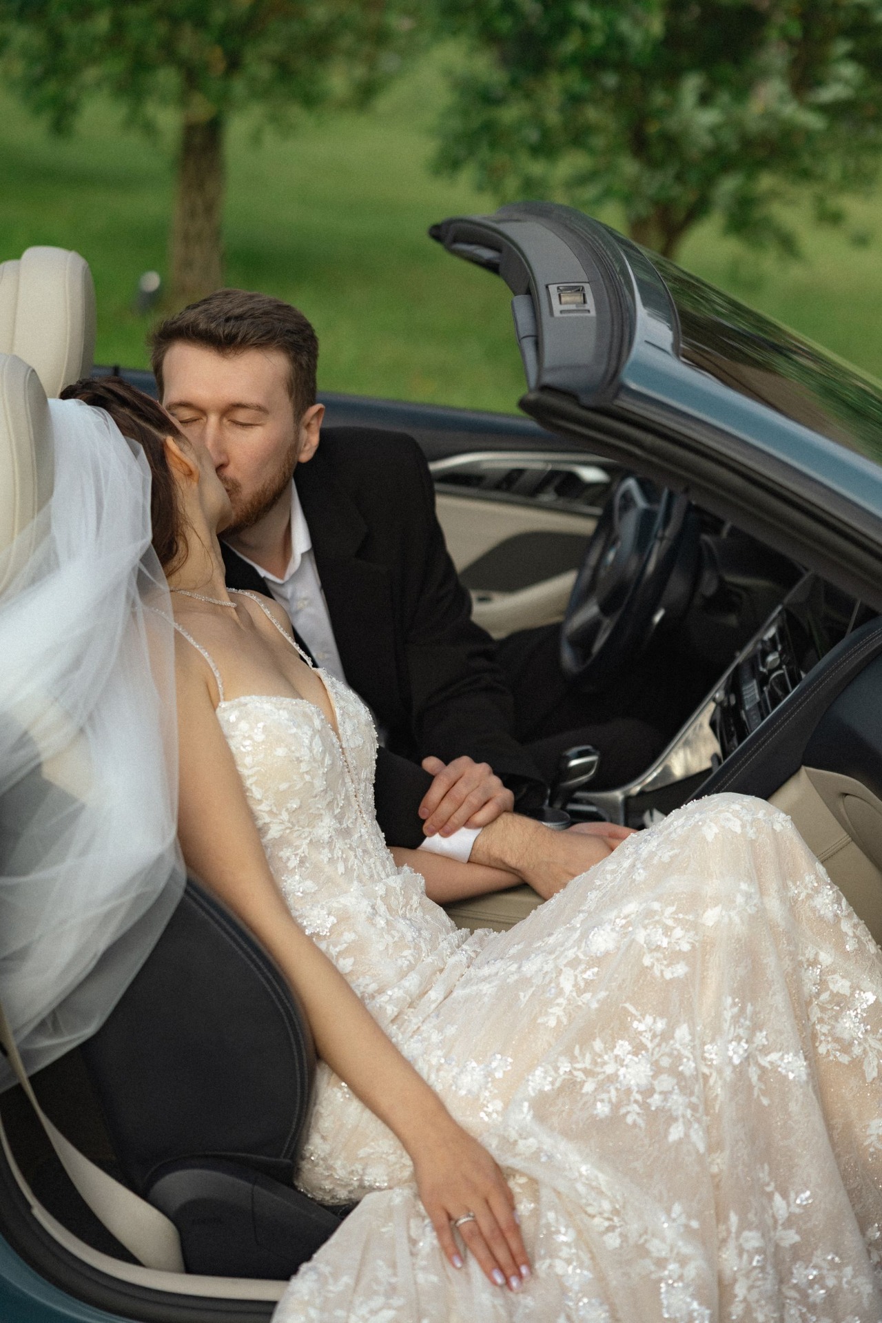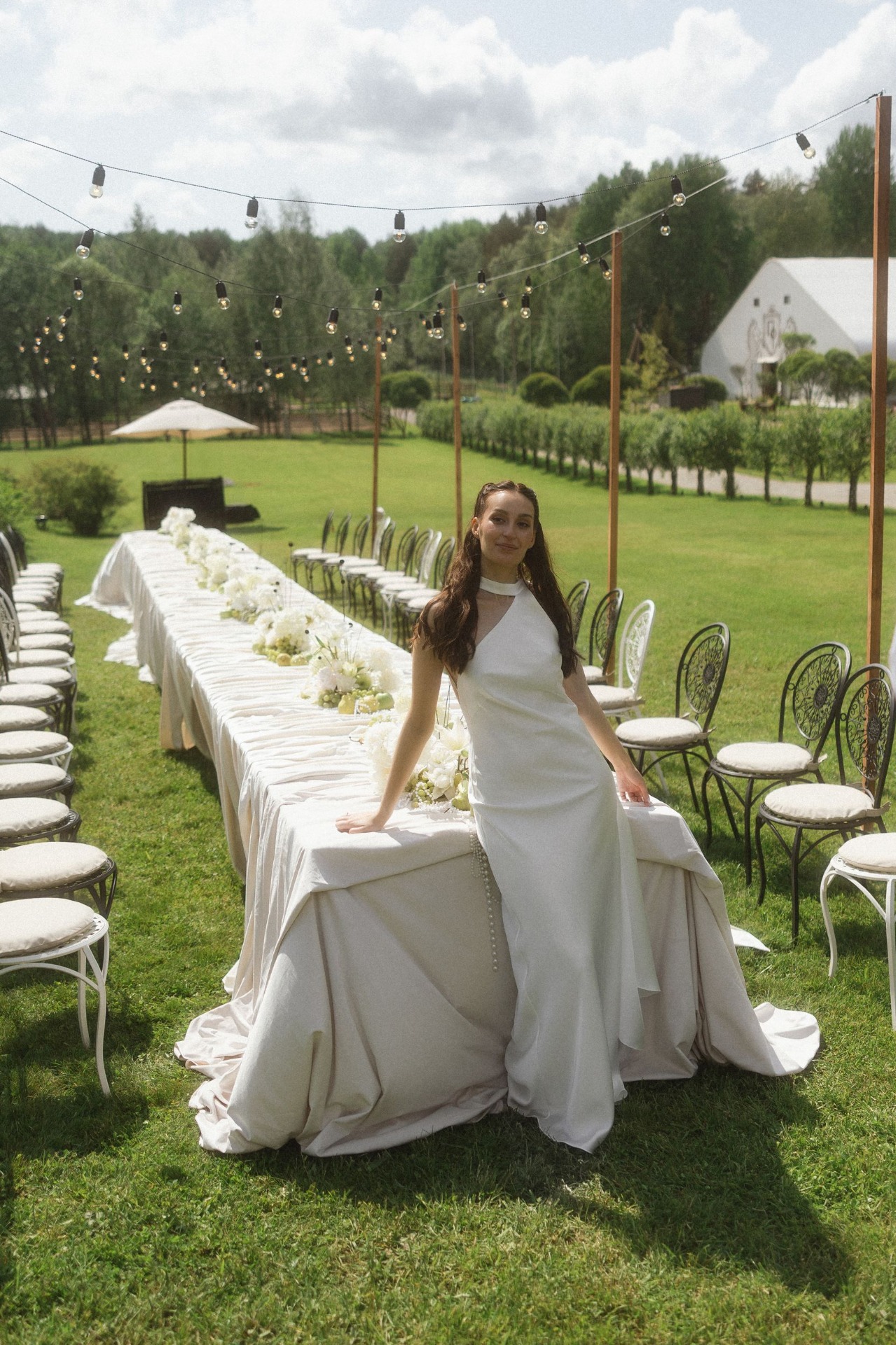 Для основного торжества невеста выбрала утончённое платье с вышивкой и декольте — лёгкое, струящееся, а длинная фата добавляла движения воздуху вокруг неё. Образ получился чистым, живым и естественно романтичным.