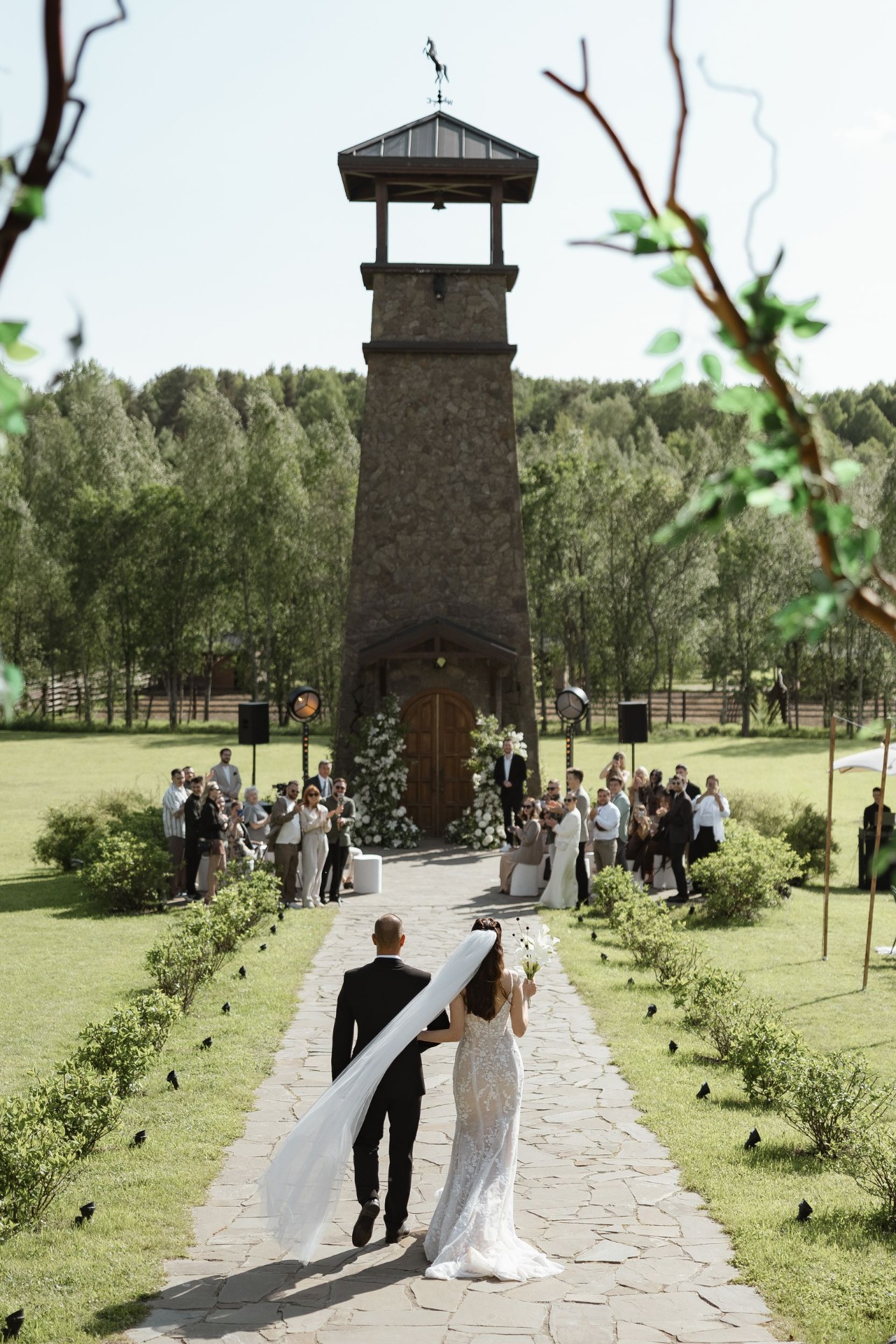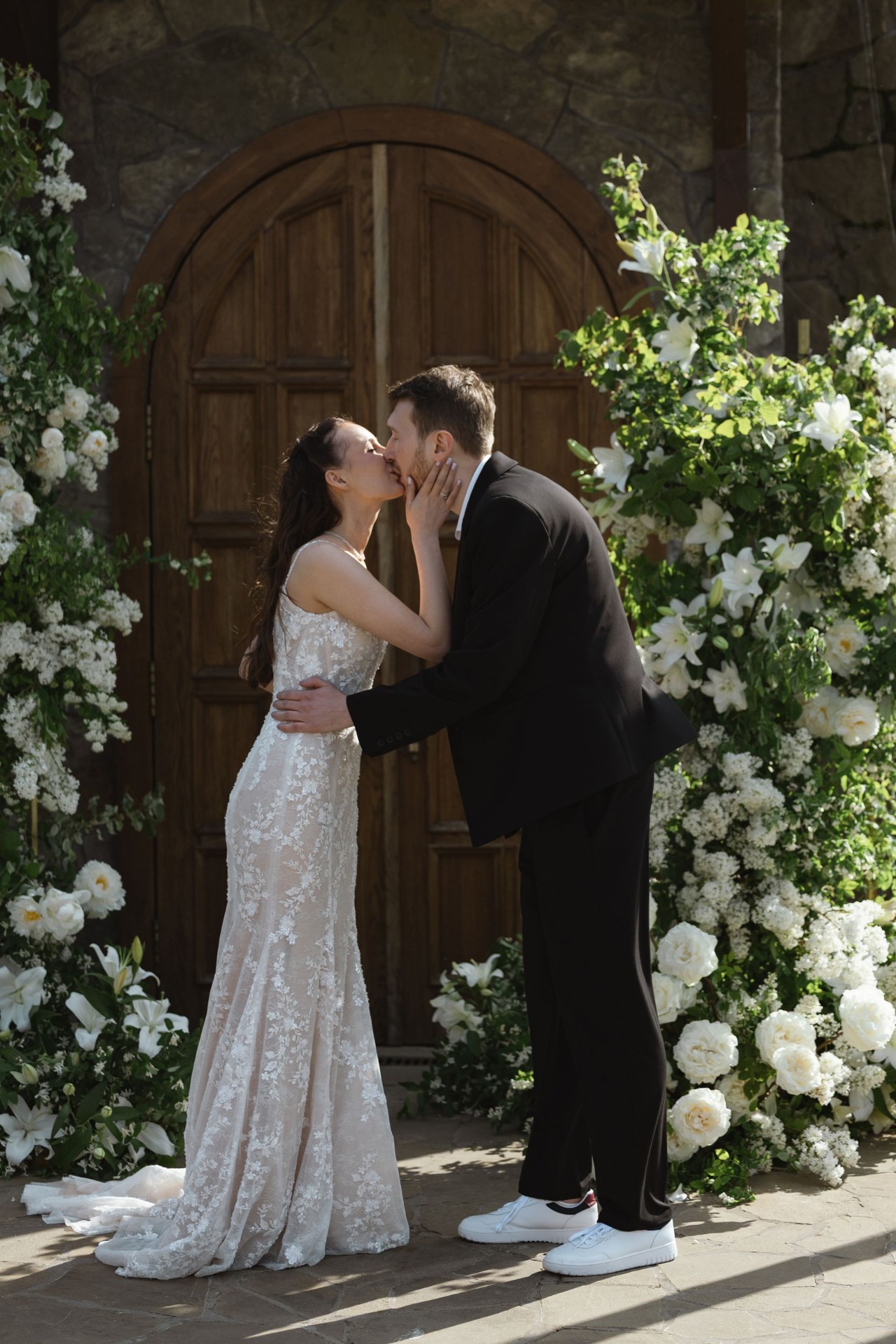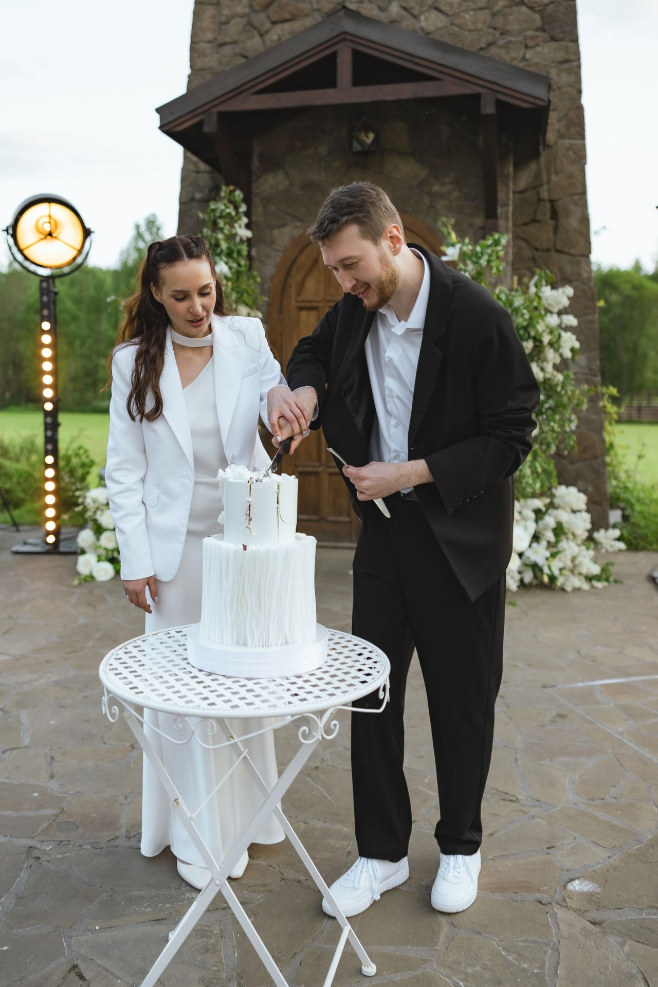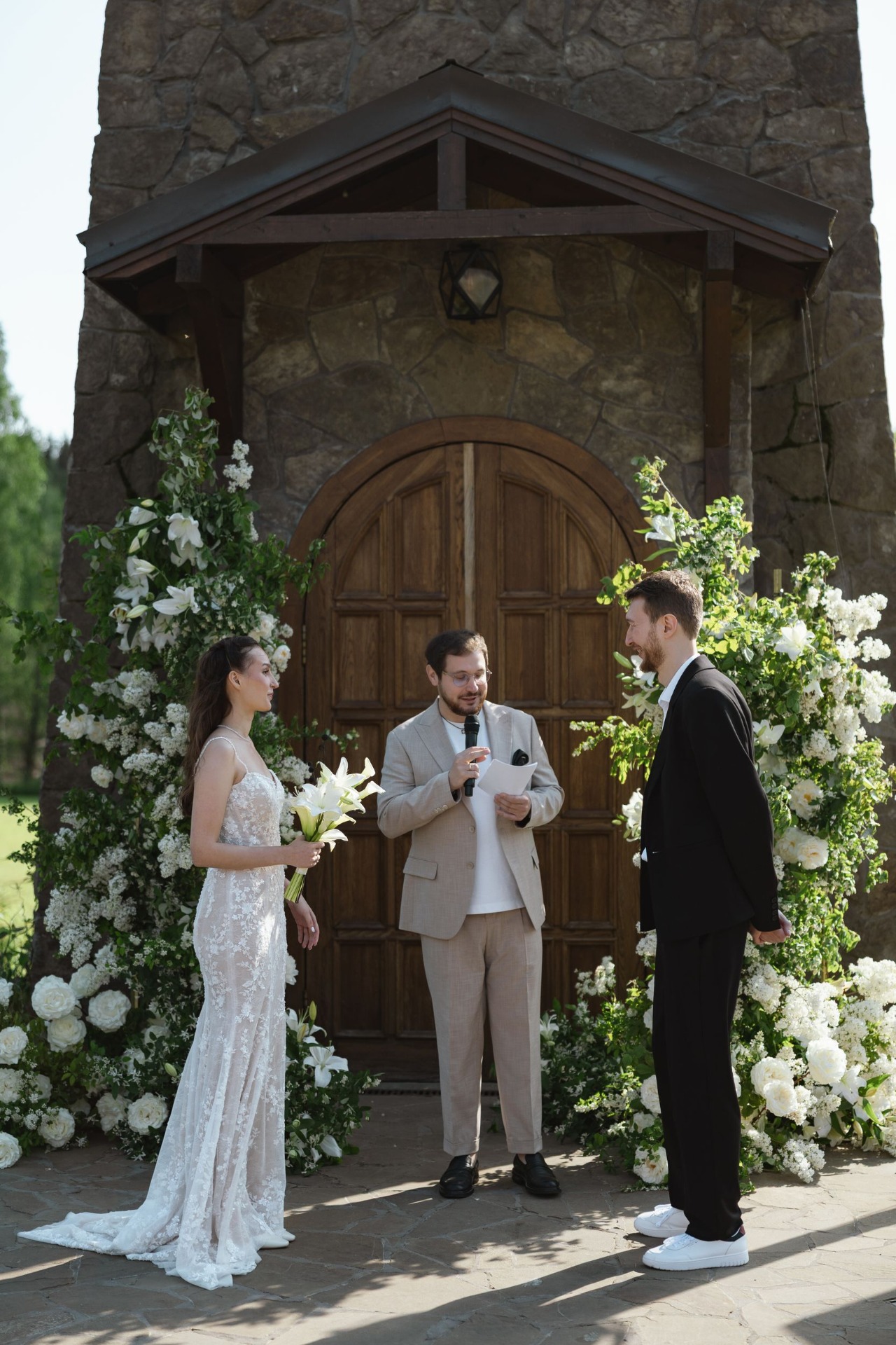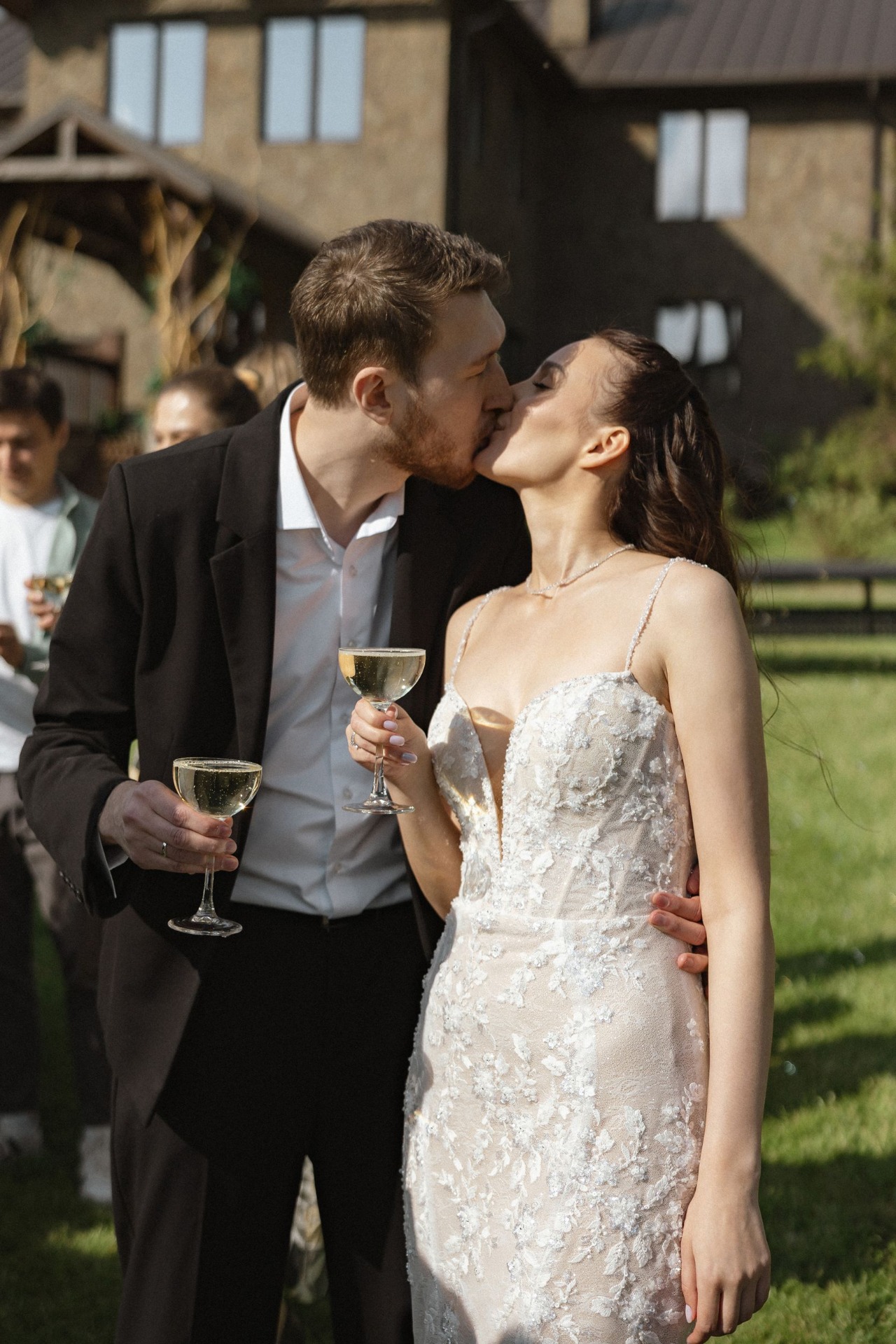 Перед церемонией невеста сменила образ, и жених увидел её только у арки. Момент получился особенно трогательным. После объявления мужем и женой ребята открыли вечер горкой игристого.