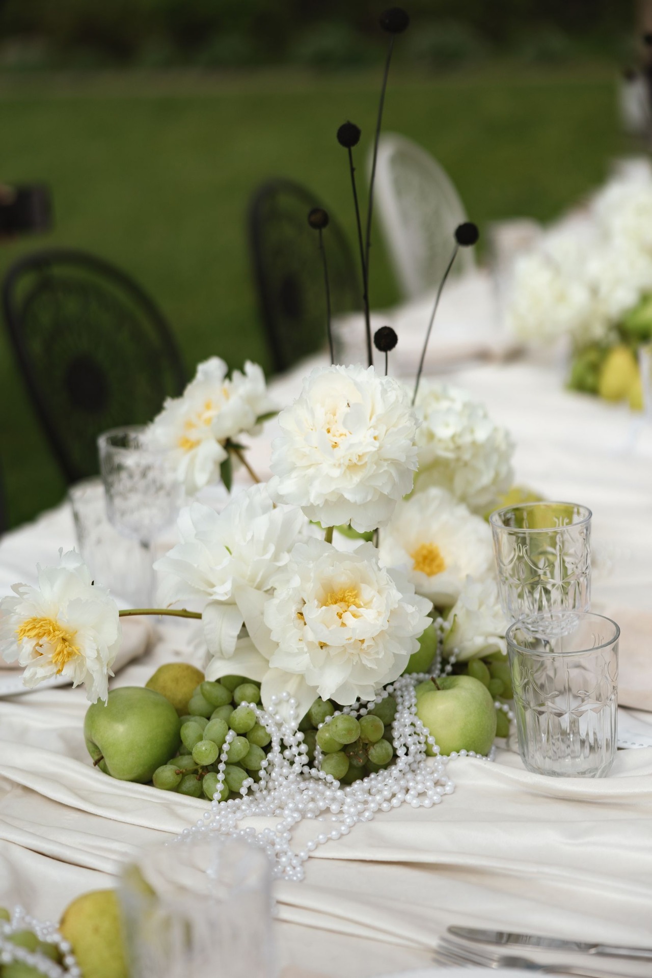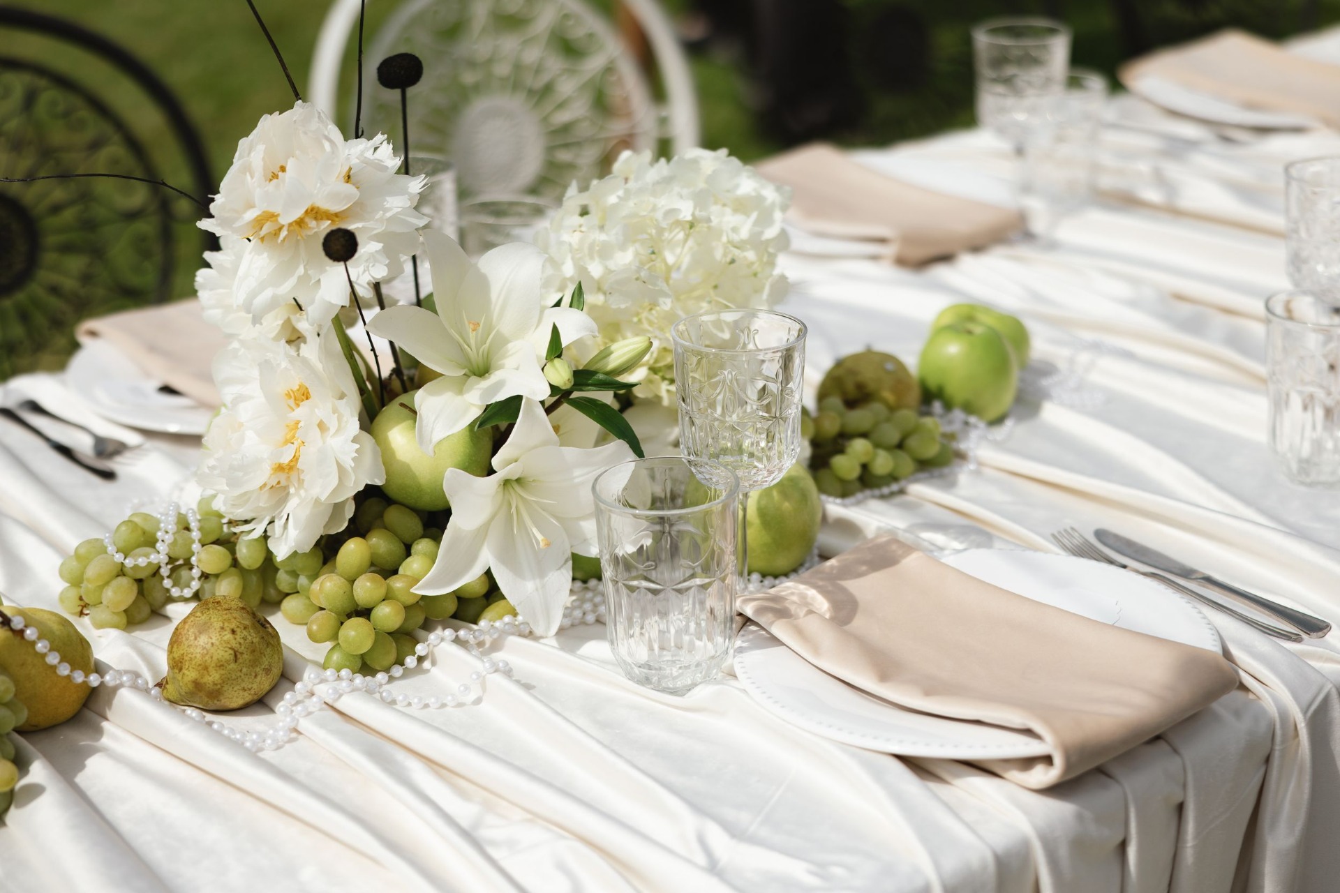 Единый длинный стол стал образом щедрого натюрморта: виноград, яблоки и груши переплелись с пионами, лилиями и чёрными акцентами. А жемчуг добавил драгоценного блеска, подчёркивая идею «ценности момента». Над столом разместились тёплые ретро-гирлянды, а у каждого гостя была карточка с сургучным оттиском и нашими инициалами.